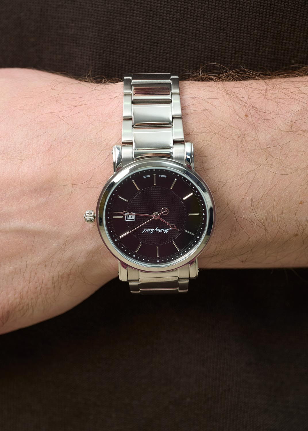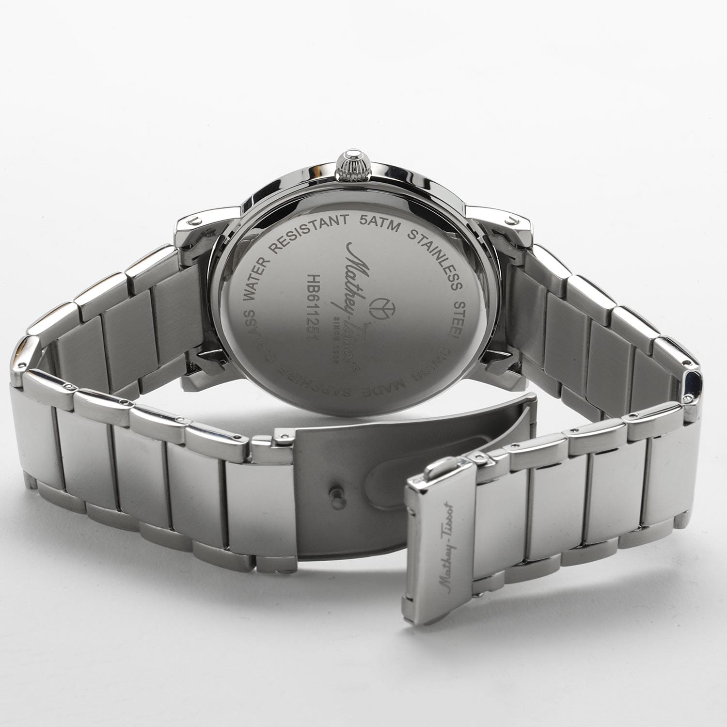 Мужские кварцевые часы Mathey-Tissot City Metal HB611251MAN — это стильное сочетание элегантности и современного дизайна. Изящный корпус выполнен из нержавеющей стали 316L серебристого цвета, диаметром 42 мм, что придаст образу элегантности и надежности. Изысканный циферблат с метками в виде штрихов придает модели особый блеск. Циферблат защищен минеральным стекломМинеральное стеклоМинеральное стекло представляет собой искусственно выращенный минерал кварца. Такое стекло отличается особой устойчивостью к повреждениям и царапинам. Уступает по некоторым качествам сапфировому стеклу. с сапфировым покрытием, обеспечивающий устойчивость к царапинам. Окошко даты находится в положении 3 часа. Часы оснащены надежным кварцевым механизмом. Стальной браслет на раскладной застёжкеРаскладная застёжкаТакой тип застёжки используется только на браслетах из металла. Она никогда не раскрывается полностью, происходит разделение на 2 и более частей. Раскладывающая застёжка снизит вероятность потери часов к минимуму., гарантирует комфортное и безопасное ношение. Класс водозащиты: 30 метров позволит защитить корпус от случайных брызг или капель дождя. Mathey-Tissot  — отличный выбор для тех, кто ценит утонченность и качество.