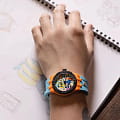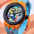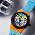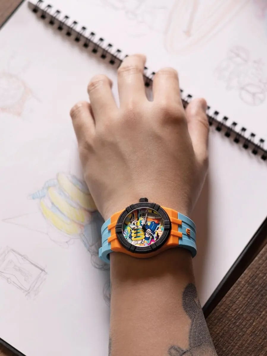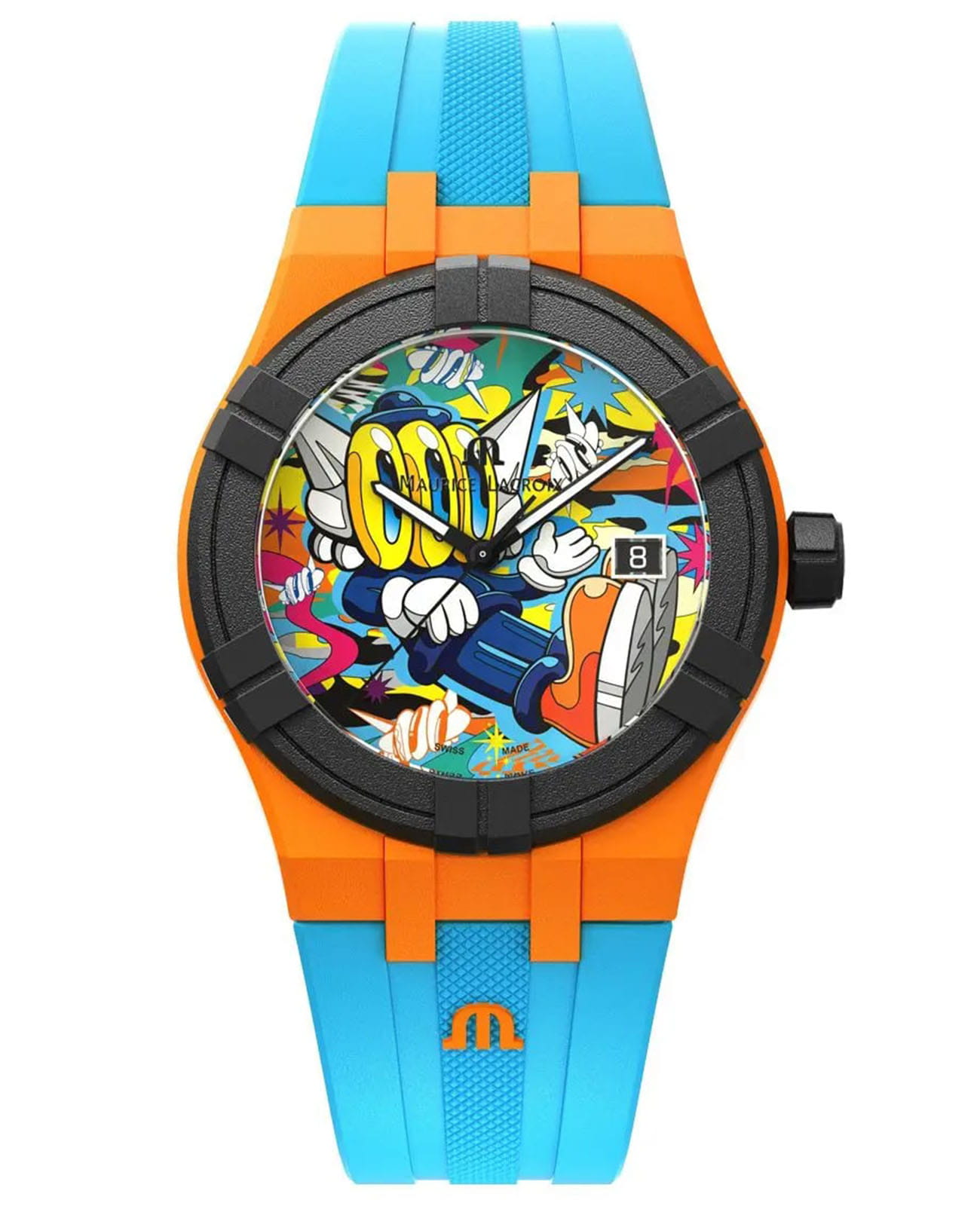 В модели AIKON #tide Benzilla яркость цвета – на максимуме! Эти часы созданы в корпусе из материала #tide диаметром 40 мм и традиционно для коллекции снабжены швейцарским кварцевым механизмом. Но не это главное! Первую скрипку в этих часах играет цвет, а циферблат украшает потрясающе яркая работа Бензиллы. На циферблате разместился частый герой произведений тайского художника, трехглазый фантастический персонаж по имени «LOOOK», любопытный пришелец из ниоткуда, живущий среди людей. БезельБезельВнешний ободок, закрепляющий стекло. В спортивных часах так называется поворотное кольцо с делениями на циферблате, выполняет роль таймера – замеряет отрезки времени на шкале. Неподвижный безель – элемент декора. Однонаправленно вращающийся безель на дайверских часах позволяет фиксировать моменты погружения и выныривания на поверхность. и заводная головка выполнены в черном цвете, а сам корпус – в ярко-оранжевом. Светло-голубой каучуковый ремешок завершает ансамбль. Владельцы часов смогут менять ремешки один на другой без использования инструментов благодаря системе Easy Strap Exchange. Мужские швейцарские кварцевые часы Maurice Lacroix Aikon Quartz AI2008-50YZA-000-0. Сапфировое стеклоСапфировое стеклоПрочный и надёжный материал из кристалла сапфира синтетического происхождения, характеризующийся особой твёрдостью и устойчивостью к царапинам и повреждениям. устойчивое к появлению царапин, обладающее высокой прозрачностью. Оранжевый циферблат. Стрелки и метки с люминесцентным покрытиемЛюминесцентное покрытиеПозволяет считывать показания времени в темноте. Производители наносят на стрелки, часовые индексы, безель или поверхность циферблата светонакопительный состав, дающий холодное свечение.. Класс водозащиты: 100 метров, позволит плавать, нырять и заниматься другими водными видами спорта. Окошко даты находится в положении 3 часов. Корпус выполнен из переработанного пластика, ранее загрязнявшего Мировой океан. Каучуковый ремешок с классической застежкой.