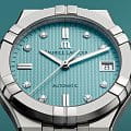 Часы Maurice Lacroix Aikon Automatic Limited Summer Edition 35 mm (AI6006-SS00F-451-C) из лимитированной коллекции отличаются элегантностью и современным стилем. Корпус диаметром 35 мм выполнен из нержавеющей стали с чередованием полированных и сатинированных поверхностей, а циферблат бирюзового цвета с узором "clous de Paris" украшен восьмью бриллиантами.