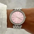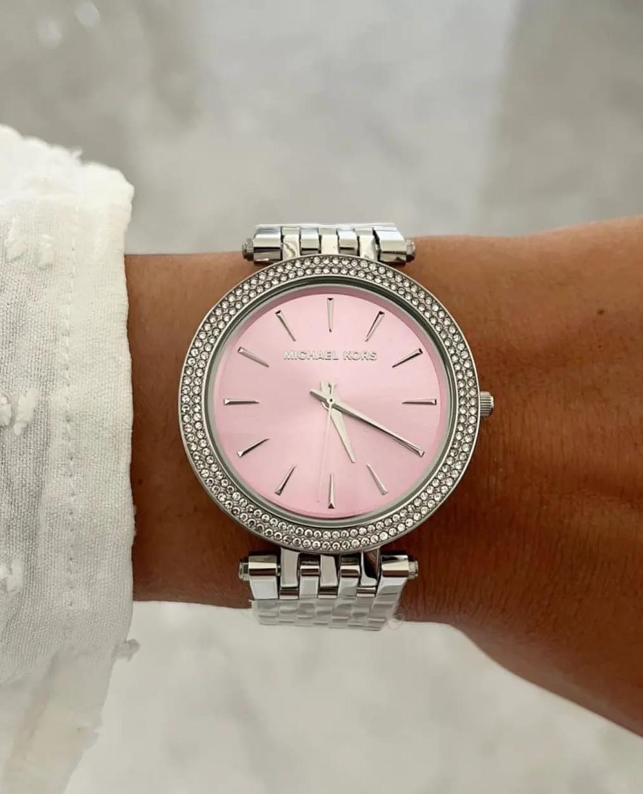 Женские американские часы Michael Kors Darci MK3352, кварцевый механизм с высокой точностью. Минеральное стеклоМинеральное стеклоМинеральное стекло представляет собой искусственно выращенный минерал кварца. Такое стекло отличается особой устойчивостью к повреждениям и царапинам. Уступает по некоторым качествам сапфировому стеклу., устойчивое к мелким механическим повреждениям. Корпус часов выполнен из нержавеющей стали. БезельБезельВнешний ободок, закрепляющий стекло. В спортивных часах так называется поворотное кольцо с делениями на циферблате, выполняет роль таймера – замеряет отрезки времени на шкале. Неподвижный безель – элемент декора. Однонаправленно вращающийся безель на дайверских часах позволяет фиксировать моменты погружения и выныривания на поверхность. украшен кристаллами. Класс водозащиты: 50 метров, позволит защитить корпус от случайных брызг или капель дождя. Стальной браслет на раскладной застёжкеРаскладная застёжкаТакой тип застёжки используется только на браслетах из металла. Она никогда не раскрывается полностью, происходит разделение на 2 и более частей. Раскладывающая застёжка снизит вероятность потери часов к минимуму..