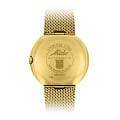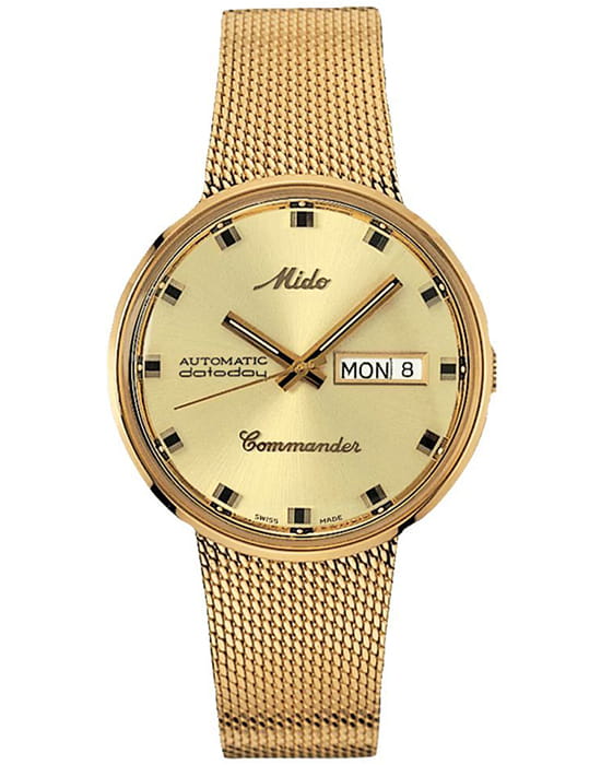 Циферблат с фирменным логотипом Mido 1950-х годов украшен накладными индексами и стрелками  с люминесцентным покрытиемЛюминесцентное покрытиеПозволяет считывать показания времени в темноте. Производители наносят на стрелки, часовые индексы, безель или поверхность циферблата светонакопительный состав, дающий холодное свечение., обеспечивающим читаемость даже в условиях слабого освещения. На «3 часах» расположено двойное окошко календаря — день недели и дата. Стальной браслет миланского плетения с PVD-покрытиемPVDУльтратонкое покрытие наносится в технике вакуумного напыления, сочетает в себе нитрид титана особой прочности со слоем золота или оксида хрома. Несёт в себе декоративную или защитную функцию. на раскладном замкеРаскладной замокДанный вариант застежки используется только на часах с металлическим браслетом. Отличительная особенность такого крепления в том, что длина браслета становится универсальной и вы можете самостоятельно отрегулировать нужный вам размер – застежка просто двигается по браслету часов..Модель защищена акриловым стеклом, сохраняющим аутентичный винтажный характер. Прозрачная задняя крышка открывает вид на автоматический механизм с автоподзаводом и 80-часовым запасом хода.