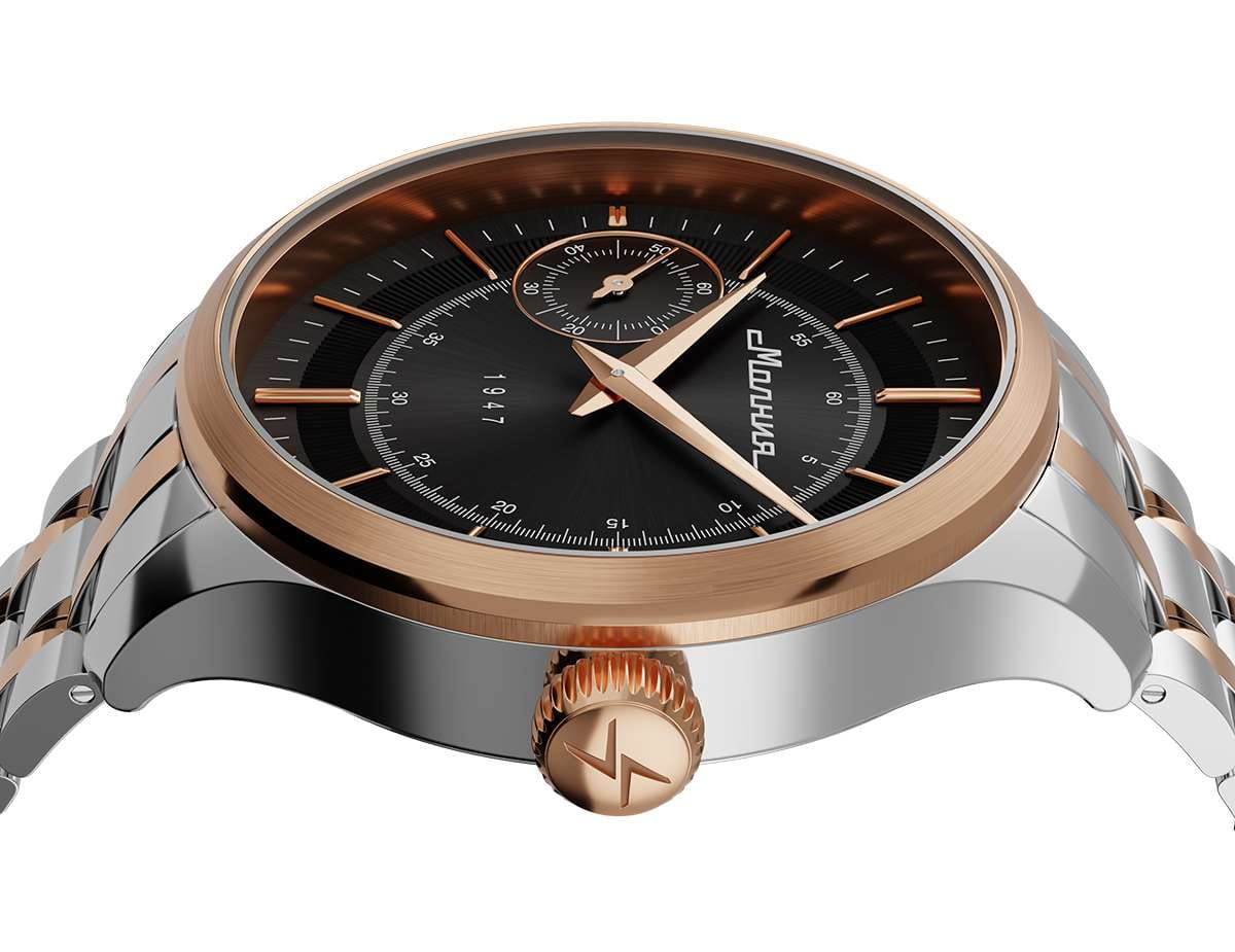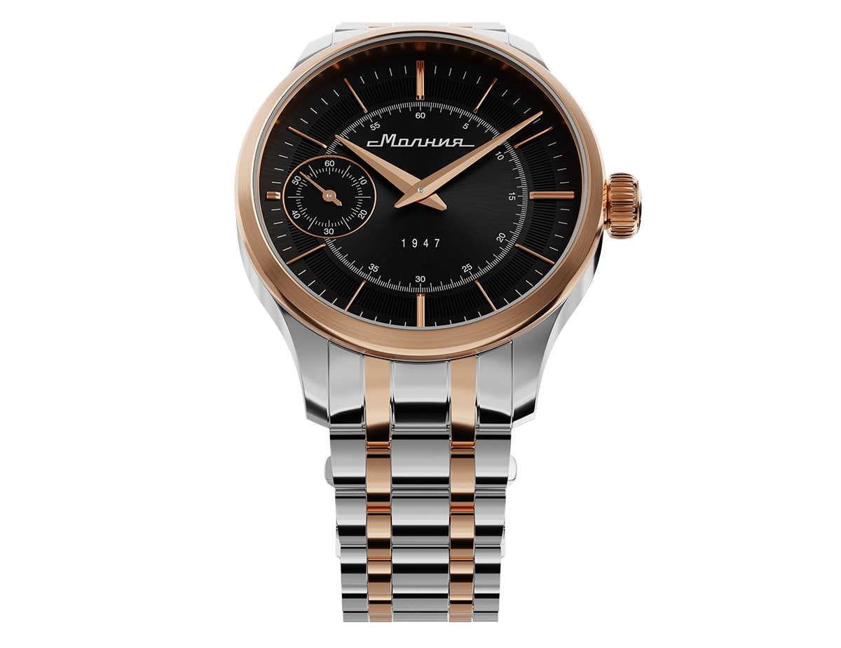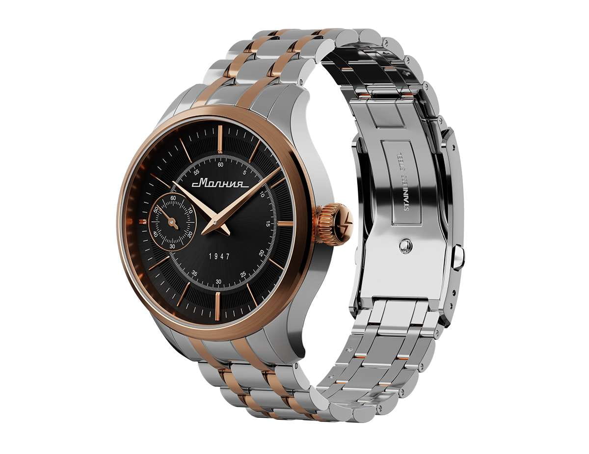 Мужские механические часы с ручным подзаводом — это аксессуар от легендарного бренда «МОЛНИЯ», созданный на Челябинском часовом заводе. Корпус диаметром 41 мм выполнен из нержавеющей стали 316L. БезельБезельВнешний ободок, закрепляющий стекло. В спортивных часах так называется поворотное кольцо с делениями на циферблате, выполняет роль таймера – замеряет отрезки времени на шкале. Неподвижный безель – элемент декора. Однонаправленно вращающийся безель на дайверских часах позволяет фиксировать моменты погружения и выныривания на поверхность. выполнен из стали с PVD-покрытиемPVDУльтратонкое покрытие наносится в технике вакуумного напыления, сочетает в себе нитрид титана особой прочности со слоем золота или оксида хрома. Несёт в себе декоративную или защитную функцию. и зеркальной отделкой. Циферблат чёрного цвета оформлен индексами и стрелками. Малая секундная стрелка вынесена на позицию 9 часов. Циферблат защищён сапфировым стекломСапфировое стеклоПрочный и надёжный материал из кристалла сапфира синтетического происхождения, характеризующийся особой твёрдостью и устойчивостью к царапинам и повреждениям. толщиной 2 мм. Механизм — мануфактурный калибр 3603, собранный вручную, с запасом хода до 40 часов. Прозрачная задняя крышка позволяет наблюдать за работой механизма. Часы оснащены стальным браслетом с частичным PVD-покрытиемPVDУльтратонкое покрытие наносится в технике вакуумного напыления, сочетает в себе нитрид титана особой прочности со слоем золота или оксида хрома. Несёт в себе декоративную или защитную функцию. под золото и системой быстрой замены на раскладной застёжкеРаскладная застёжкаТакой тип застёжки используется только на браслетах из металла. Она никогда не раскрывается полностью, происходит разделение на 2 и более частей. Раскладывающая застёжка снизит вероятность потери часов к минимуму. типа клипса. Водонепроницаемость 50 м позволяет использовать часы в повседневных условиях. Идеальный выбор для тех, кто ценит российское качество и традиции.