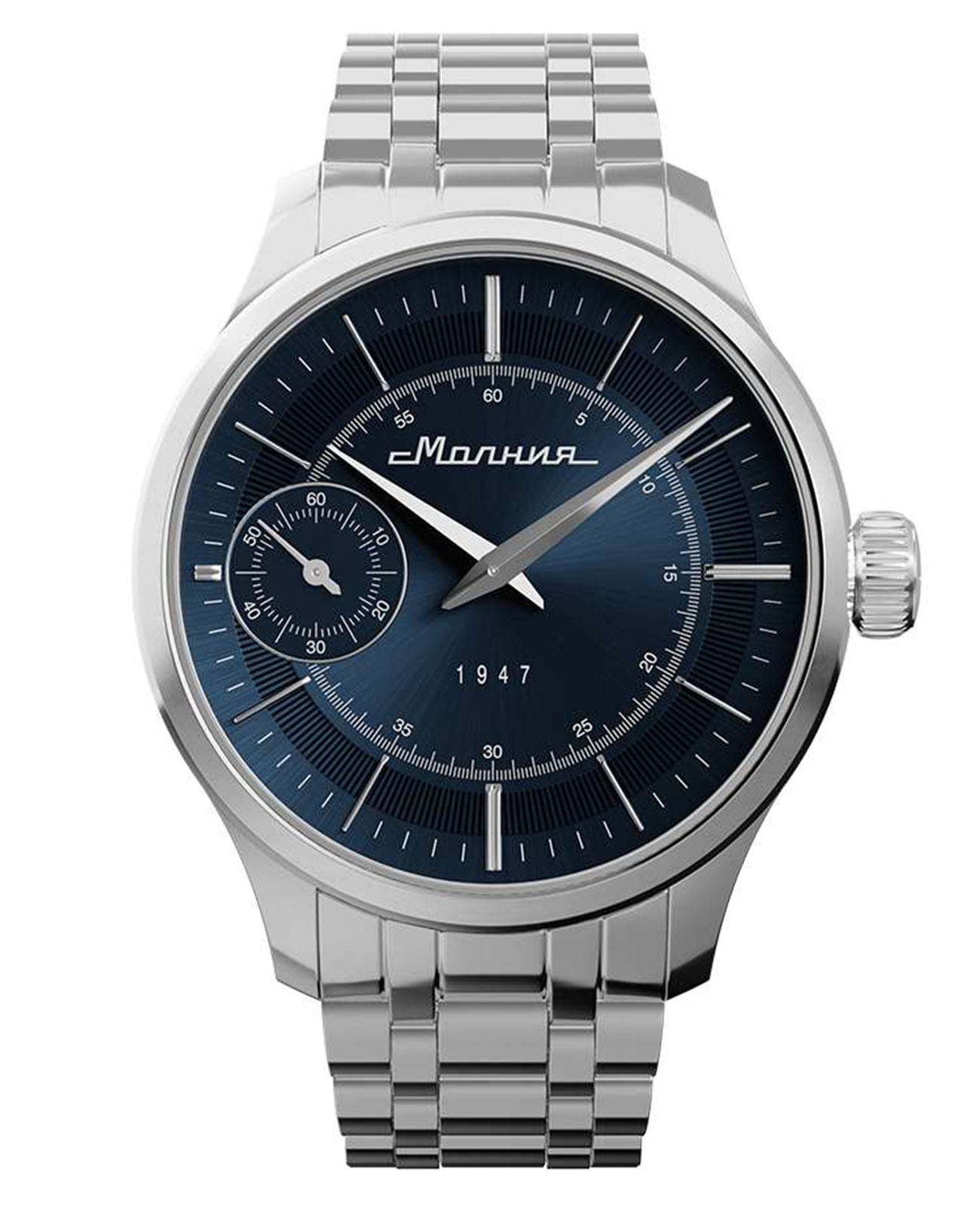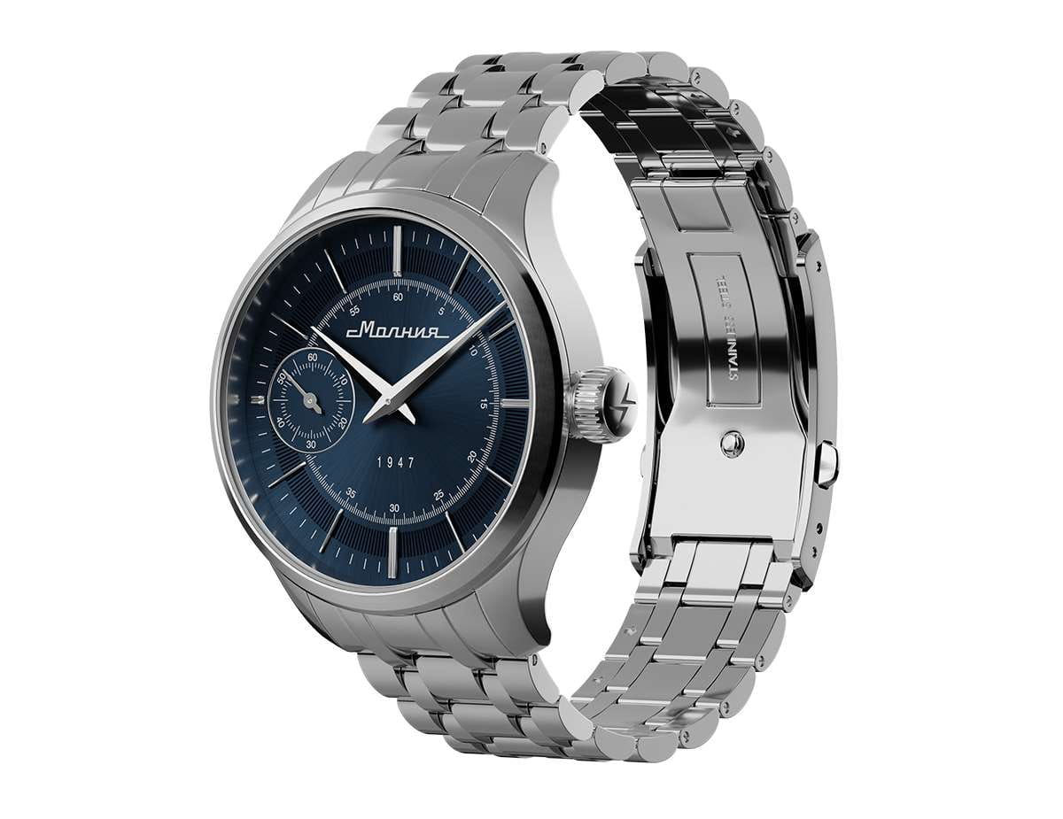 Мужские механические часы с ручным подзаводом — это аксессуар от легендарного бренда «МОЛНИЯ», созданный на Челябинском часовом заводе. Корпус диаметром 41 мм выполнен из нержавеющей стали 316L с зеркальной полировкой. БезельБезельВнешний ободок, закрепляющий стекло. В спортивных часах так называется поворотное кольцо с делениями на циферблате, выполняет роль таймера – замеряет отрезки времени на шкале. Неподвижный безель – элемент декора. Однонаправленно вращающийся безель на дайверских часах позволяет фиксировать моменты погружения и выныривания на поверхность. также выполнен из стали с зеркальной отделкой. Циферблат синего цвета оформлен индексами и стрелками. Малая секундная стрелка вынесена на позицию 9 часов. Циферблат защищён сапфировым стекломСапфировое стеклоПрочный и надёжный материал из кристалла сапфира синтетического происхождения, характеризующийся особой твёрдостью и устойчивостью к царапинам и повреждениям. толщиной 2 мм. Механизм — мануфактурный калибр 3603, собранный вручную, с запасом хода до 40 часов. Прозрачная задняя крышка позволяет наблюдать за работой механизма. Часы оснащены стальным браслетом с раскладной застёжкойРаскладная застёжкаТакой тип застёжки используется только на браслетах из металла. Она никогда не раскрывается полностью, происходит разделение на 2 и более частей. Раскладывающая застёжка снизит вероятность потери часов к минимуму. с кнопочным открытием и системой быстрой замены. Водонепроницаемость 50 м позволяет использовать часы в повседневных условиях. Идеальный выбор для тех, кто ценит российское качество и традиции.