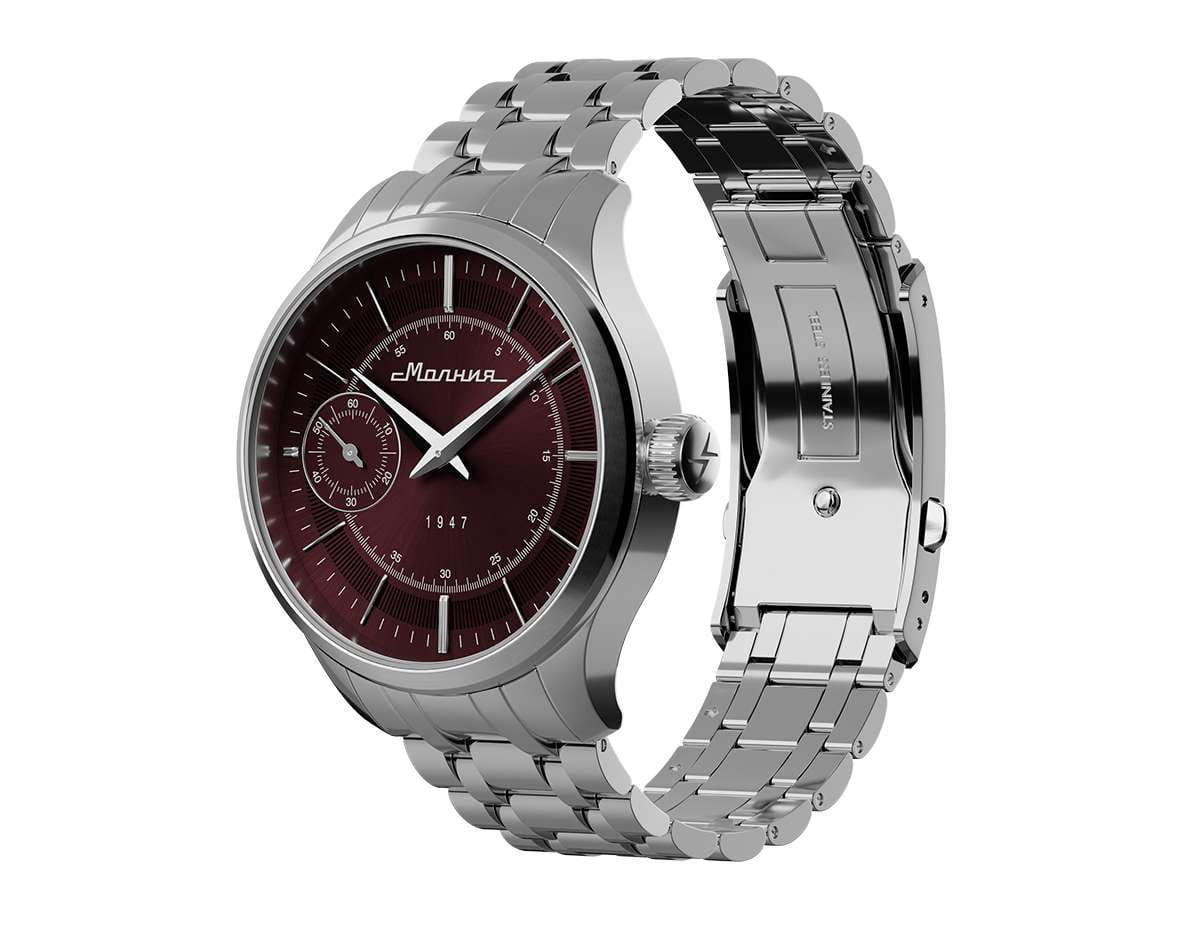 Мужские механические часы с ручным подзаводом — это аксессуар от легендарного бренда «МОЛНИЯ», созданный на Челябинском часовом заводе. Корпус диаметром 41 мм выполнен из нержавеющей стали 316L с зеркальной полировкой. БезельБезельВнешний ободок, закрепляющий стекло. В спортивных часах так называется поворотное кольцо с делениями на циферблате, выполняет роль таймера – замеряет отрезки времени на шкале. Неподвижный безель – элемент декора. Однонаправленно вращающийся безель на дайверских часах позволяет фиксировать моменты погружения и выныривания на поверхность. также выполнен из стали с зеркальной отделкой. Циферблат красного цвета оформлен индексами и стрелками. Малая секундная стрелка вынесена на позицию 9 часов. Циферблат защищён сапфировым стекломСапфировое стеклоПрочный и надёжный материал из кристалла сапфира синтетического происхождения, характеризующийся особой твёрдостью и устойчивостью к царапинам и повреждениям. толщиной 2 мм. Механизм — мануфактурный калибр 3603, собранный вручную, с запасом хода до 40 часов. Прозрачная задняя крышка позволяет наблюдать за работой механизма. Часы оснащены стальным браслетом с раскладной застёжкойРаскладная застёжкаТакой тип застёжки используется только на браслетах из металла. Она никогда не раскрывается полностью, происходит разделение на 2 и более частей. Раскладывающая застёжка снизит вероятность потери часов к минимуму. с кнопочным открытием и системой быстрой замены. Водонепроницаемость 50 м позволяет использовать часы в повседневных условиях. Идеальный выбор для тех, кто ценит российское качество и традиции.