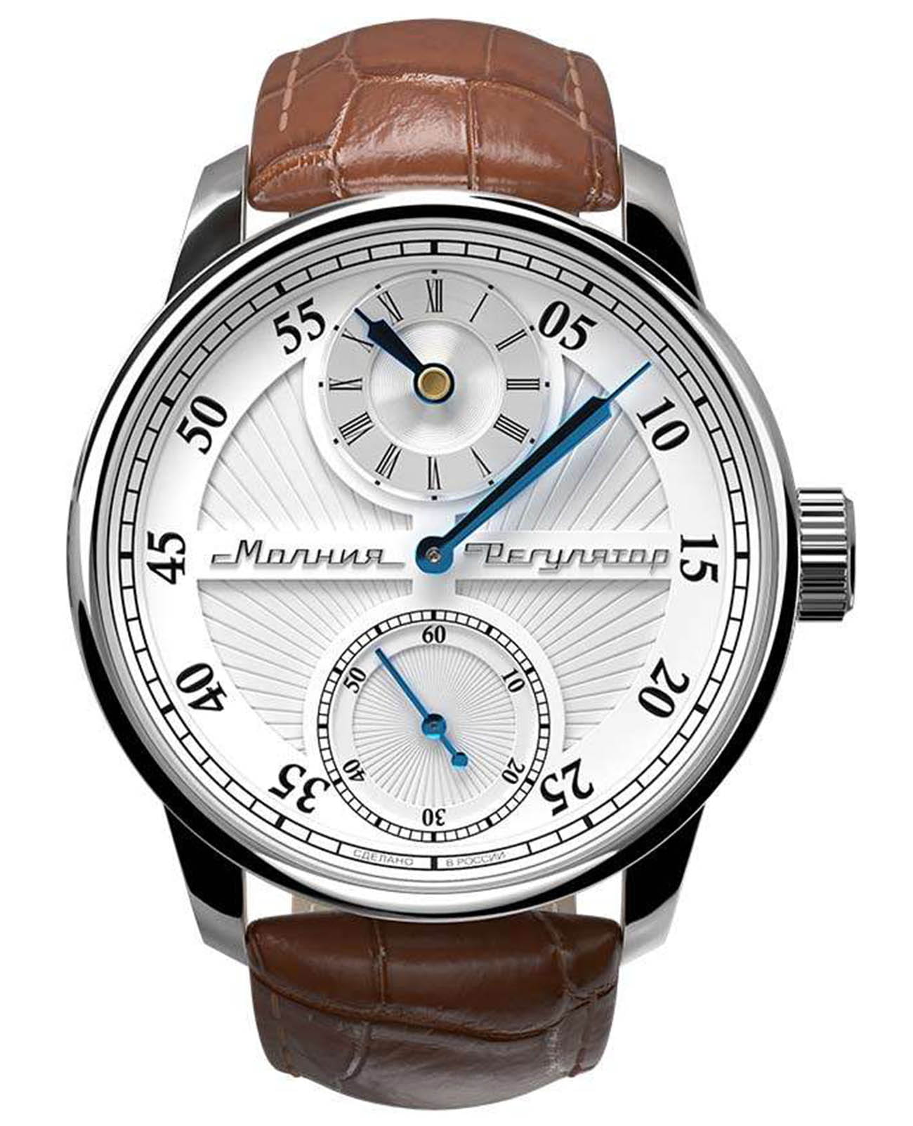Мужские механические часы с ручным подзаводом — это аксессуар от легендарного бренда «МОЛНИЯ», созданный на Челябинском часовом заводе. Корпус диаметром 42 мм выполнен из нержавеющей стали. Циферблат оформлен индексами и стрелками. Малая секундная стрелка вынесена на отдельный субциферблат. Циферблат защищён сапфировым стекломСапфировое стеклоПрочный и надёжный материал из кристалла сапфира синтетического происхождения, характеризующийся особой твёрдостью и устойчивостью к царапинам и повреждениям.. Механизм — мануфактурный калибр 3603RS, полностью собранный вручную, с декорированными деталями, которые видны через прозрачную заднюю крышку. Часы оснащены кожаным ремешком коричневого цвета с раскладной застёжкойРаскладная застёжкаТакой тип застёжки используется только на браслетах из металла. Она никогда не раскрывается полностью, происходит разделение на 2 и более частей. Раскладывающая застёжка снизит вероятность потери часов к минимуму.. Водонепроницаемость 100 м позволяет использовать часы для плавания и повседневного ношения. Идеальный выбор для тех, кто ценит российское качество и традиции.
