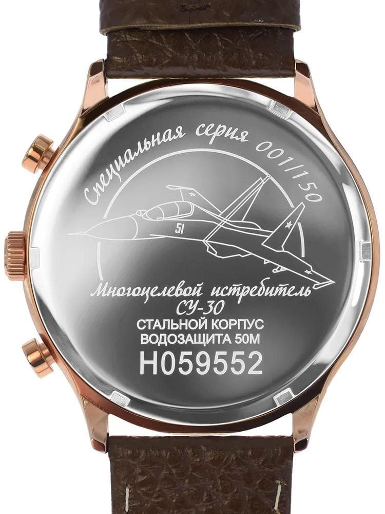 Ремешок выполнен из комбинации кожи и текстиля, обеспечивая комфорт при носке и добавляя модели уникальный внешний вид.  Толщина корпуса составляет 13 мм, что придаёт часам солидный вид.