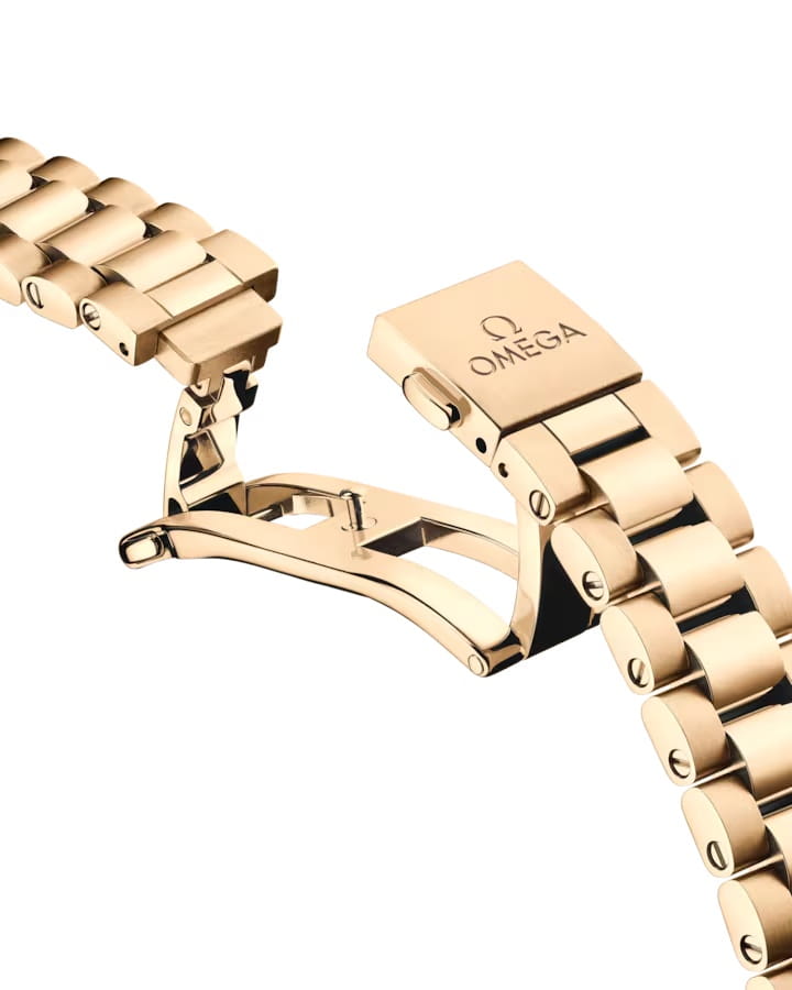 Omega Seamaster Aqua Terra выполнены в симметричном корпусе из 18K Moonshine™ золота с завинчивающейся задней крышкой, украшенной волновым узором. Циферблат дополнен окошком даты на 6 часах и оформлен с применением технологии sun-brushed с PVD-покрытием, напоминающим гладь воды. Стрелки и метки выполнены из 18K Moonshine™ золота и оснащены люминесцентным покрытиемЛюминесцентное покрытиеПозволяет считывать показания времени в темноте. Производители наносят на стрелки, часовые индексы, безель или поверхность циферблата светонакопительный состав, дающий холодное свечение. Super-LumiNova голубого цвета для лучшей читаемости в темноте. Калибр Omega 8801 сертифицирован как Master Chronometer — гарантия высочайшей точности и устойчивости к магнитным полям. Запас хода составляет 55 часов. Защиту циферблата обеспечивает сапфировое стеклоСапфировое стеклоПрочный и надёжный материал из кристалла сапфира синтетического происхождения, характеризующийся особой твёрдостью и устойчивостью к царапинам и повреждениям. с антибликовым покрытиемАнтибликовое покрытиеСлой оксида металла в 0,13-0,3 микрон, благодаря которому стекло часов не бликует и не отражает свет. Антибликовое покрытие уменьшает отражение света в 10 раз, обеспечивая отличную читаемость показателей циферблата. с обеих сторон. Водозащита позволяет использовать часы в воде без риска повреждения. Часы установлены на интегрированный браслет с полированными центральными и матовыми внешними звеньями. Это сочетание премиального качества, технологичности и классического дизайна.