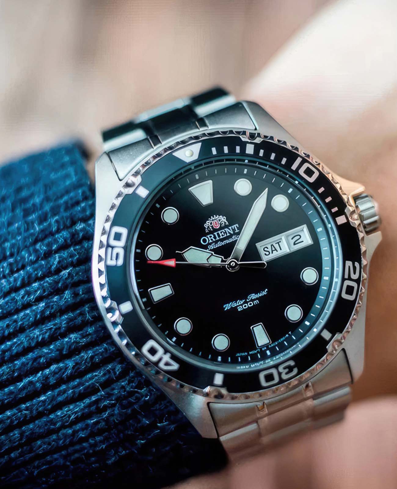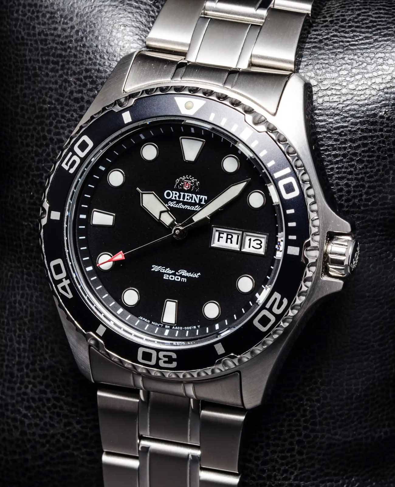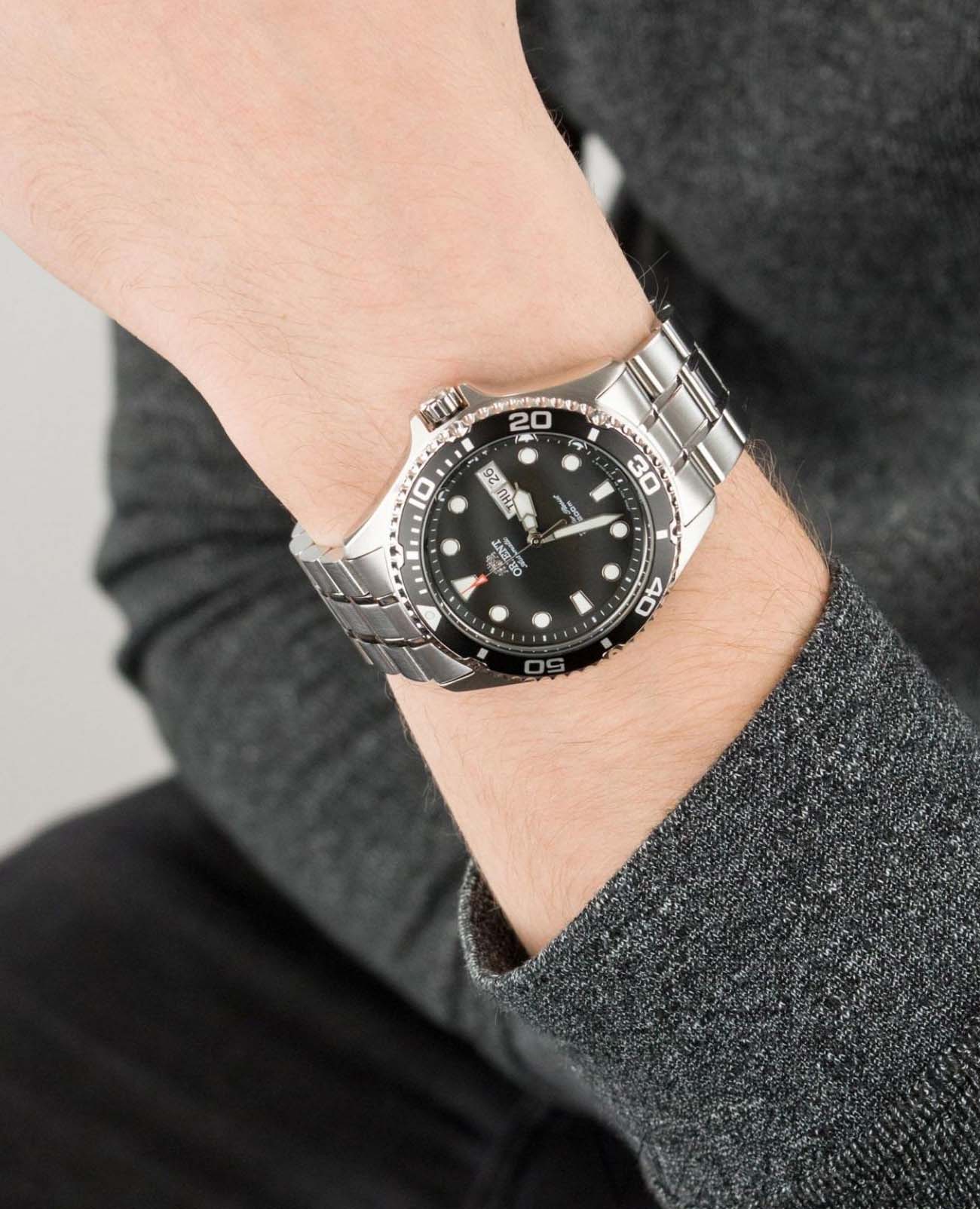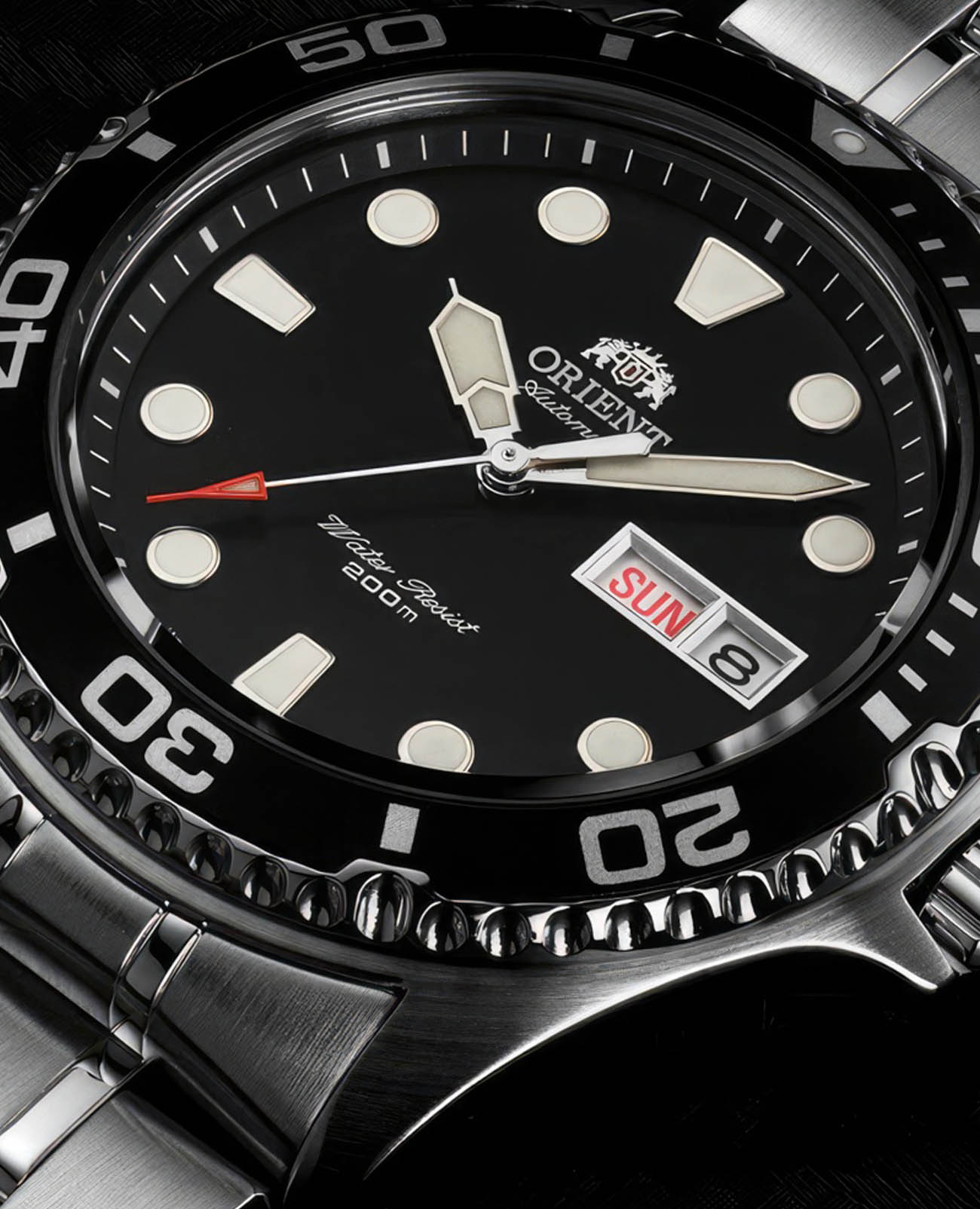 Часы Orient Ray II AA02004B — стильный и надежный выбор для современных мужчин. Корпус из высококачественной нержавеющей стали защищен Минеральным стекломМинеральное стеклоМинеральное стекло представляет собой искусственно выращенный минерал кварца. Такое стекло отличается особой устойчивостью к повреждениям и царапинам. Уступает по некоторым качествам сапфировому стеклу., устойчивым к царапинам и повреждениям. Черный циферблат с крупными метками и стрелками, покрытыми Люминесцентным покрытиемЛюминесцентное покрытиеПозволяет считывать показания времени в темноте. Производители наносят на стрелки, часовые индексы, безель или поверхность циферблата светонакопительный состав, дающий холодное свечение., обеспечивает идеальную читаемость в любых условиях, включая полное отсутствие света. Часы оснащены автоматическим механизмом Orient Calibre F6922, который поддерживает ручной завод и функцию остановки секундной стрелки для высокой точности настройки времени. Однонаправленный БезельБезельВнешний ободок, закрепляющий стекло. В спортивных часах так называется поворотное кольцо с делениями на циферблате, выполняет роль таймера – замеряет отрезки времени на шкале. Неподвижный безель – элемент декора. Однонаправленно вращающийся безель на дайверских часах позволяет фиксировать моменты погружения и выныривания на поверхность. позволяет отслеживать время погружений, подчеркивая их спортивный характер. Металлический браслет дополняется классической застежкой с фиксатором, обеспечивающей надежность и удобство при ношении. Водонепроницаемость до 200 метров делает эту модель идеальной как для активного отдыха, так и для профессионального использования под водой. Orient Ray II FAA02004B9 — это часы, которые сочетают функциональность и элегантность, подчеркивая вкус и стиль своего владельца.