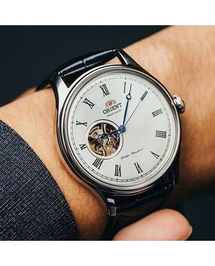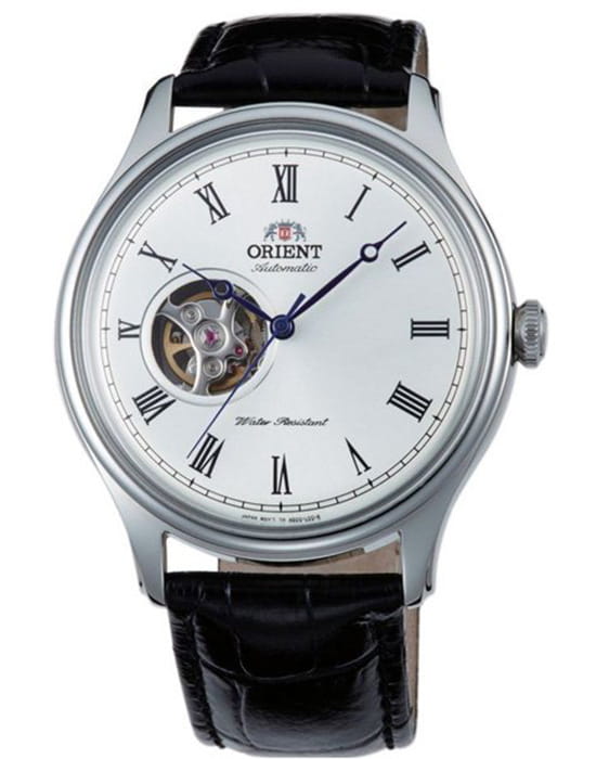Orient Classic Open Heart AG00003W — изысканные классические часы, сочетающие элегантный стиль и высокую точность механики. Корпус диаметром 43 мм выполнен из нержавеющей стали с полированной отделкой, что придаёт модели благородный и утончённый вид. Белый циферблат с солнечным узором украшен римскими цифрами и изящными синими стрелками в стиле «бреге», обеспечивая превосходную читаемость. Окошко «Open Heart» на отметке 9 часов позволяет наблюдать за работой механизма, придавая модели сложность и индивидуальность. Защитное минеральное стеклоМинеральное стеклоМинеральное стекло представляет собой искусственно выращенный минерал кварца. Такое стекло отличается особой устойчивостью к повреждениям и царапинам. Уступает по некоторым качествам сапфировому стеклу. с выпуклой формой усиливает классический облик часов и защищает их от повреждений. Внутри установлен автоматический механизм Orient калибра F6T22 с возможностью ручного подзавода и функцией стоп-секунды, обеспечивающий точность хода и запас энергии до 40 часов. Модель комплектуется чёрным кожаным ремешком с тиснением под крокодила, а классическая застёжка гарантирует удобную фиксацию на запястье. Водонепроницаемость 50 метров защищает часы от брызг и кратковременного контакта с водой, делая их отличным выбором для повседневного использования.