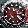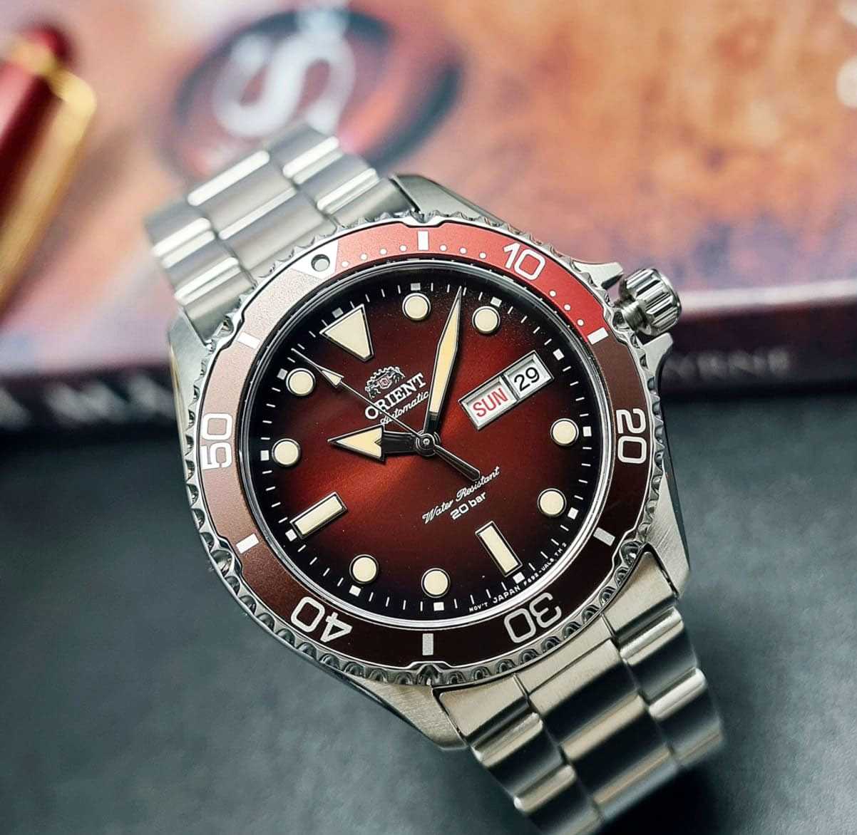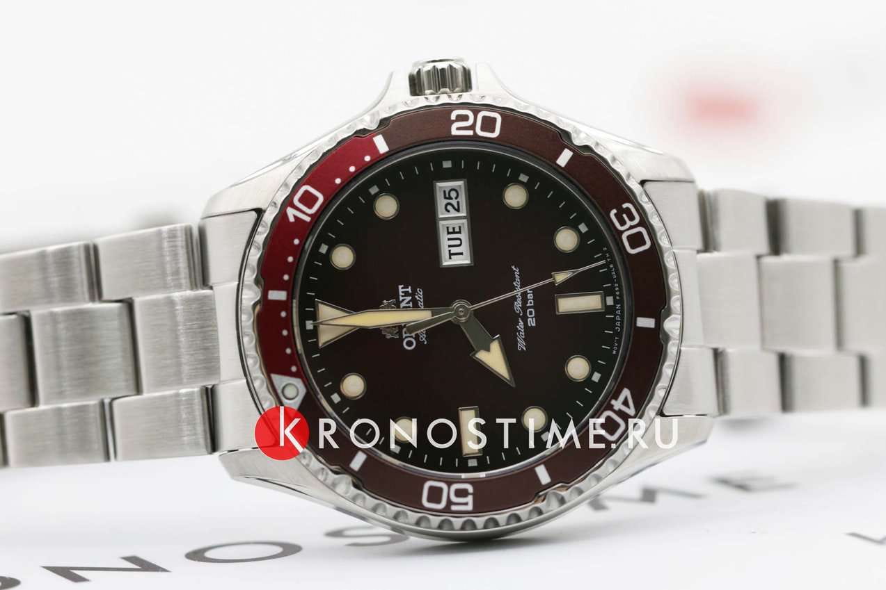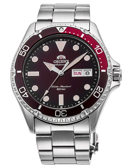 Orient Kamasu RA-AA0814R — стильные и надёжные часы, созданные для активного образа жизни и водных приключений. Корпус диаметром 41,8 мм выполнен из нержавеющей стали, что обеспечивает прочность и долговечность. Однонаправленный вращающийся безельБезельВнешний ободок, закрепляющий стекло. В спортивных часах так называется поворотное кольцо с делениями на циферблате, выполняет роль таймера – замеряет отрезки времени на шкале. Неподвижный безель – элемент декора. Однонаправленно вращающийся безель на дайверских часах позволяет фиксировать моменты погружения и выныривания на поверхность. с 60-минутной шкалой позволяет точно отслеживать время погружения. Красный циферблат с эффектом солнечных лучей украшен накладными часовыми индексами и стрелками с люминесцентным покрытиемЛюминесцентное покрытиеПозволяет считывать показания времени в темноте. Производители наносят на стрелки, часовые индексы, безель или поверхность циферблата светонакопительный состав, дающий холодное свечение., что гарантирует отличную читаемость в любых условиях. Окошки даты и дня недели расположены на отметке «3 часа» для удобства. Защиту циферблата обеспечивает сапфировое стеклоСапфировое стеклоПрочный и надёжный материал из кристалла сапфира синтетического происхождения, характеризующийся особой твёрдостью и устойчивостью к царапинам и повреждениям., устойчивое к царапинам. Внутри установлен автоматический механизм Orient калибра F6922 с 22 камнями, обеспечивающий точность хода и запас энергии до 40 часов. Механизм поддерживает автоподзавод, ручной завод и стоп-секунду. Часы укомплектованы браслетом из нержавеющей стали, а раскладная застёжкаРаскладная застёжкаТакой тип застёжки используется только на браслетах из металла. Она никогда не раскрывается полностью, происходит разделение на 2 и более частей. Раскладывающая застёжка снизит вероятность потери часов к минимуму. гарантирует надёжную фиксацию на запястье. Водонепроницаемость 200 метров делает модель отличным выбором для дайвинга и активного отдыха.
