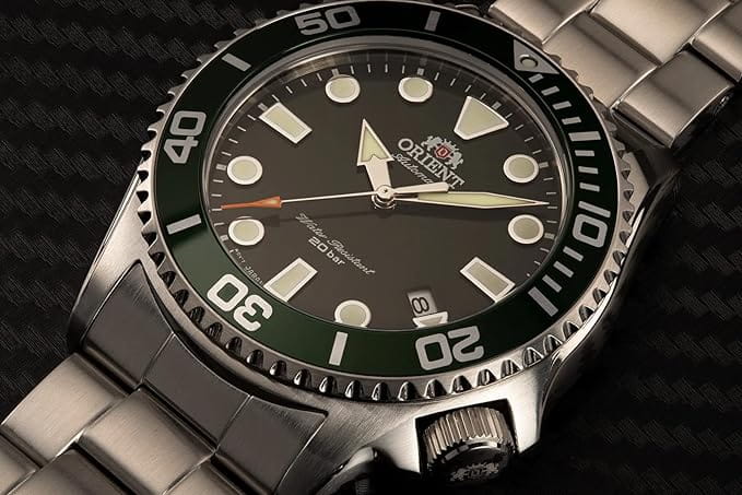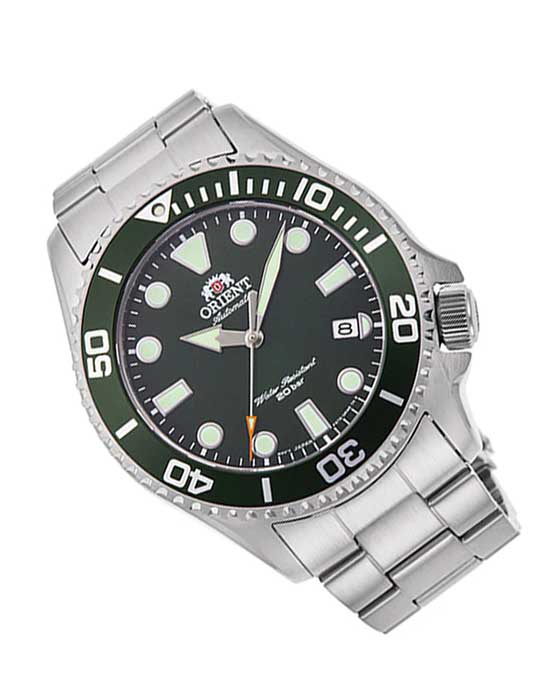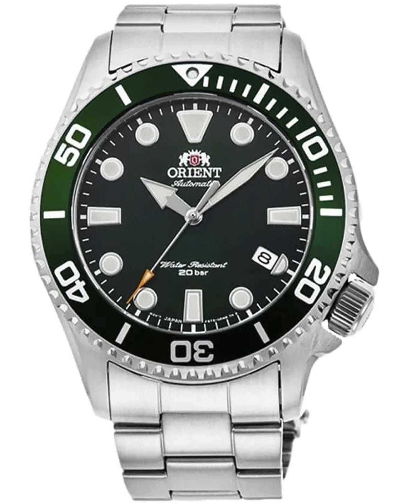 Мужские механические часы с автоподзаводом Orient Automatic RA-AC0K02E. Сапфировое стеклоСапфировое стеклоПрочный и надёжный материал из кристалла сапфира синтетического происхождения, характеризующийся особой твёрдостью и устойчивостью к царапинам и повреждениям. устойчивое к появлению царапин, обладающее высокой прозрачностью. Корпус из нержавеющей стали. Вращающийся безельБезельВнешний ободок, закрепляющий стекло. В спортивных часах так называется поворотное кольцо с делениями на циферблате, выполняет роль таймера – замеряет отрезки времени на шкале. Неподвижный безель – элемент декора. Однонаправленно вращающийся безель на дайверских часах позволяет фиксировать моменты погружения и выныривания на поверхность. из нержавеющей стали с PVDPVDУльтратонкое покрытие наносится в технике вакуумного напыления, сочетает в себе нитрид титана особой прочности со слоем золота или оксида хрома. Несёт в себе декоративную или защитную функцию. покрытием. Окошко даты в положении 4 часов. Стрелки и метки с люминесцентным покрытиемЛюминесцентное покрытиеПозволяет считывать показания времени в темноте. Производители наносят на стрелки, часовые индексы, безель или поверхность циферблата светонакопительный состав, дающий холодное свечение.. Класс водозащиты: 200 метров, позволит плавать, нырять и заниматься другими водными видами спорта. Стальной браслет на раскладной застёжкеРаскладная застёжкаТакой тип застёжки используется только на браслетах из металла. Она никогда не раскрывается полностью, происходит разделение на 2 и более частей. Раскладывающая застёжка снизит вероятность потери часов к минимуму..