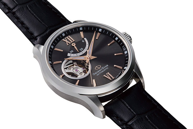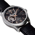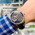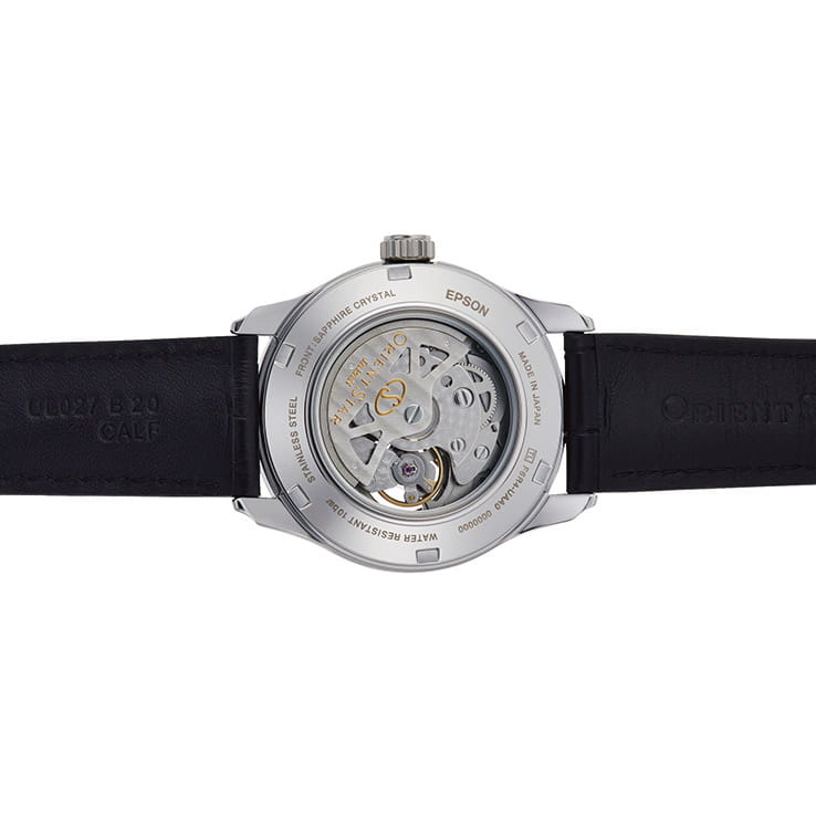 Прозрачная задняя крышка предоставляет возможность наблюдать за работой механизма, а открытый баланс хода добавляет часы динамичность и визуальный интерес. Циферблат выполнен по технологии Sunray, имитирующей солнечные лучи, исходящие от центра. Часовые метки выполнены в виде штрихов и двух римских цифр, подчеркивая строгий и стильный дизайн. Стрелки покрыты люминесцентным составомЛюминесцентное покрытиеПозволяет считывать показания времени в темноте. Производители наносят на стрелки, часовые индексы, безель или поверхность циферблата светонакопительный состав, дающий холодное свечение., облегчающим чтение времени в условиях низкой освещённости.