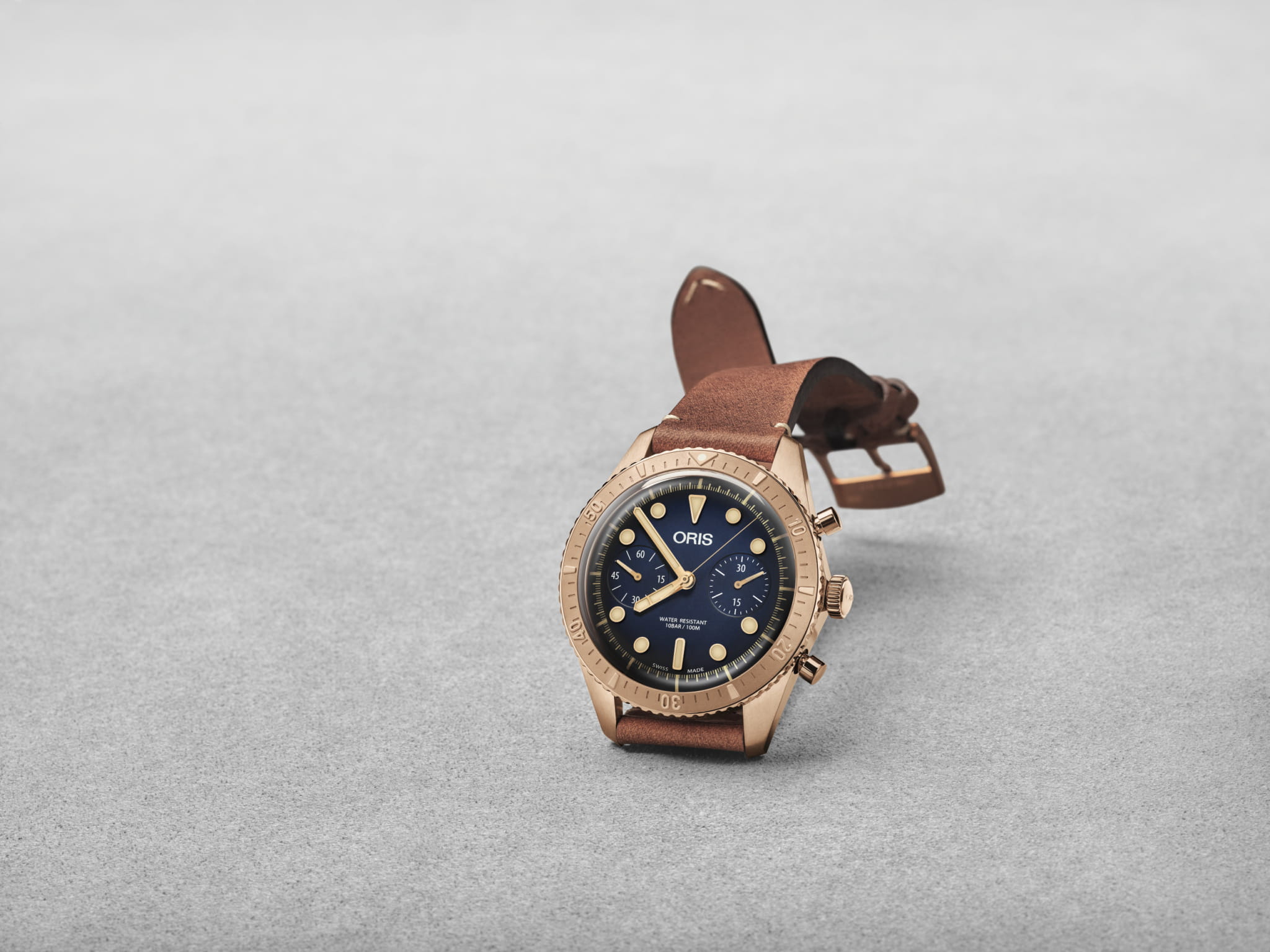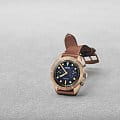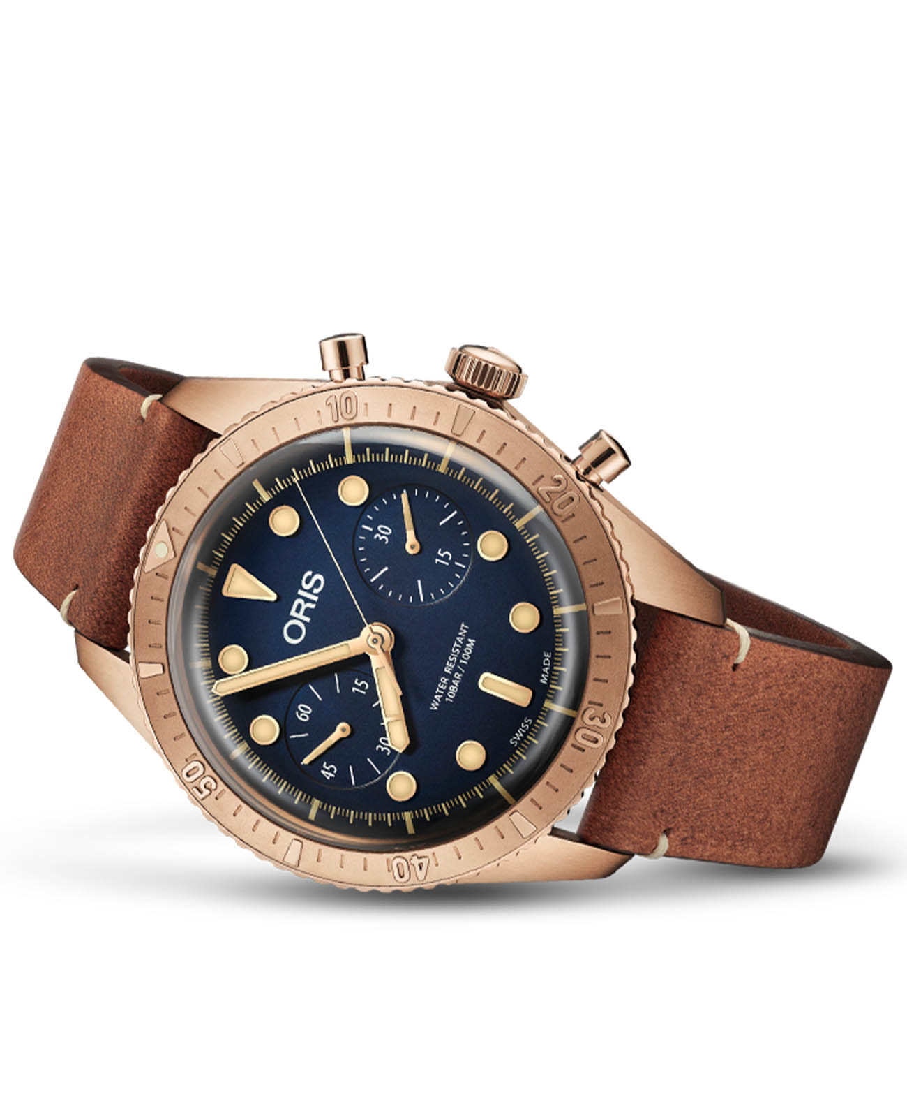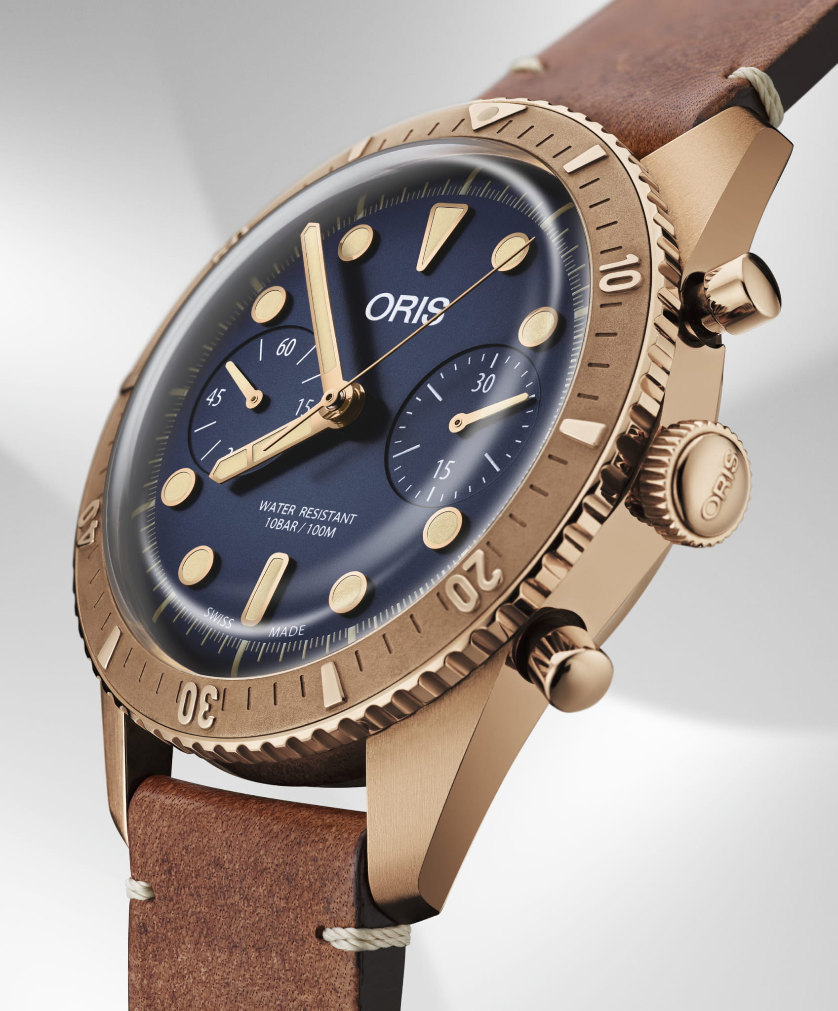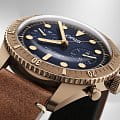 Корпус диаметром 43 мм выполнен из многокомпонентного материала: сочетания бронзы и нержавеющей стали, что придает часам не только прочность, но и особый винтажный шарм. Поворотный ободок с минутной шкалой помогает точно отслеживать продолжительность погружений. Циферблат цвета защищен выпуклым сапфировое стеклоСапфировое стеклоПрочный и надёжный материал из кристалла сапфира синтетического происхождения, характеризующийся особой твёрдостью и устойчивостью к царапинам и повреждениям. с антибликовым покрытиемАнтибликовое покрытиеСлой оксида металла в 0,13-0,3 микрон, благодаря которому стекло часов не бликует и не отражает свет. Антибликовое покрытие уменьшает отражение света в 10 раз, обеспечивая отличную читаемость показателей циферблата., обеспечивающим отличную читаемость показаний даже при ярком освещении.