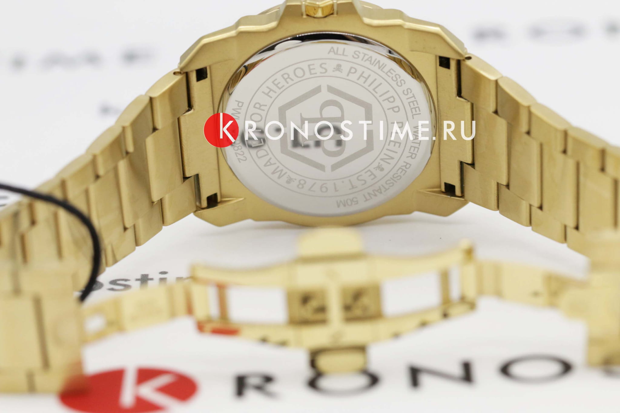 Мужские кварцевые часы с фирменным изображением черепа Philipp Plein The Skull King PWLAA0822, кварцевый механизм с высокой точностью. Класс водозащиты: 50 метров, позволит защитить корпус от случайных брызг или капель дождя. Корпус и браслет часов изготовлены из стали с IP-покрытиемIP-покрытиеМетод ионного напыления. Демонстрирует повышенную устойчивость к истиранию, окислению и химическим веществам. Под воздействием высокого давления и температуры около 1500°C молекулы металла надёжно соединяются с частицами корпуса часов. цвета желтое золото. Прочное минеральное стеклоМинеральное стеклоМинеральное стекло представляет собой искусственно выращенный минерал кварца. Такое стекло отличается особой устойчивостью к повреждениям и царапинам. Уступает по некоторым качествам сапфировому стеклу. устойчивое к мелким механическим повреждениям. Браслет дополняет застёжка-бабочка с кнопкамиЗастёжка "бабочка"Такой вид застёжки дополняется предохранителями, помогающими избежать случайного раскрытия браслета. Обладают изящным исполнением. .
