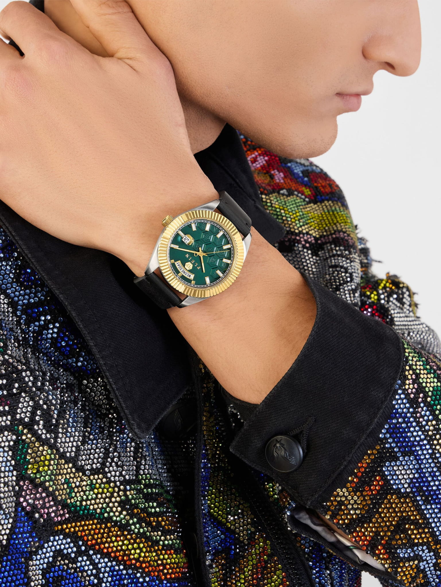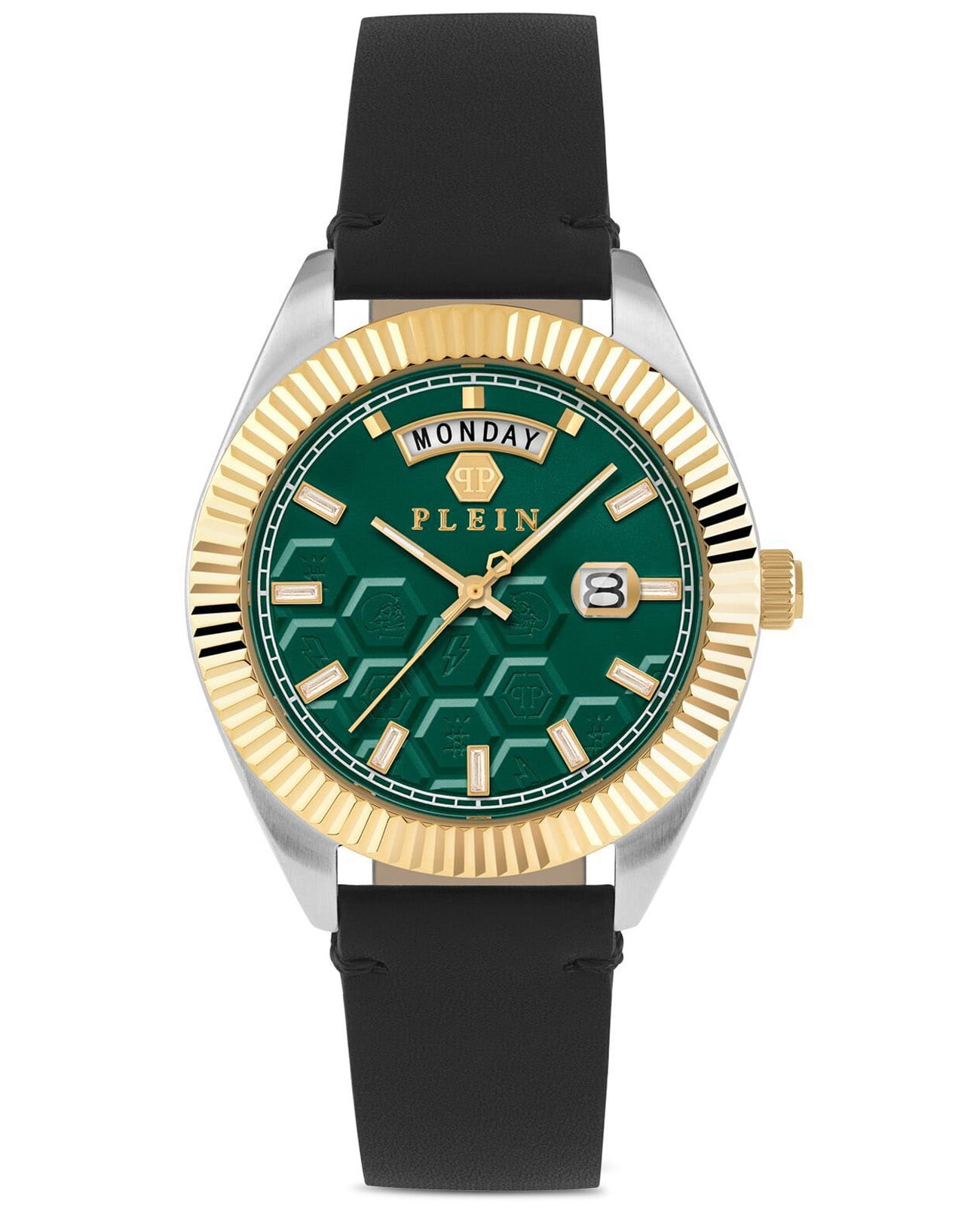 Часы Philipp Plein PWPVA0124 из коллекции Superlative Gent сочетают элегантность и функциональность. Корпус диаметром 42 мм выполнен из нержавеющей стали. БезельБезельВнешний ободок, закрепляющий стекло. В спортивных часах так называется поворотное кольцо с делениями на циферблате, выполняет роль таймера – замеряет отрезки времени на шкале. Неподвижный безель – элемент декора. Однонаправленно вращающийся безель на дайверских часах позволяет фиксировать моменты погружения и выныривания на поверхность. с IP-покрытиемIP-покрытиеМетод ионного напыления. Демонстрирует повышенную устойчивость к истиранию, окислению и химическим веществам. Под воздействием высокого давления и температуры около 1500°C молекулы металла надёжно соединяются с частицами корпуса часов. придающим изделию роскошный вид.