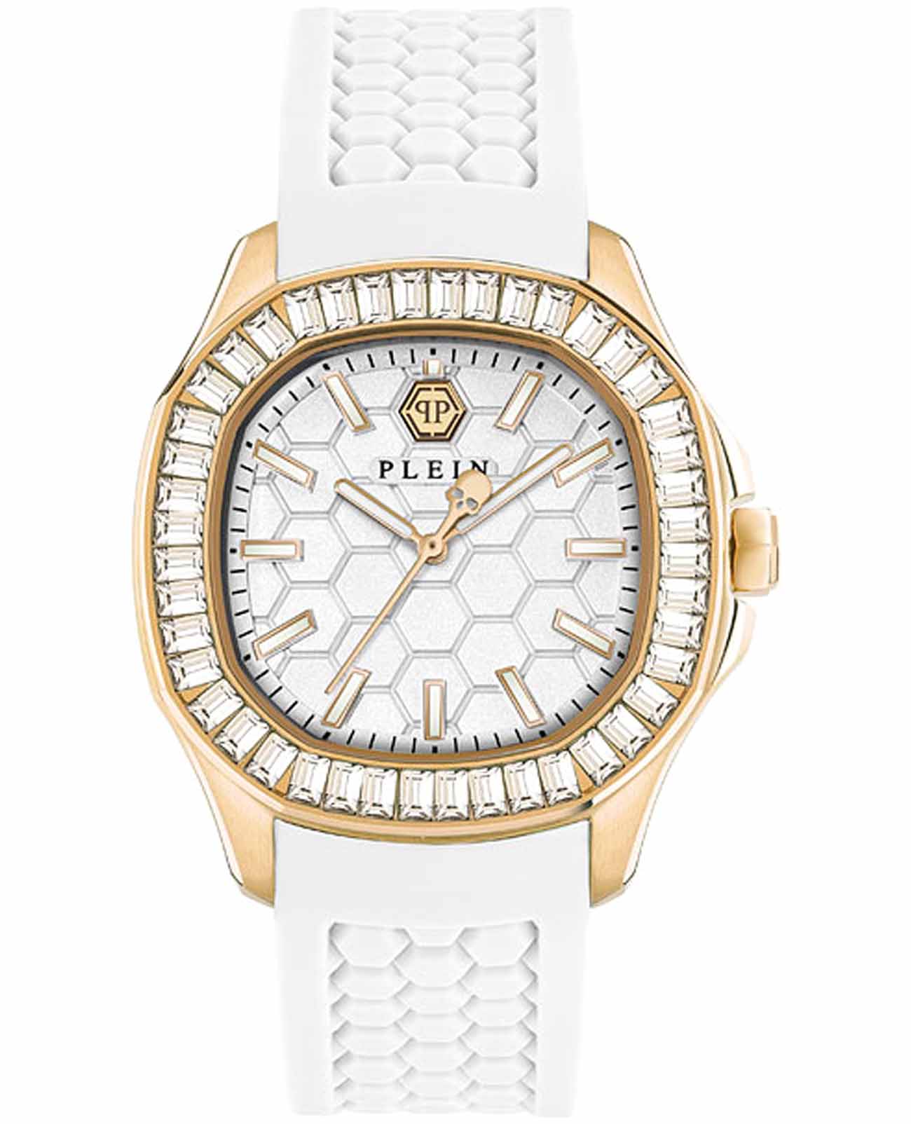 Philipp Plein THE $PECTRE LADY PWTAA0924 - дерзкое заявление любви к роскоши и бунтарскому стилю. Диаметр корпуса из прочной нержавеющей стали с PVD-покрытиемPVDУльтратонкое покрытие наносится в технике вакуумного напыления, сочетает в себе нитрид титана особой прочности со слоем золота или оксида хрома. Несёт в себе декоративную или защитную функцию. равен 38 мм. Силиконовый ремешок на стандартной застёжке обеспечивает надёжную фиксацию и комфортное ношение. Минеральное стеклоМинеральное стеклоМинеральное стекло представляет собой искусственно выращенный минерал кварца. Такое стекло отличается особой устойчивостью к повреждениям и царапинам. Уступает по некоторым качествам сапфировому стеклу. защищает циферблат от царапин. Люминесцентное покрытиеЛюминесцентное покрытиеПозволяет считывать показания времени в темноте. Производители наносят на стрелки, часовые индексы, безель или поверхность циферблата светонакопительный состав, дающий холодное свечение. стрелок и меток позволит следить за временем даже в полной темноте. БезельБезельВнешний ободок, закрепляющий стекло. В спортивных часах так называется поворотное кольцо с делениями на циферблате, выполняет роль таймера – замеряет отрезки времени на шкале. Неподвижный безель – элемент декора. Однонаправленно вращающийся безель на дайверских часах позволяет фиксировать моменты погружения и выныривания на поверхность. инкрустирован кристаллами Preciosa. Влагозащита: 50 метров, позволит защитить корпус от случайных брызг или капель дождя. Идеальный аксессуар для тех, кто ценит индивидуальность и не боится выделяться из толпы.