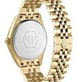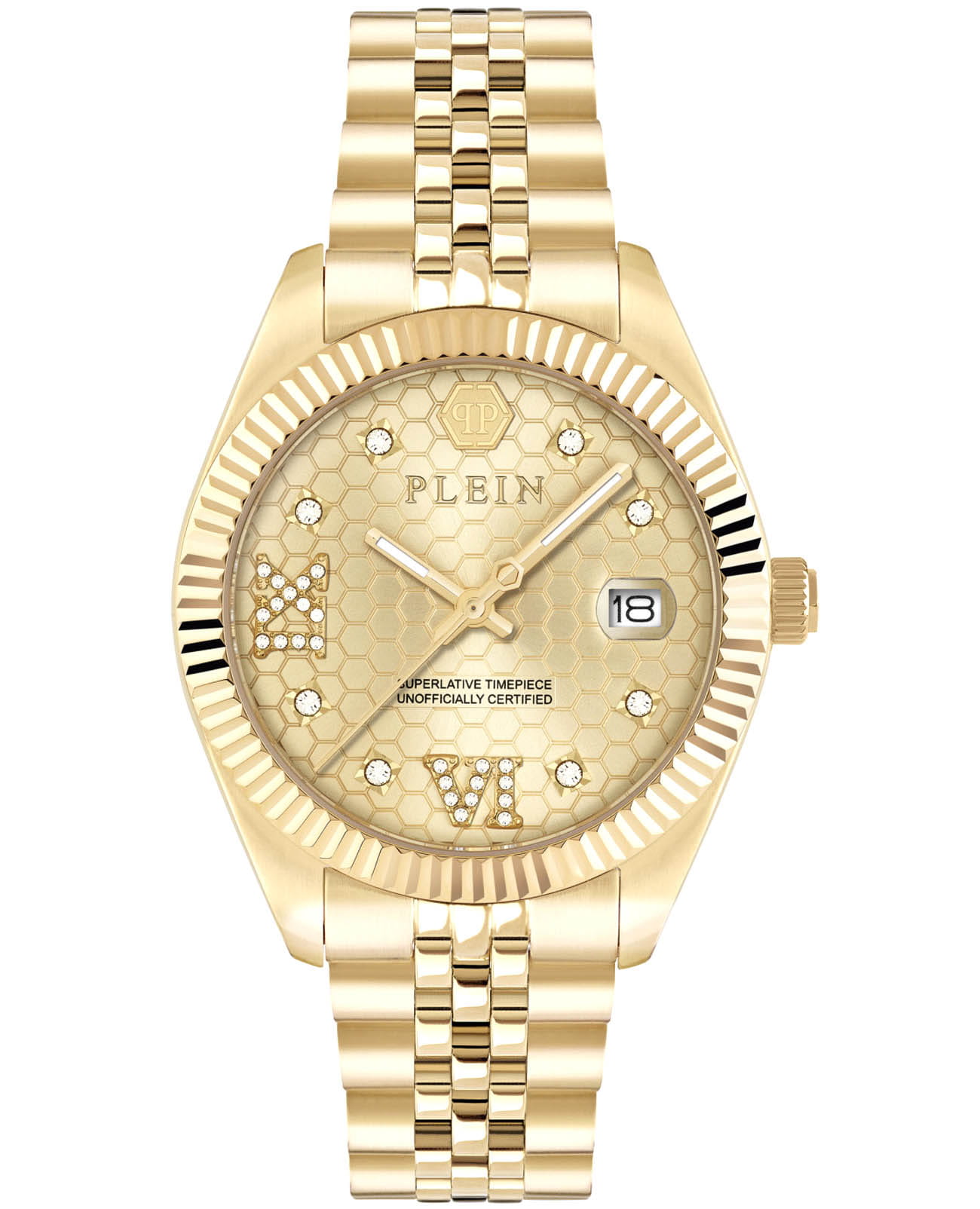 Женские кварцевые часы Philipp Plein Date Superlative PWYFA0425 — это стильное сочетание элегантности и современного дизайна. Изящный корпус выполнен из нержавеющей стали с PVD-покрытиемPVDУльтратонкое покрытие наносится в технике вакуумного напыления, сочетает в себе нитрид титана особой прочности со слоем золота или оксида хрома. Несёт в себе декоративную или защитную функцию., диаметром 34 мм, что придаст образу женственности и романтизма. Изысканный циферблат с метками в виде точек придает модели особый блеск. Циферблат защищен минеральным стекломМинеральное стеклоМинеральное стекло представляет собой искусственно выращенный минерал кварца. Такое стекло отличается особой устойчивостью к повреждениям и царапинам. Уступает по некоторым качествам сапфировому стеклу., обеспечивающий устойчивость к царапинам и украшен кристаллами. Стрелки с люминесцентным покрытиемЛюминесцентное покрытиеПозволяет считывать показания времени в темноте. Производители наносят на стрелки, часовые индексы, безель или поверхность циферблата светонакопительный состав, дающий холодное свечение.. Часы оснащены надежным кварцевым механизмом. Окошко даты находится в положении 3 часа. Стальной браслет с PVD-покрытиемPVDУльтратонкое покрытие наносится в технике вакуумного напыления, сочетает в себе нитрид титана особой прочности со слоем золота или оксида хрома. Несёт в себе декоративную или защитную функцию. на застёжке-бабочкеЗастёжка "бабочка"Такой вид застёжки дополняется предохранителями, помогающими избежать случайного раскрытия браслета. Обладают изящным исполнением. , гарантирует комфортное и безопасное ношение. Класс водозащиты: 50 метров позволит защитить корпус от случайных брызг или капель дождя. Phlipp Plein — отличный выбор для тех, кто ценит яркость и качество.