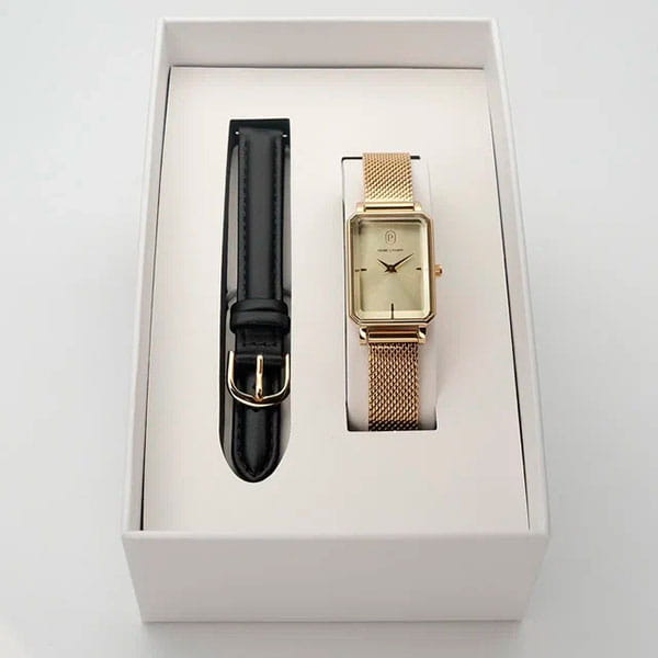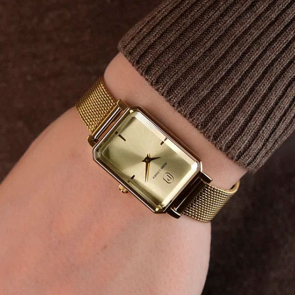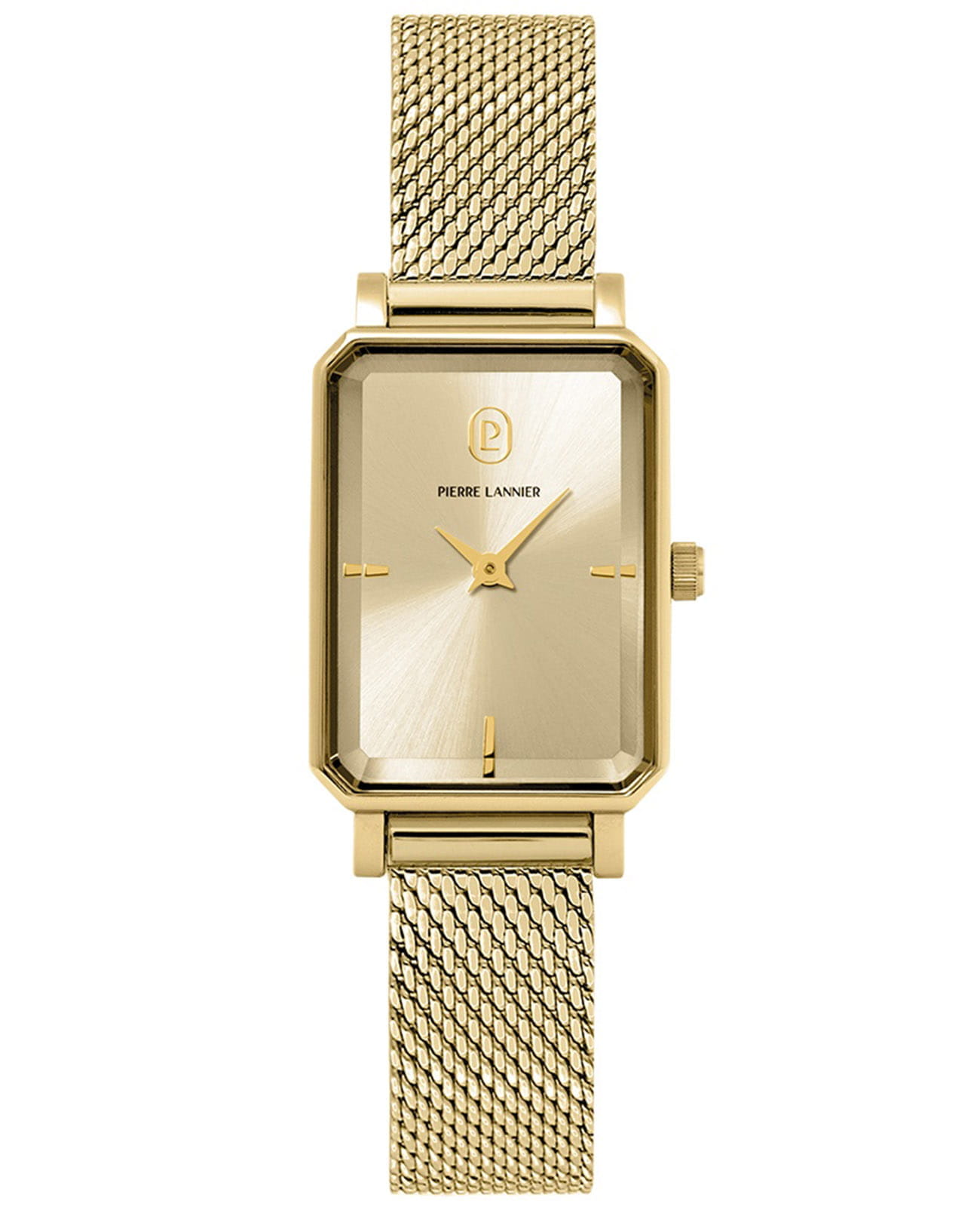 Женские кварцевые часы Pierre Lannier — это элегантный аксессуар с французским дизайном. Корпус прямоугольной формы размером 21 мм и толщиной 7,8 мм выполнен из нержавеющей стали с IP-покрытиемIP-покрытиеМетод ионного напыления. Демонстрирует повышенную устойчивость к истиранию, окислению и химическим веществам. Под воздействием высокого давления и температуры около 1500°C молекулы металла надёжно соединяются с частицами корпуса часов. цвета жёлтого золота. Циферблат золотистого цвета оформлен стрелками. Циферблат защищён минеральным стекломМинеральное стеклоМинеральное стекло представляет собой искусственно выращенный минерал кварца. Такое стекло отличается особой устойчивостью к повреждениям и царапинам. Уступает по некоторым качествам сапфировому стеклу., устойчивым к мелким механическим повреждениям. Часы оснащены стальным браслетом миланского плетения с IP-покрытиемIP-покрытиеМетод ионного напыления. Демонстрирует повышенную устойчивость к истиранию, окислению и химическим веществам. Под воздействием высокого давления и температуры около 1500°C молекулы металла надёжно соединяются с частицами корпуса часов. на раскладной застёжкеРаскладная застёжкаТакой тип застёжки используется только на браслетах из металла. Она никогда не раскрывается полностью, происходит разделение на 2 и более частей. Раскладывающая застёжка снизит вероятность потери часов к минимуму.. В комплект входит дополнительный кожаный ремешок. Водонепроницаемость 30 м позволяет использовать часы в повседневных условиях. Идеальный выбор для тех, кто ценит французский стиль и универсальный дизайн.