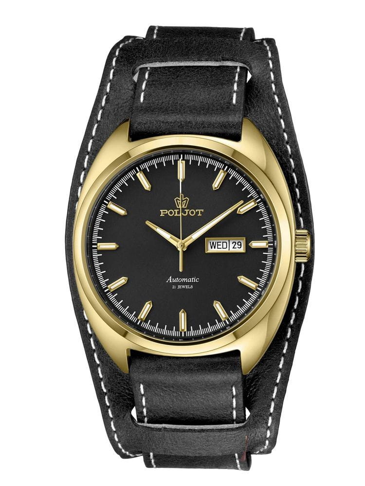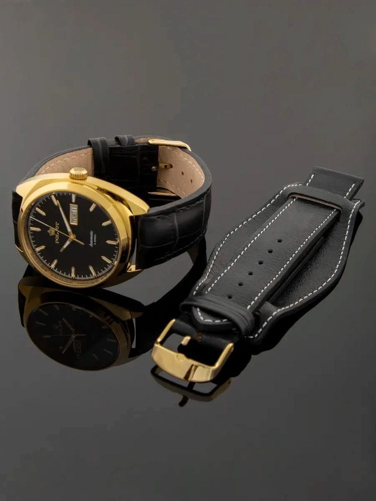 Poljot 8205.246275 — элегантные механические часы с автоподзаводом, сочетающем силу и изысканность. Корпус из нержавеющей стали с PVD-покрытиемPVDУльтратонкое покрытие наносится в технике вакуумного напыления, сочетает в себе нитрид титана особой прочности со слоем золота или оксида хрома. Несёт в себе декоративную или защитную функцию. подчеркивает надёжность и лаконичность дизайна, а глубокий циферблат с золотистыми стрелками придаёт модели благородный акцент. Проверенный японский механизм Miyota 8205 обеспечивает точность хода и долговечность, а плавное движение секундной стрелки подчёркивает качество сборки. Метки и стрелки с люминесцентным покрытиемЛюминесцентное покрытиеПозволяет считывать показания времени в темноте. Производители наносят на стрелки, часовые индексы, безель или поверхность циферблата светонакопительный состав, дающий холодное свечение. обеспечивают отличную читаемость при любом освещении, а окно даты добавляет практичности. Прочное минеральное стеклоМинеральное стеклоМинеральное стекло представляет собой искусственно выращенный минерал кварца. Такое стекло отличается особой устойчивостью к повреждениям и царапинам. Уступает по некоторым качествам сапфировому стеклу. защищает циферблат от царапин, а ремешок из натуральной кожи завершает утончённый облик модели. Poljot — гармония классики и современной механики, созданная для тех, кто ценит традиции и индивидуальность в каждой детали. В комплекте дополнительный ремешок с напульсником.
