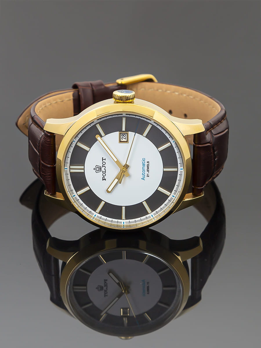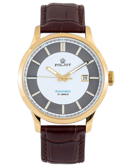 Poljot 8215.906222 — классические механические мужские часы с автоподзаводом, сочетающие сдержанный дизайн и надёжность российского часового производства. Корпус из нержавеющей стали с PVD-покрытиемPVDУльтратонкое покрытие наносится в технике вакуумного напыления, сочетает в себе нитрид титана особой прочности со слоем золота или оксида хрома. Несёт в себе декоративную или защитную функцию. подчёркивает строгость и универсальность модели, а циферблат с крупными арабскими цифрами и аккуратным окном даты на позиции «3 часов» обеспечивает превосходную читаемость. Стрелки и метки с люминесцентным покрытиемЛюминесцентное покрытиеПозволяет считывать показания времени в темноте. Производители наносят на стрелки, часовые индексы, безель или поверхность циферблата светонакопительный состав, дающий холодное свечение.. Механизм с автоподзаводом гарантирует стабильную работу и плавный ход стрелок. Прочное минеральное стеклоМинеральное стеклоМинеральное стекло представляет собой искусственно выращенный минерал кварца. Такое стекло отличается особой устойчивостью к повреждениям и царапинам. Уступает по некоторым качествам сапфировому стеклу. защищает циферблат от царапин, а ремешок из натуральной кожи придаёт часам современное и элегантное звучание. Poljot — это воплощение надёжности, классики и уверенного стиля, созданное для мужчин, предпочитающих традиционную механику и безупречный внешний вид.