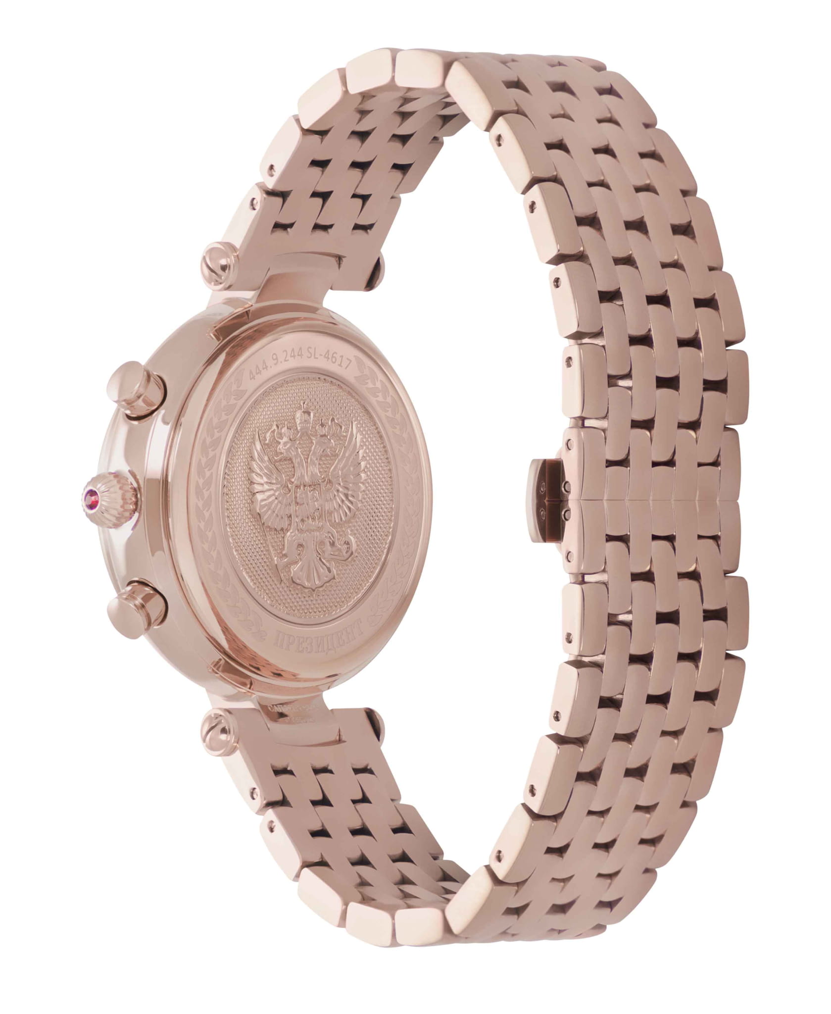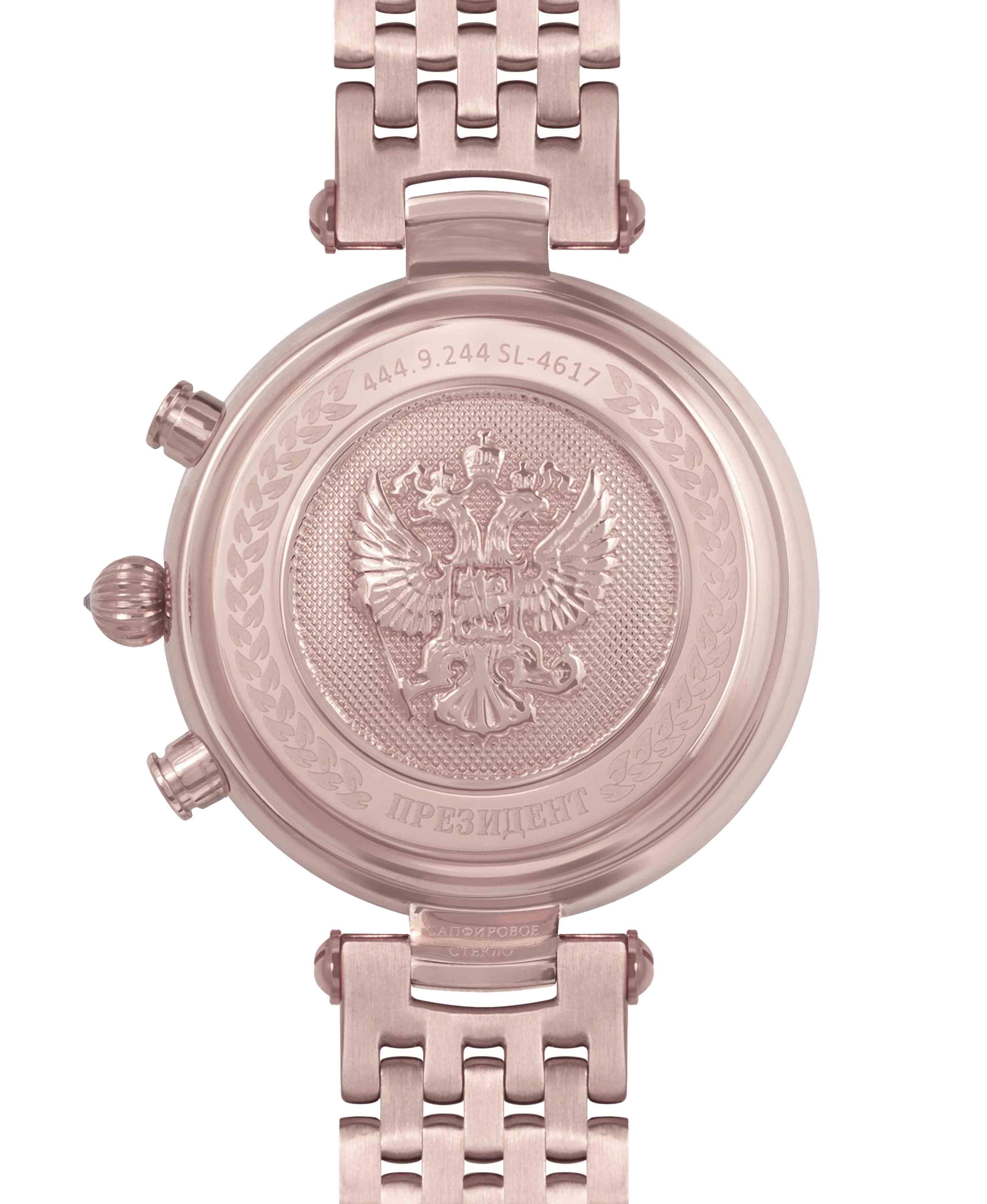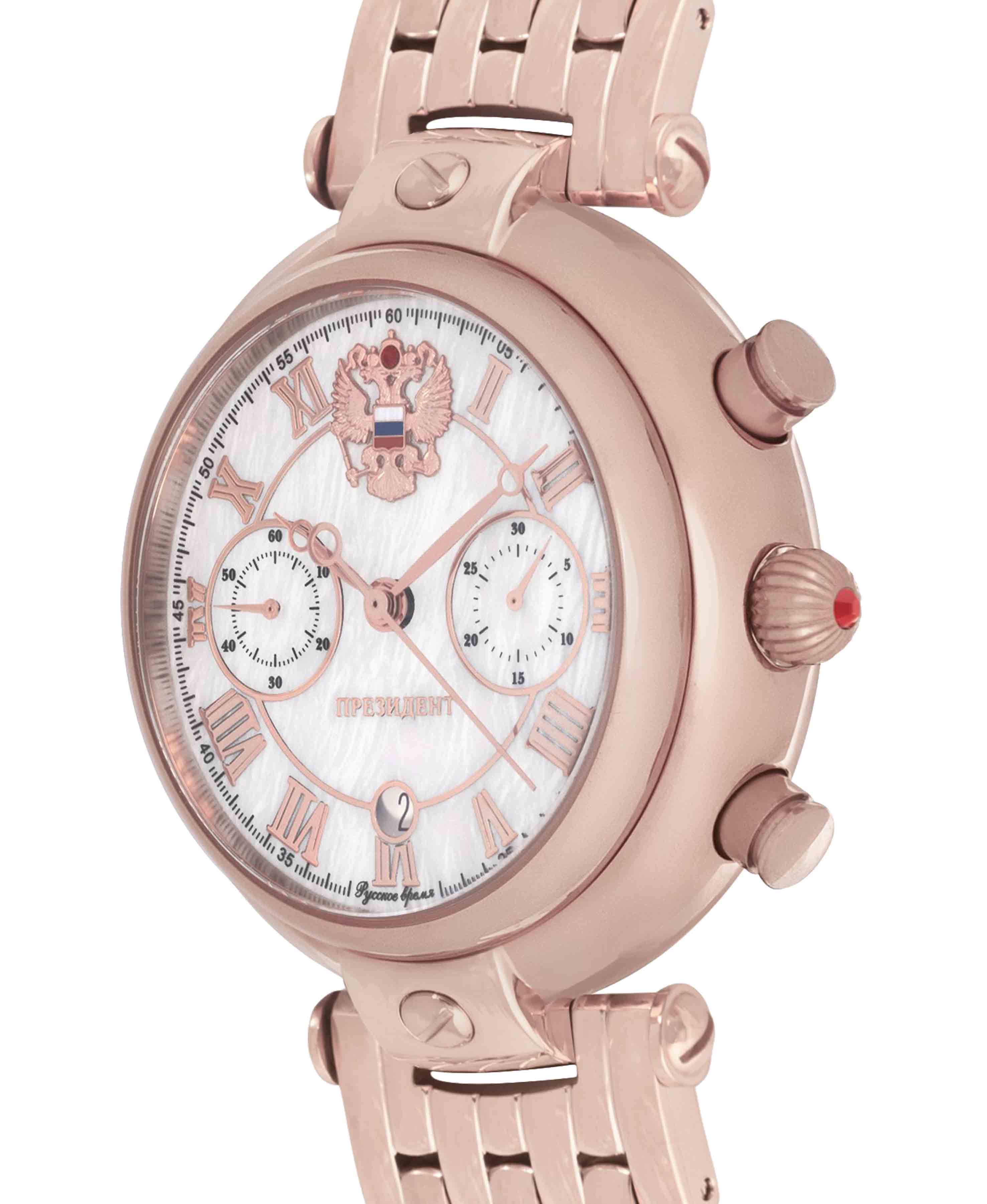 Мужские часы из коллекции «Президент» — это сочетание элегантности, точности и российского качества. Модель выполнена в круглой форме с корпусом диаметром 42,5 мм и защищённым сапфировым стекломСапфировое стеклоПрочный и надёжный материал из кристалла сапфира синтетического происхождения, характеризующийся особой твёрдостью и устойчивостью к царапинам и повреждениям., устойчивым к царапинам и механическим повреждениям. Циферблат выполнен из перламутра, а элементы корпуса украшены кристаллами Swarovski, что придаёт модели особую роскошь и изысканность. Часы оснащены механизмом хронографа с автоподзаводом, обеспечивающим надёжную работу и минимальное обслуживание. Задняя крышка с чеканкой Герба России подчёркивает национальный стиль и уникальность модели. В комплект поставки входят подарочный футляр, паспорт с гарантийным талоном и фирменный пакет, что делает их идеальным выбором для подарка или повседневного использования. Водонепроницаемость позволяет использовать часы в повседневных условиях — при мытье рук или под лёгким дождём. Браслет изготовлен из нержавеющей стали, что обеспечивает прочность и комфорт при ношении. Эти часы станут универсальным аксессуаром для тех, кто ценит сочетание стиля, функциональности и российского мастерства — идеальный выбор для уверенных в себе мужчин, следящих за своим имиджем и предпочитающих выделяться.