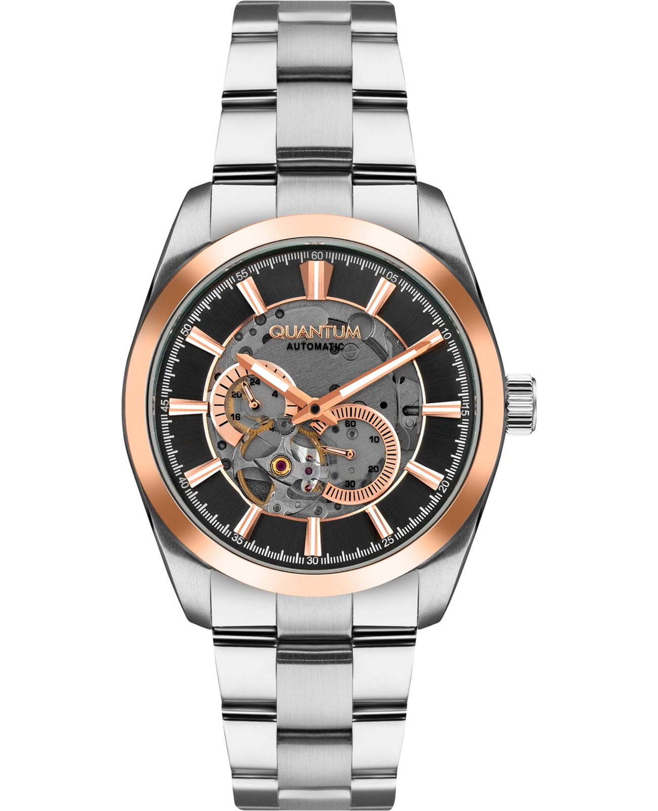 Мужские механические часы с автоподзаводом Quantum Q-Master — это классический и функциональный аксессуар. Корпус диаметром 41 мм выполнен из нержавеющей стали. БезельБезельВнешний ободок, закрепляющий стекло. В спортивных часах так называется поворотное кольцо с делениями на циферблате, выполняет роль таймера – замеряет отрезки времени на шкале. Неподвижный безель – элемент декора. Однонаправленно вращающийся безель на дайверских часах позволяет фиксировать моменты погружения и выныривания на поверхность. с IP-покрытиемIP-покрытиеМетод ионного напыления. Демонстрирует повышенную устойчивость к истиранию, окислению и химическим веществам. Под воздействием высокого давления и температуры около 1500°C молекулы металла надёжно соединяются с частицами корпуса часов.. Циферблат чёрного цвета частично скелетонизированный, оформлен штрихами и стрелками. Присутствуют два вынесенных субциферблата: для отображения секунд и 24-часового формата времени. Циферблат защищён сапфировым стекломСапфировое стеклоПрочный и надёжный материал из кристалла сапфира синтетического происхождения, характеризующийся особой твёрдостью и устойчивостью к царапинам и повреждениям.. Прозрачная завинчивающаяся задняя крышка позволяет наблюдать за работой механизма. Стрелки с люминесцентным покрытиемЛюминесцентное покрытиеПозволяет считывать показания времени в темноте. Производители наносят на стрелки, часовые индексы, безель или поверхность циферблата светонакопительный состав, дающий холодное свечение., обеспечивающим хорошую читаемость в темноте. Часы оснащены стальным браслетом на раскладной застёжке с фиксаторомРаскладная застёжкаТакой тип застёжки используется только на браслетах из металла. Она никогда не раскрывается полностью, происходит разделение на 2 и более частей. Раскладывающая застёжка снизит вероятность потери часов к минимуму.. Водонепроницаемость 50 м позволяет использовать часы при мытье рук или в дождь. Идеальный выбор для тех, кто ценит турецкое качество и универсальный дизайн.