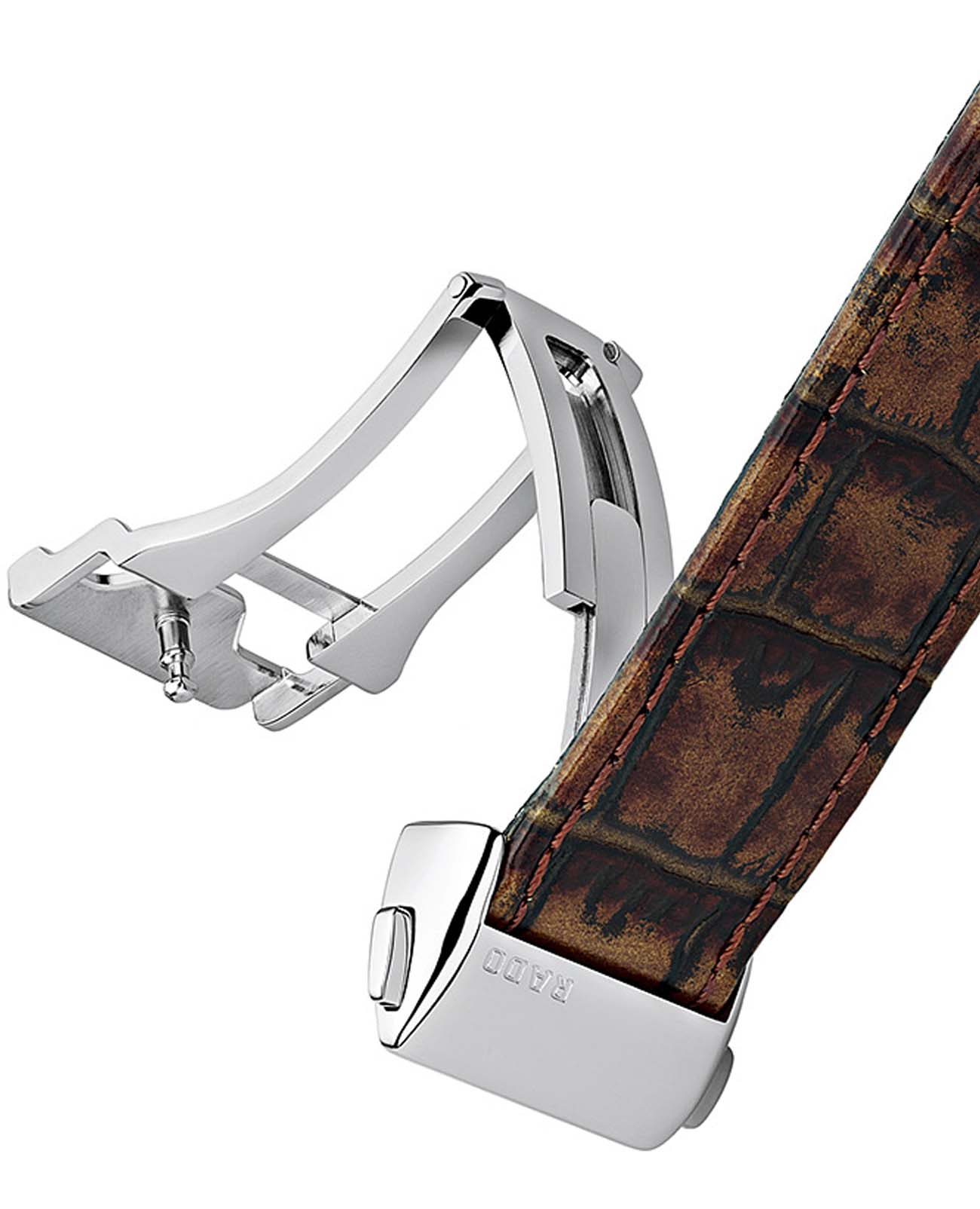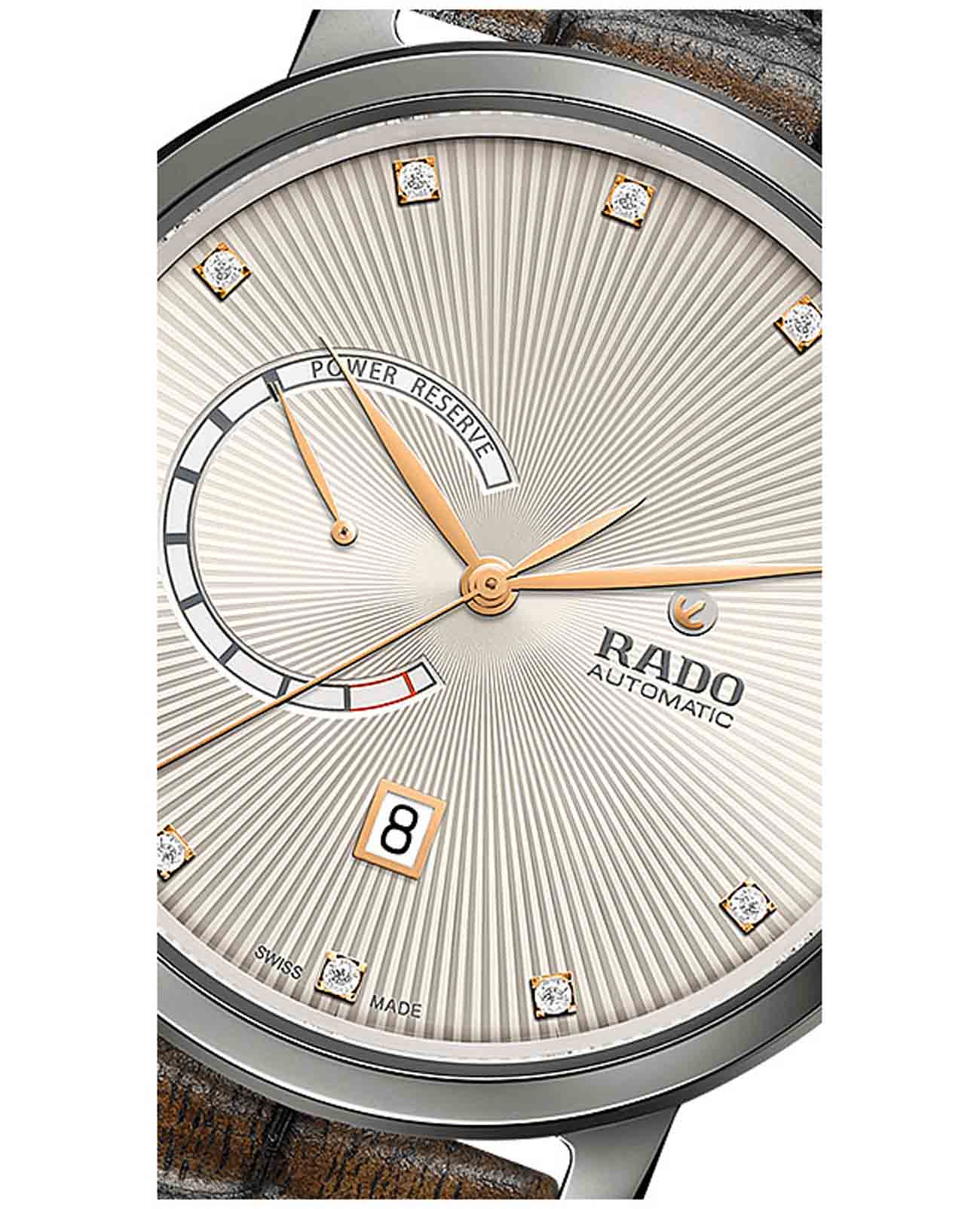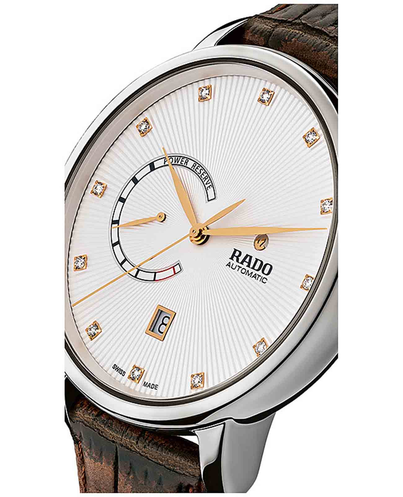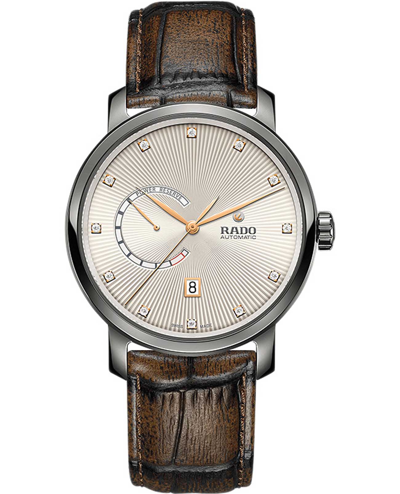 Мужские швейцарские механические часы-хронометр с автоподзаводом Rado Coupole R14138706. Сапфировое стеклоСапфировое стеклоПрочный и надёжный материал из кристалла сапфира синтетического происхождения, характеризующийся особой твёрдостью и устойчивостью к царапинам и повреждениям. устойчивое к мелким механическим повреждениям. Корпус часов изготовлен из высокотехнологичной керамикиВысокотехнологичная керамикаИнновационный запатентованный Rado материал с гладкой или матовой поверхностью. Керамика за счёт кристаллической структуры обладает повышенной устойчивостью от возникновения царапин. Материал способен принимать температуру тела человека, обеспечивая невероятный комфорт при ношении.. Циферблат украшен бриллиантами. Окошко даты находится в положении 6 часов. Класс водозащиты: 100 метров, позволит плавать, нырять и заниматься другими водными видами спорта. Кожаный ремешок на раскладной застёжкеРаскладная застёжкаТакой тип застёжки используется только на браслетах из металла. Она никогда не раскрывается полностью, происходит разделение на 2 и более частей. Раскладывающая застёжка снизит вероятность потери часов к минимуму..