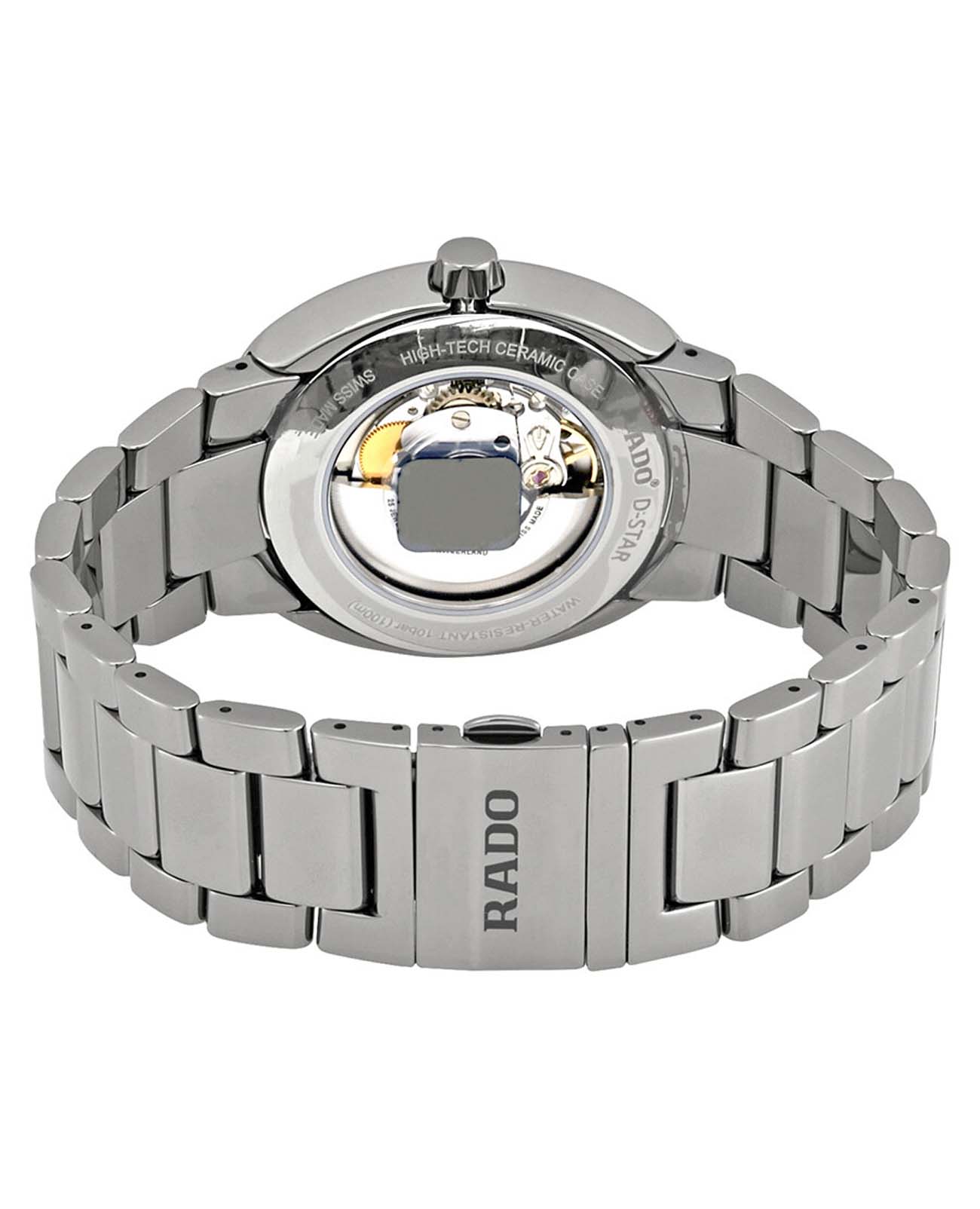 Мужские механические швейцарские часы Rado D-Star R15760102. Сапфировое стеклоСапфировое стеклоПрочный и надёжный материал из кристалла сапфира синтетического происхождения, характеризующийся особой твёрдостью и устойчивостью к царапинам и повреждениям. устойчивое к мелким механическим повреждениям. Корпус часов изготовлен из высокотехнологичной керамикиВысокотехнологичная керамикаИнновационный запатентованный Rado материал с гладкой или матовой поверхностью. Керамика за счёт кристаллической структуры обладает повышенной устойчивостью от возникновения царапин. Материал способен принимать температуру тела человека, обеспечивая невероятный комфорт при ношении.. Окошко даты находится в положении 6 часов. Класс водозащиты: 100 метров, позволит плавать, нырять и заниматься другими водными видами спорта. Браслет из высокотехнологичной керамикиВысокотехнологичная керамикаИнновационный запатентованный Rado материал с гладкой или матовой поверхностью. Керамика за счёт кристаллической структуры обладает повышенной устойчивостью от возникновения царапин. Материал способен принимать температуру тела человека, обеспечивая невероятный комфорт при ношении. на раскладной застёжкеРаскладная застёжкаТакой тип застёжки используется только на браслетах из металла. Она никогда не раскрывается полностью, происходит разделение на 2 и более частей. Раскладывающая застёжка снизит вероятность потери часов к минимуму..
