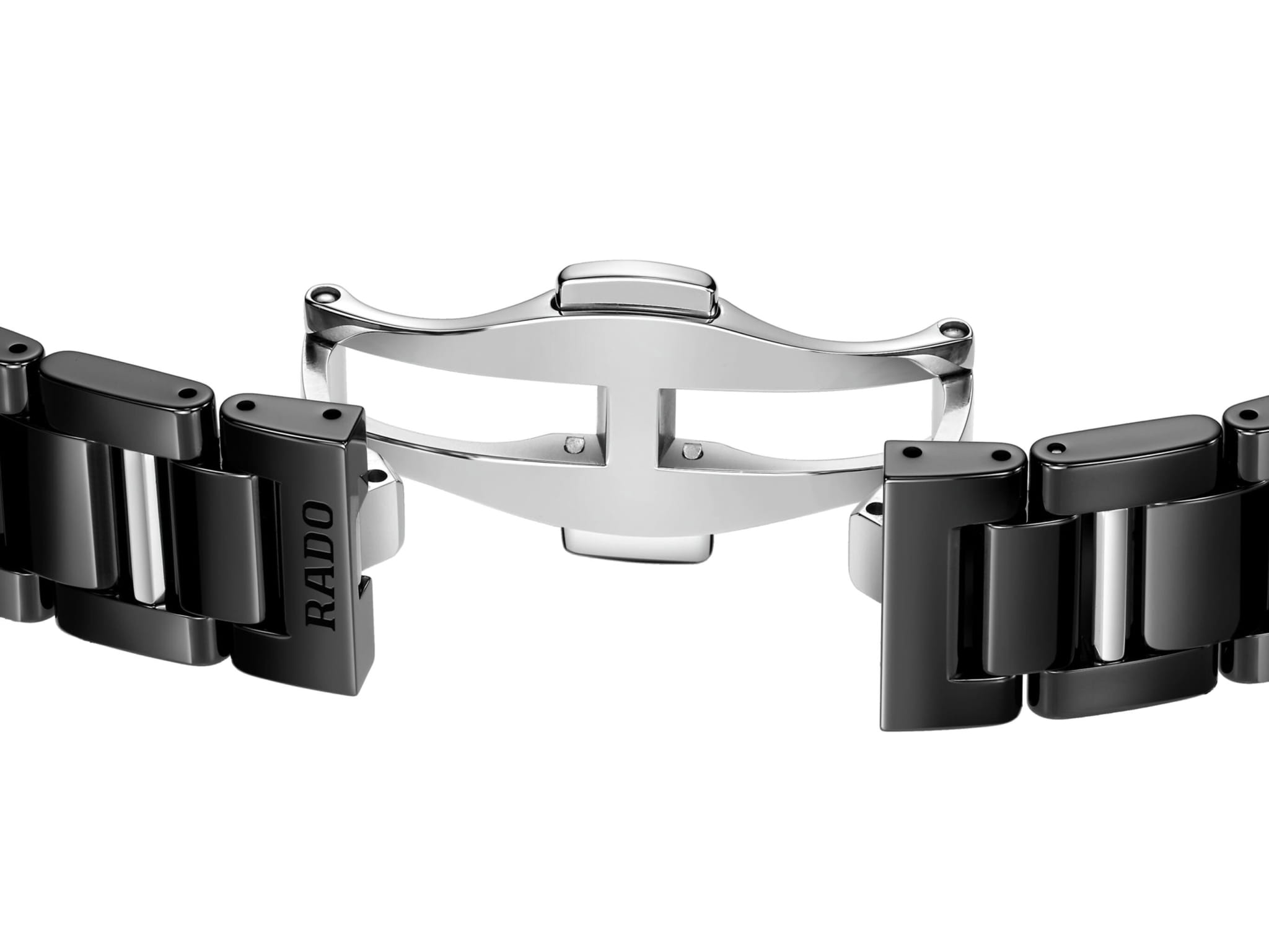 Женские кварцевые часы Rado — это изысканный аксессуар с современным дизайном. Корпус диаметром 31 мм выполнен из высокотехнологичной керамикиВысокотехнологичная керамикаИнновационный запатентованный Rado материал с гладкой или матовой поверхностью. Керамика за счёт кристаллической структуры обладает повышенной устойчивостью от возникновения царапин. Материал способен принимать температуру тела человека, обеспечивая невероятный комфорт при ношении. и нержавеющей стали с PVD-покрытиемPVDУльтратонкое покрытие наносится в технике вакуумного напыления, сочетает в себе нитрид титана особой прочности со слоем золота или оксида хрома. Несёт в себе декоративную или защитную функцию. розового золота. Циферблат чёрного цвета оформлен аналоговым дисплеем. Циферблат защищён выпуклым сапфировым стекломСапфировое стеклоПрочный и надёжный материал из кристалла сапфира синтетического происхождения, характеризующийся особой твёрдостью и устойчивостью к царапинам и повреждениям.. Окошко даты расположено в положении 3 часов. Механизм — кварцевый. Часы оснащены браслетом из комбинации керамики и стали с PVD-покрытиемPVDУльтратонкое покрытие наносится в технике вакуумного напыления, сочетает в себе нитрид титана особой прочности со слоем золота или оксида хрома. Несёт в себе декоративную или защитную функцию. и застёжкой «бабочка» с кнопкамиЗастёжка "бабочка"Такой вид застёжки дополняется предохранителями, помогающими избежать случайного раскрытия браслета. Обладают изящным исполнением. . Водонепроницаемость 50 м позволяет использовать часы в повседневных условиях. Гарантия — 5 лет на механизм, 2 года на изделие. Идеальный выбор для тех, кто ценит стиль, качество и универсальность.
