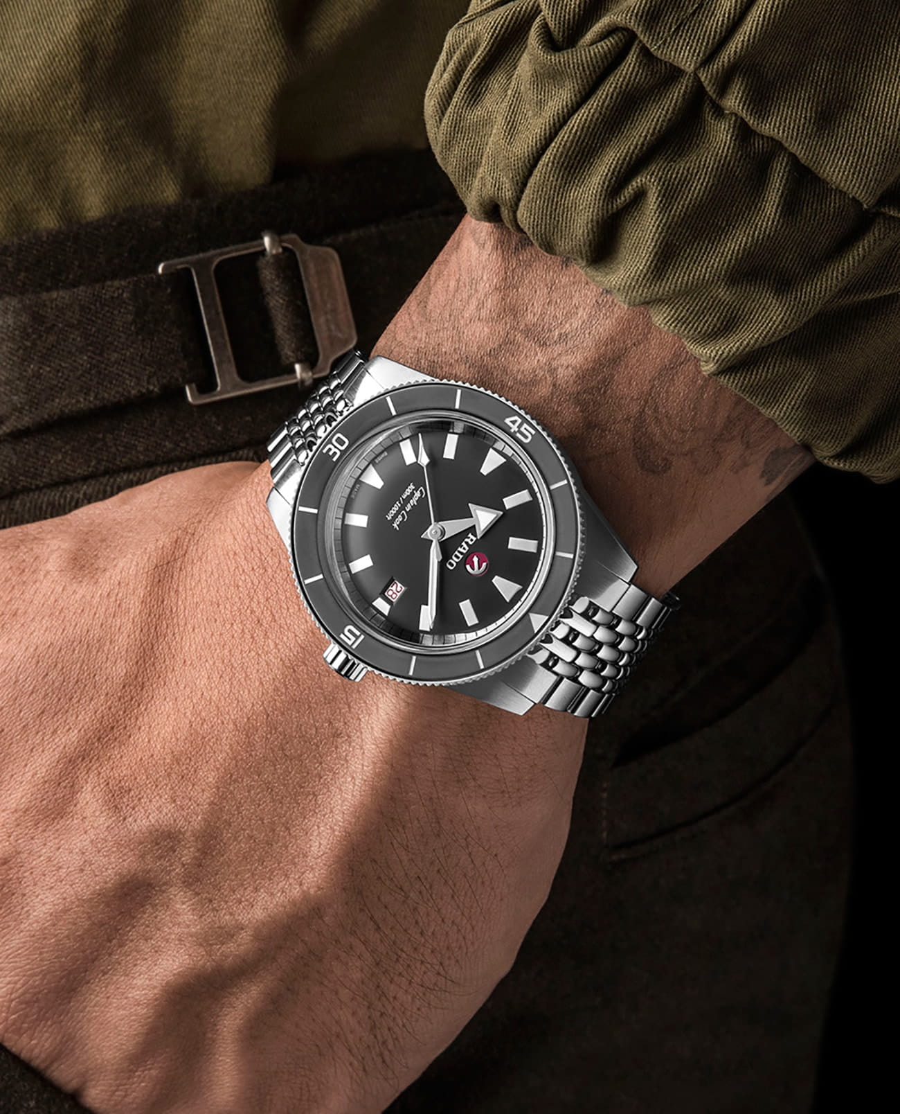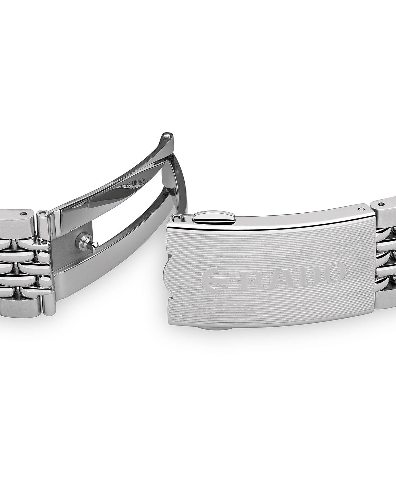Премиальная модель привлекает винтажными деталями, оригинальным элементом стали стрелки в виде меча и стрелы. Серый безельБезельВнешний ободок, закрепляющий стекло. В спортивных часах так называется поворотное кольцо с делениями на циферблате, выполняет роль таймера – замеряет отрезки времени на шкале. Неподвижный безель – элемент декора. Однонаправленно вращающийся безель на дайверских часах позволяет фиксировать моменты погружения и выныривания на поверхность. изготовлен из высокотехнологичной керамикиВысокотехнологичная керамикаИнновационный запатентованный Rado материал с гладкой или матовой поверхностью. Керамика за счёт кристаллической структуры обладает повышенной устойчивостью от возникновения царапин. Материал способен принимать температуру тела человека, обеспечивая невероятный комфорт при ношении., устойчивой к возникновению царапин. Аксессуар выполнен в спортивном стиле, но сдержанная цветовая гамма и лаконичный облик позволяет ему удачно гармонировать с деловой одеждой. Наручные часы работают от автоматического швейцарского механизма ETA C07.611, сохраняющего запас хода до 80 часов. В комплектацию входит дорожный кожаный кейс и набор сменных ремешков: тканевый, стальной, кожаный. Система Rado EasyClip позволяет легко и быстро менять ремешок без использования профессиональных инструментов. Сапфировое стекло имеет антибликовую обработку. Завинчивающаяся заводная головка и задняя крышка усиливают водостойкость до 200 метров. Для стрелок используется люминесцентное покрытиеЛюминесцентное покрытиеПозволяет считывать показания времени в темноте. Производители наносят на стрелки, часовые индексы, безель или поверхность циферблата светонакопительный состав, дающий холодное свечение.. Отображение числа на метке 3 часов. Диаметр корпуса: 42 мм.