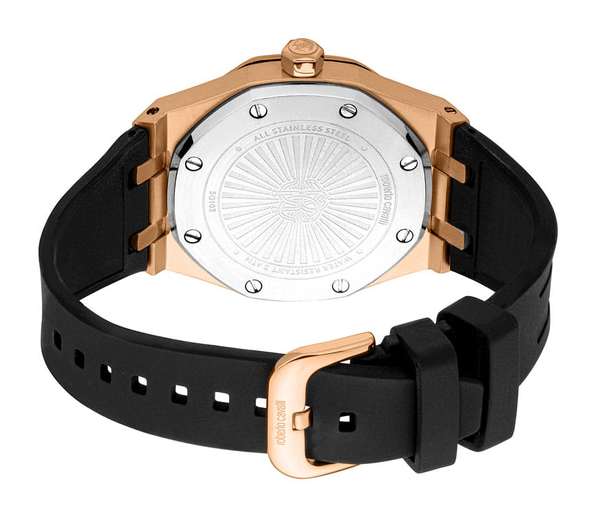 ROBERTO CAVALLI Uomo Ottagono RC5G102P0025 — стильные итальянские часы сочетающие в себе элегантность и современный функционал. Корпус диаметром 42 мм выполнен из нержавеющей стали с PVD-покрытиемPVDУльтратонкое покрытие наносится в технике вакуумного напыления, сочетает в себе нитрид титана особой прочности со слоем золота или оксида хрома. Несёт в себе декоративную или защитную функцию., толщина корпуса составляет 12 мм, что придает модели выразительный внешний вид и надежную защиту от внешних воздействий. Циферблат, искусно оформленный фирменными элементами Roberto Cavalli, притягивает взгляд и подчеркивает ваш безупречный вкус. Часы оснащены кварцевым механизмом, также обладают функцией отображения даты, что делает их удобными для ежедневного использования. Минеральное стеклоМинеральное стеклоМинеральное стекло представляет собой искусственно выращенный минерал кварца. Такое стекло отличается особой устойчивостью к повреждениям и царапинам. Уступает по некоторым качествам сапфировому стеклу. защищает часы от царапин. Водозащита 30 метров позволит защитить корпус от случайных брызг или капель дождя. Силиконовый ремешок на стандартной застёжке обеспечивает комфортное ношение. Стрелки и метки с люминесцентным покрытиемЛюминесцентное покрытиеПозволяет считывать показания времени в темноте. Производители наносят на стрелки, часовые индексы, безель или поверхность циферблата светонакопительный состав, дающий холодное свечение. обеспечивают отличную читаемость в любое время суток.
