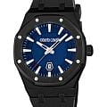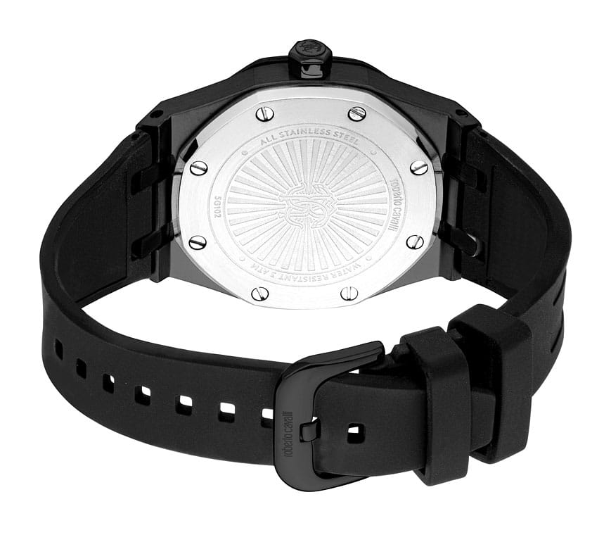 ROBERTO CAVALLI Uomo Ottagono RC5G102P0045 — стильные итальянские часы сочетающие в себе элегантность и современный функционал. Корпус диаметром 42 мм выполнен из нержавеющей стали с PVD-покрытиемPVDУльтратонкое покрытие наносится в технике вакуумного напыления, сочетает в себе нитрид титана особой прочности со слоем золота или оксида хрома. Несёт в себе декоративную или защитную функцию., толщина корпуса составляет 12 мм, что придает модели выразительный внешний вид и надежную защиту от внешних воздействий. Циферблат, искусно оформленный фирменными элементами Roberto Cavalli, притягивает взгляд и подчеркивает ваш безупречный вкус. Часы оснащены кварцевым механизмом, также обладают функцией отображения даты, что делает их удобными для ежедневного использования. Минеральное стеклоМинеральное стеклоМинеральное стекло представляет собой искусственно выращенный минерал кварца. Такое стекло отличается особой устойчивостью к повреждениям и царапинам. Уступает по некоторым качествам сапфировому стеклу. защищает часы от царапин. Водозащита 30 метров позволит защитить корпус от случайных брызг или капель дождя. Силиконовый ремешок на стандартной застёжке обеспечивает комфортное ношение. Стрелки и метки с люминесцентным покрытиемЛюминесцентное покрытиеПозволяет считывать показания времени в темноте. Производители наносят на стрелки, часовые индексы, безель или поверхность циферблата светонакопительный состав, дающий холодное свечение. обеспечивают отличную читаемость в любое время суток.