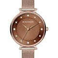 Брендовый аксессуар в стиле fashion отличается эксклюзивным оформлением, над которым работал знаменитый европейский дизайнер Вольфганг Джонсон. Бронзовый циферблат с золотистыми стрелками и метками имеет оригинальный узор посередине, по окружности он украшен сияющими цирконами. Привлекательно смотрится браслет плетения Mesh. Кварцевый механизм с высокой точностью хода. Минеральное стекло препятствует образованию царапин. Цветное PVD-покрытиеPVDУльтратонкое покрытие наносится в технике вакуумного напыления, сочетает в себе нитрид титана особой прочности со слоем золота или оксида хрома. Несёт в себе декоративную или защитную функцию. нержавеющей стали. Водонепроницаемость 30 метров. Диаметр корпуса: 34 мм.
