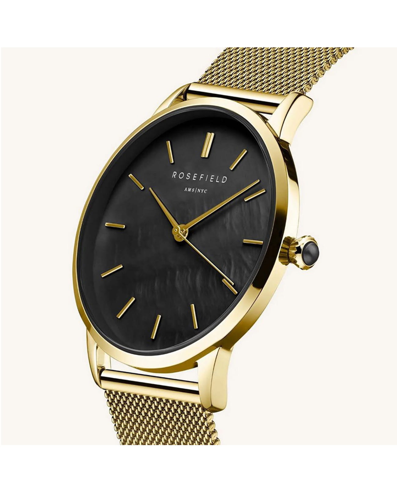 Женские кварцевые часы Rosefield RBGMG-R07. Черный перламутровый циферблат. Круглый корпус выполнен из металла с IP покрытием цвета желтого золота. Диаметр корпуса составляет 36 мм, толщина 7,5 мм. Стальной браслет с покрытием выполнен в технике миланского плетения, раскладная застежка. Прочное минеральное стекло устойчивое к мелким механическим повреждениям. Водостойкость WR 30 (брызги).