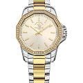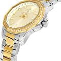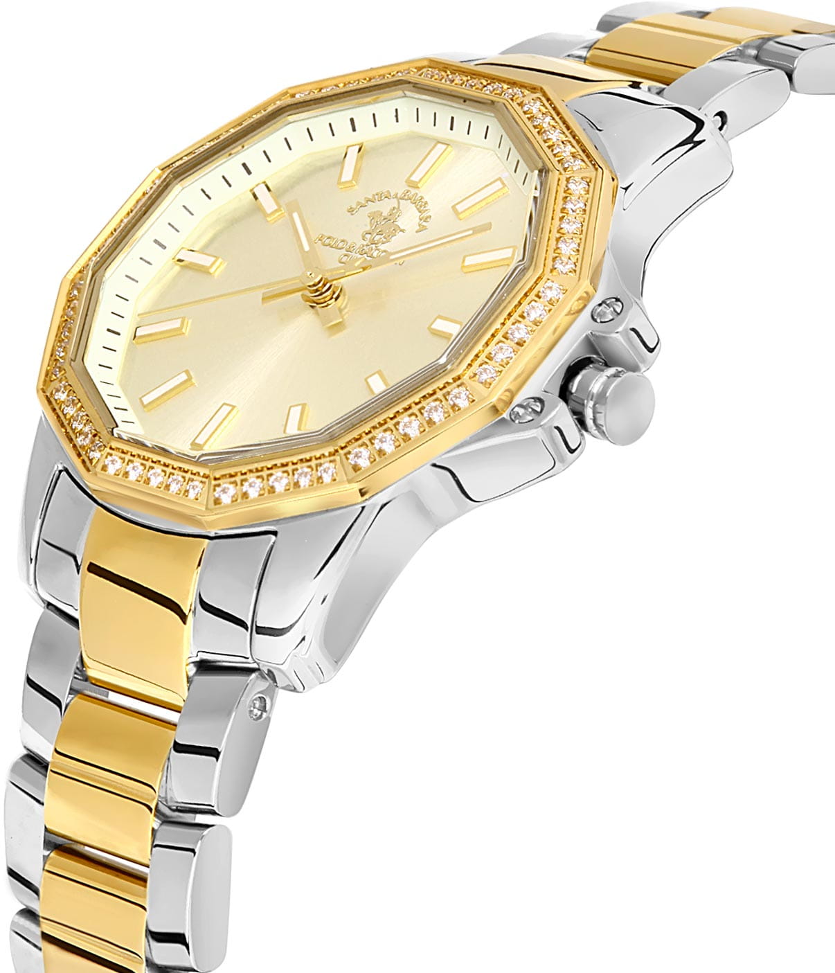 Женские кварцевые часы Santa Barbara Polo & Racquet Club — это изысканный и привлекательный аксессуар. Корпус диаметром 34 мм выполнен из латуни. БезельБезельВнешний ободок, закрепляющий стекло. В спортивных часах так называется поворотное кольцо с делениями на циферблате, выполняет роль таймера – замеряет отрезки времени на шкале. Неподвижный безель – элемент декора. Однонаправленно вращающийся безель на дайверских часах позволяет фиксировать моменты погружения и выныривания на поверхность. с IP-покрытиемIP-покрытиеМетод ионного напыления. Демонстрирует повышенную устойчивость к истиранию, окислению и химическим веществам. Под воздействием высокого давления и температуры около 1500°C молекулы металла надёжно соединяются с частицами корпуса часов. 12-гранной формы украшен кристаллами. Циферблат золотистого цвета выполнен по технологии Sunray («солнечные лучи») и оформлен штрихами и стрелками. Стрелки с люминесцентным покрытиемЛюминесцентное покрытиеПозволяет считывать показания времени в темноте. Производители наносят на стрелки, часовые индексы, безель или поверхность циферблата светонакопительный состав, дающий холодное свечение., обеспечивающим хорошую читаемость в темноте. Циферблат защищён минеральным стекломМинеральное стеклоМинеральное стекло представляет собой искусственно выращенный минерал кварца. Такое стекло отличается особой устойчивостью к повреждениям и царапинам. Уступает по некоторым качествам сапфировому стеклу.. Механизм — кварцевый калибр Miyota 2035. Заводная головка с защитой повышает надёжность. Часы оснащены стальным браслетом с частичным IP-покрытиемIP-покрытиеМетод ионного напыления. Демонстрирует повышенную устойчивость к истиранию, окислению и химическим веществам. Под воздействием высокого давления и температуры около 1500°C молекулы металла надёжно соединяются с частицами корпуса часов. на раскладной застёжкеРаскладная застёжкаТакой тип застёжки используется только на браслетах из металла. Она никогда не раскрывается полностью, происходит разделение на 2 и более частей. Раскладывающая застёжка снизит вероятность потери часов к минимуму.. Водонепроницаемость 50 м позволяет использовать часы в повседневных условиях. Идеальный выбор для тех, кто ценит американское качество и женственный дизайн.