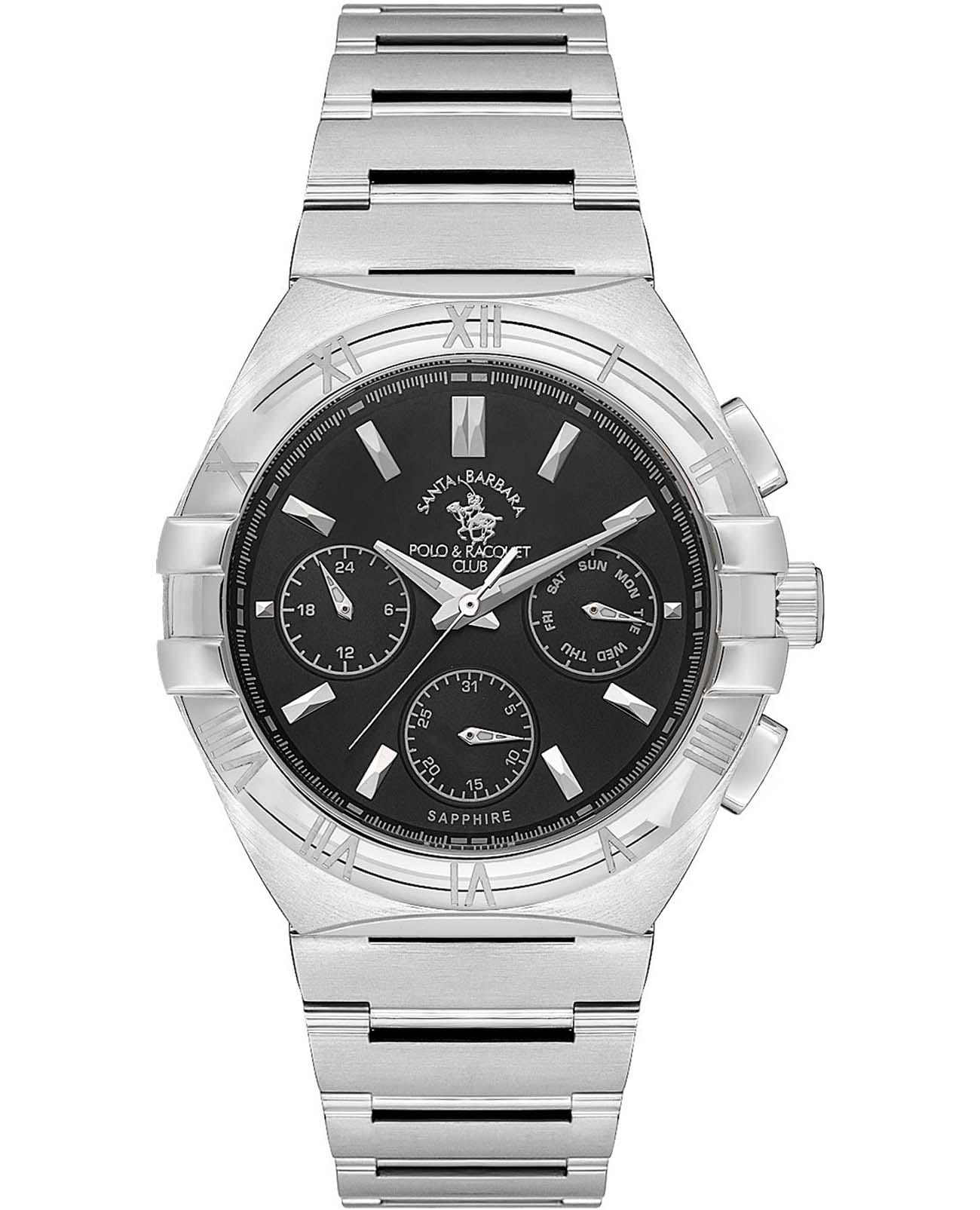 Santa Barbara Polo & Racquet Club Luxury SB.1.10548-1 — стильные мужские часы, сочетающие спортивную динамику и функциональность. Крупный корпус выполнен из нержавеющей стали 316L и гармонично дополнен стальным браслетом на застёжке-бабочке с кнопкамиЗастёжка "бабочка"Такой вид застёжки дополняется предохранителями, помогающими избежать случайного раскрытия браслета. Обладают изящным исполнением. . БезельБезельВнешний ободок, закрепляющий стекло. В спортивных часах так называется поворотное кольцо с делениями на циферблате, выполняет роль таймера – замеряет отрезки времени на шкале. Неподвижный безель – элемент декора. Однонаправленно вращающийся безель на дайверских часах позволяет фиксировать моменты погружения и выныривания на поверхность. украшен римскими цифрами. Циферблат с акцентными метками и стрелками с люминесцентным покрытиемЛюминесцентное покрытиеПозволяет считывать показания времени в темноте. Производители наносят на стрелки, часовые индексы, безель или поверхность циферблата светонакопительный состав, дающий холодное свечение. оформлен в многослойной структуре и оснащён вспомогательными индикаторами, включая 24-часовой формат, дату и день недели, что делает модель более практичной. Минеральное стеклоМинеральное стеклоМинеральное стекло представляет собой искусственно выращенный минерал кварца. Такое стекло отличается особой устойчивостью к повреждениям и царапинам. Уступает по некоторым качествам сапфировому стеклу. с сапфировым покрытием защищает циферблат от царапин, а кварцевый механизм обеспечивает высокую точность. Благодаря своей универсальной эстетике эти часы уместны и в деловой среде, и в повседневном образе.