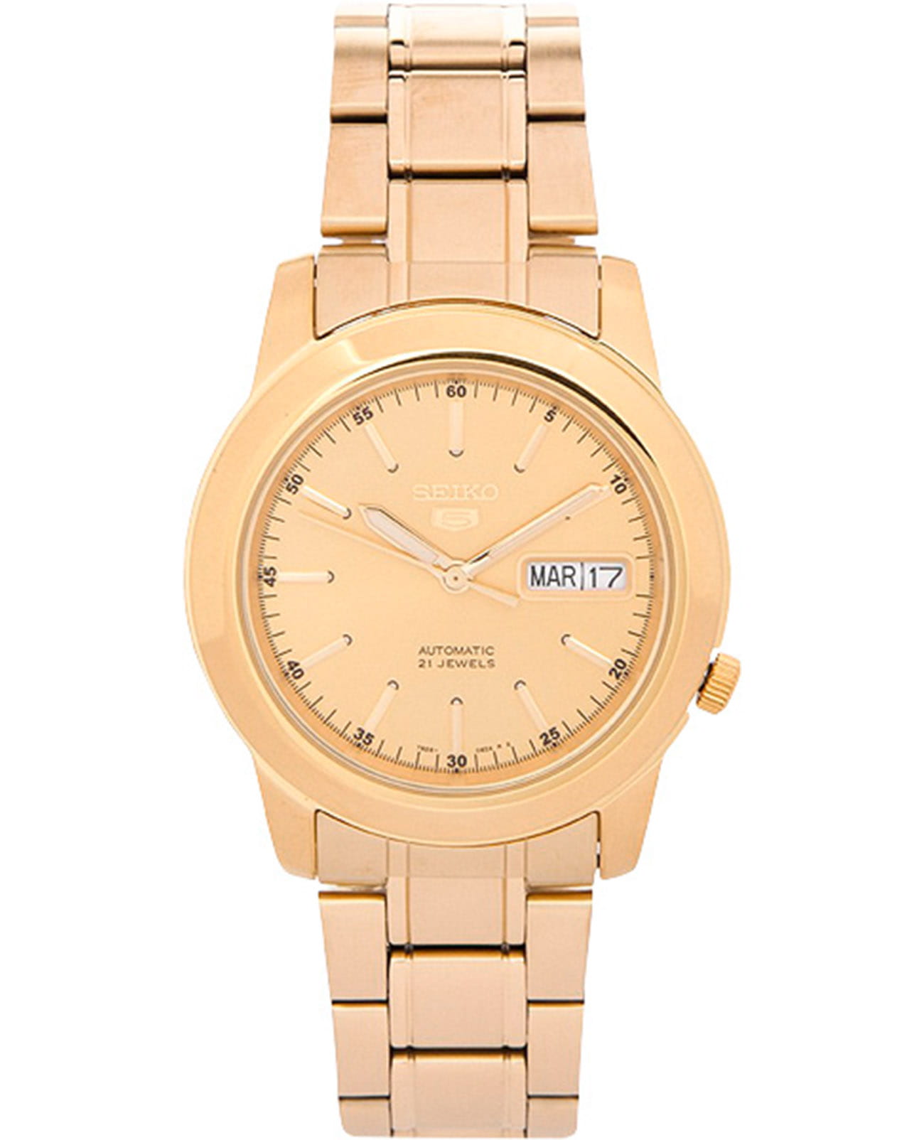 Мужские механические часы с автоподзаводом Seiko SNKE56K1 из коллекции Seiko 5 Regular — японская надёжность с золотистым акцентом. Корпус из стали с PVD-покрытиемPVDУльтратонкое покрытие наносится в технике вакуумного напыления, сочетает в себе нитрид титана особой прочности со слоем золота или оксида хрома. Несёт в себе декоративную или защитную функцию., диаметром 38 мм. Циферблат — золотистый с крупными индексами и стрелками, окошками дня недели и даты. Стекло — минеральноеМинеральное стеклоМинеральное стекло представляет собой искусственно выращенный минерал кварца. Такое стекло отличается особой устойчивостью к повреждениям и царапинам. Уступает по некоторым качествам сапфировому стеклу. Hardlex повышенной прочности. Механизм — японский калибр 7S26 (21 камень, запас хода 40 ч), антимагнитный. Задняя крышка — прозрачная. Браслет — стальной с PVD-покрытиемPVDУльтратонкое покрытие наносится в технике вакуумного напыления, сочетает в себе нитрид титана особой прочности со слоем золота или оксида хрома. Несёт в себе декоративную или защитную функцию. на раскладной застёжкеРаскладная застёжкаТакой тип застёжки используется только на браслетах из металла. Она никогда не раскрывается полностью, происходит разделение на 2 и более частей. Раскладывающая застёжка снизит вероятность потери часов к минимуму. с системой блокировки. Водонепроницаемость 30 м. Идеальный выбор для тех, кто ценит японское качество и классический повседневный стиль.