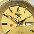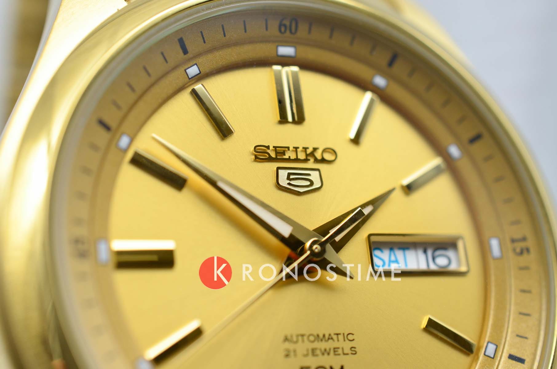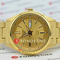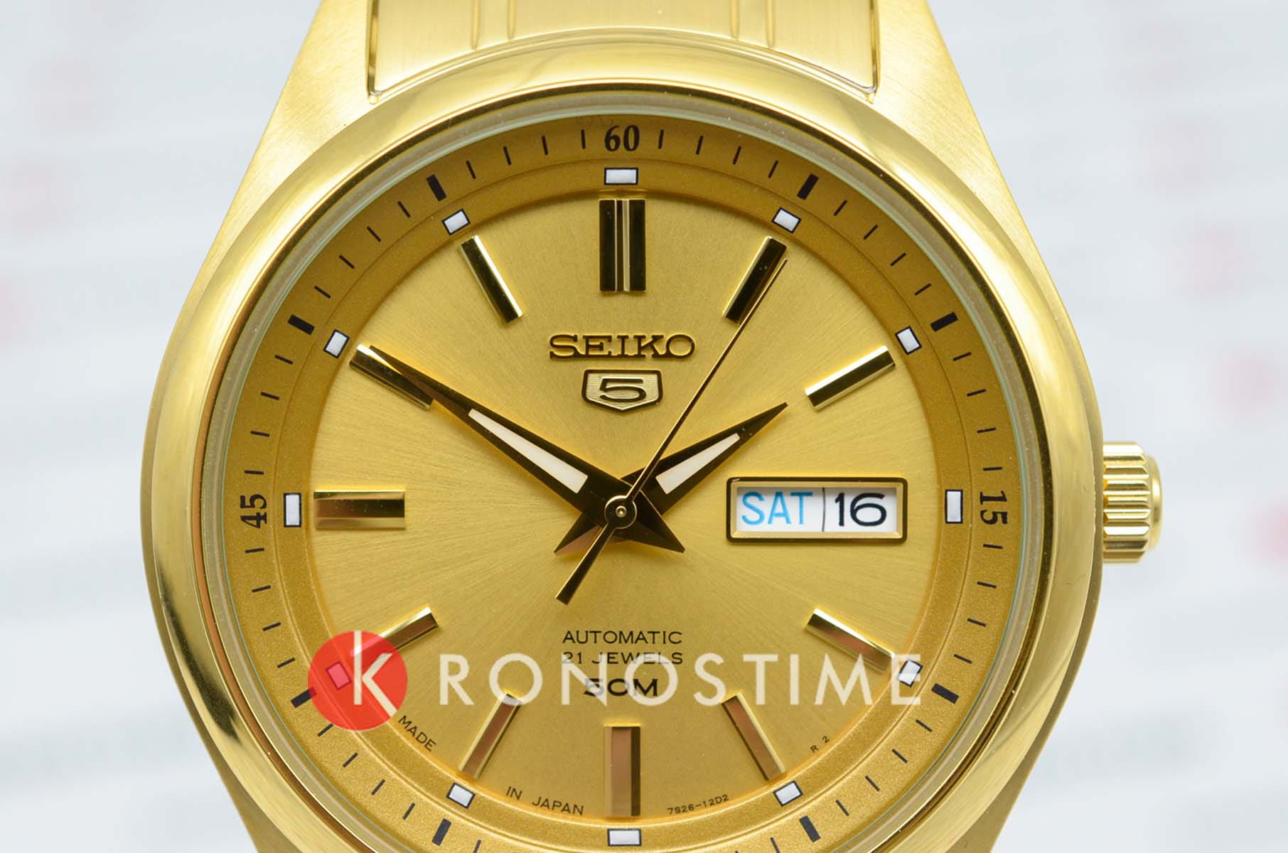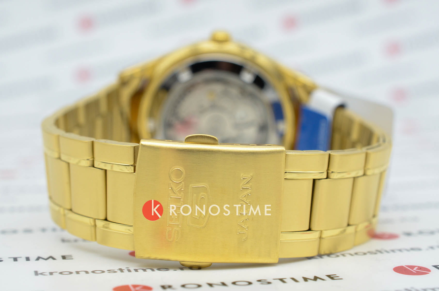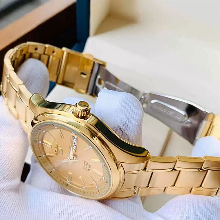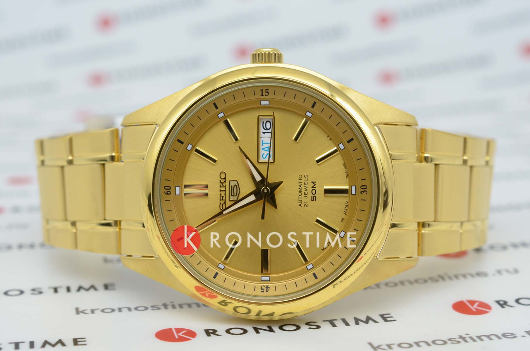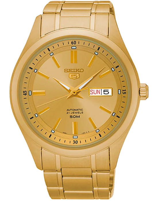 Seiko 5 SNKN96J1 — мужская автоматическая модель, выполненная в эффектном золотистом оформлении. Корпус диаметром 42 мм и браслет изготовлены из нержавеющей стали с прочным IPIP-покрытиеМетод ионного напыления. Демонстрирует повышенную устойчивость к истиранию, окислению и химическим веществам. Под воздействием высокого давления и температуры около 1500°C молекулы металла надёжно соединяются с частицами корпуса часов.-покрытием золотого цвета, придающим часам выразительный характер. Защитную функцию выполняет минеральное стеклоМинеральное стеклоМинеральное стекло представляет собой искусственно выращенный минерал кварца. Такое стекло отличается особой устойчивостью к повреждениям и царапинам. Уступает по некоторым качествам сапфировому стеклу. Hardlex, устойчивое к повседневным повреждениям, а прозрачная задняя крышка позволяет наблюдать за работой механизма. В основе модели лежит автоматический калибр 7S26 с функциями часов, минут, секунд, даты и дня недели. Водозащита составляет 50 м, достаточную для защиты от брызг и дождя. Золотистый циферблат оформлен с аккуратными индексами и стрелками, покрытыми люминесцентным покрытиемЛюминесцентное покрытиеПозволяет считывать показания времени в темноте. Производители наносят на стрелки, часовые индексы, безель или поверхность циферблата светонакопительный состав, дающий холодное свечение. для удобства в условиях слабого освещения. Браслет дополнен раскладной застёжкойРаскладная застёжкаТакой тип застёжки используется только на браслетах из металла. Она никогда не раскрывается полностью, происходит разделение на 2 и более частей. Раскладывающая застёжка снизит вероятность потери часов к минимуму., обеспечивающей надёжную фиксацию и комфорт в носке.
