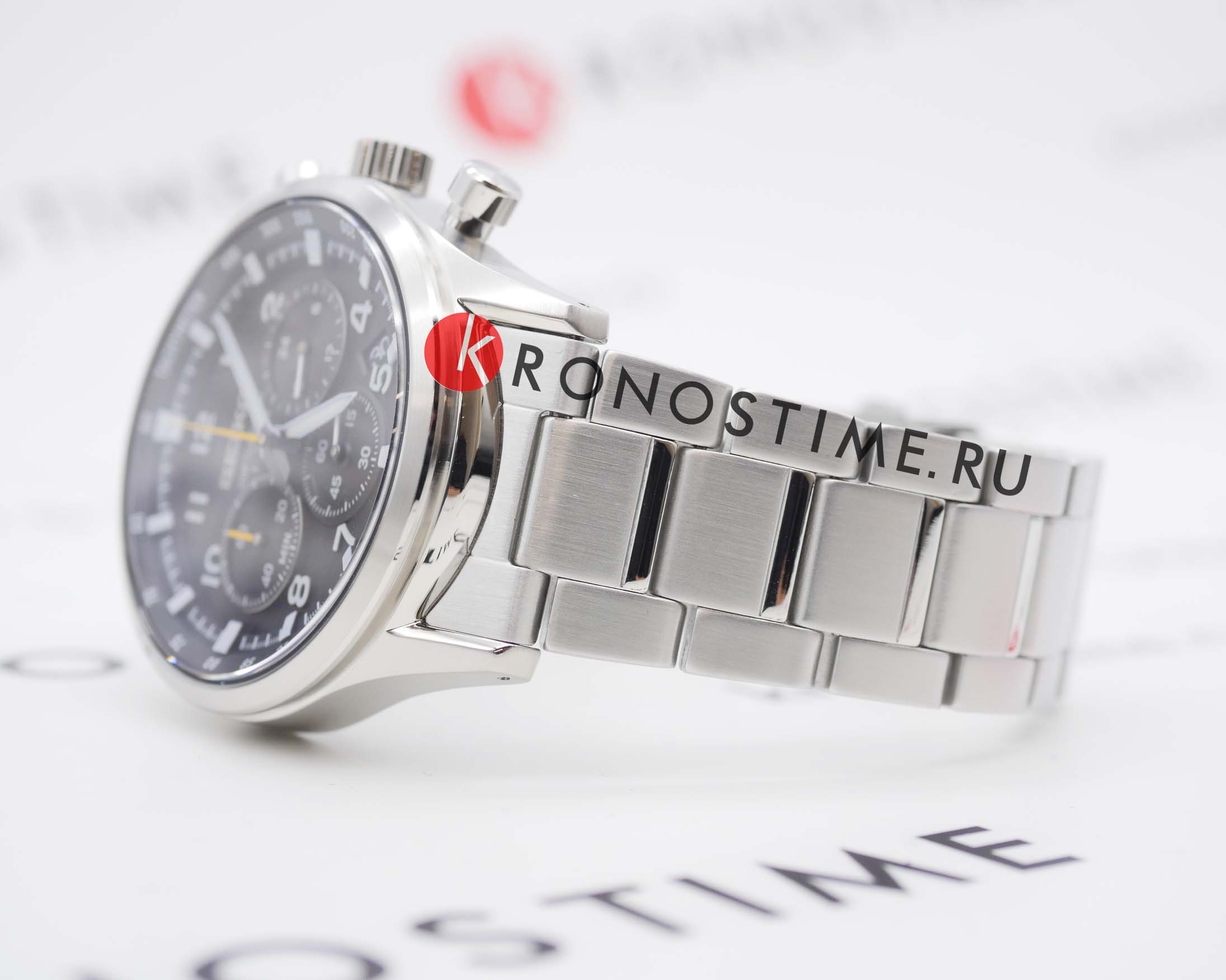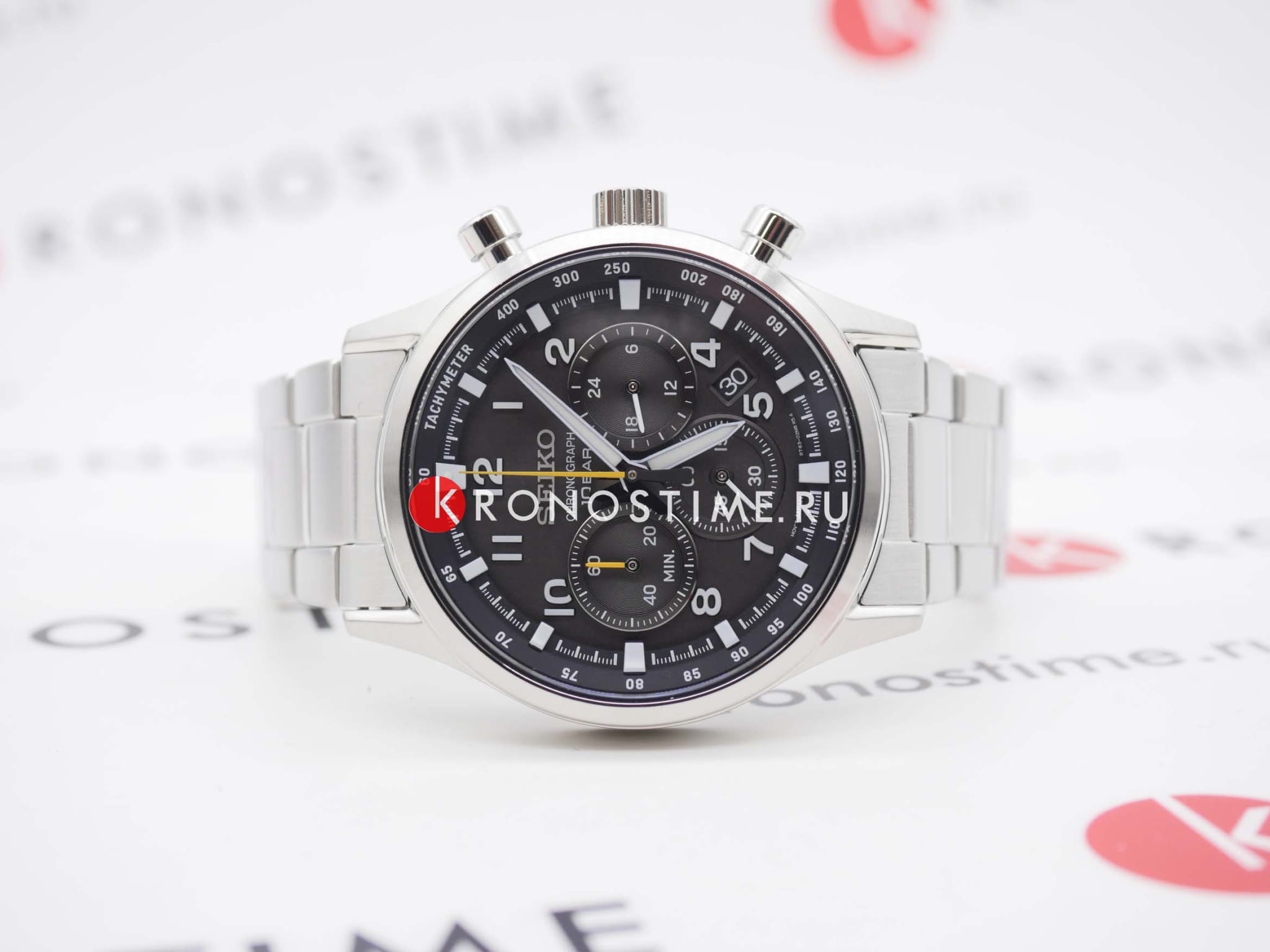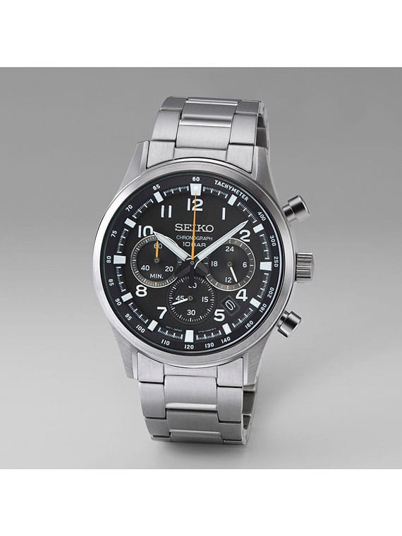 Мужские японские часы Seiko SSB447P1 c хронографомХронографФункция позволяет измерять отрезки времени с особой точностью: часы, минуты, секунды. Верным признаком хронографа является наличие на циферблате 3 дополнительных окошек-счётчиков., кварцевый механизм с высокой точностью. Минеральное стеклоМинеральное стеклоМинеральное стекло представляет собой искусственно выращенный минерал кварца. Такое стекло отличается особой устойчивостью к повреждениям и царапинам. Уступает по некоторым качествам сапфировому стеклу., устойчивое к появлению царапин, обладающее высокой прозрачностью. Класс водозащиты: 100 метров, позволит плавать, нырять и заниматься другими водными видами спорта. Корпус и браслет часов изготовлен из стали. Неподвижный безельБезельВнешний ободок, закрепляющий стекло. В спортивных часах так называется поворотное кольцо с делениями на циферблате, выполняет роль таймера – замеряет отрезки времени на шкале. Неподвижный безель – элемент декора. Однонаправленно вращающийся безель на дайверских часах позволяет фиксировать моменты погружения и выныривания на поверхность. со шкалой тахиметраТахиметрРазмеченная шкала, располагается на ободке или безеле часов. Тахиметр позволяет рассчитать скорость на определённом участке пути, расстояние измеряется в километрах или милях.. Стрелки и метки с люминесцентным покрытиемЛюминесцентное покрытиеПозволяет считывать показания времени в темноте. Производители наносят на стрелки, часовые индексы, безель или поверхность циферблата светонакопительный состав, дающий холодное свечение. LumiBrite. Браслет на раскладной застёжкеРаскладная застёжкаТакой тип застёжки используется только на браслетах из металла. Она никогда не раскрывается полностью, происходит разделение на 2 и более частей. Раскладывающая застёжка снизит вероятность потери часов к минимуму. с кнопками. СекундомерСекундомерСекундоме́р — прибор, способный измерять интервалы времени с точностью до долей секунды.. Окошко даты находится в положении между 4 и 5 часов.