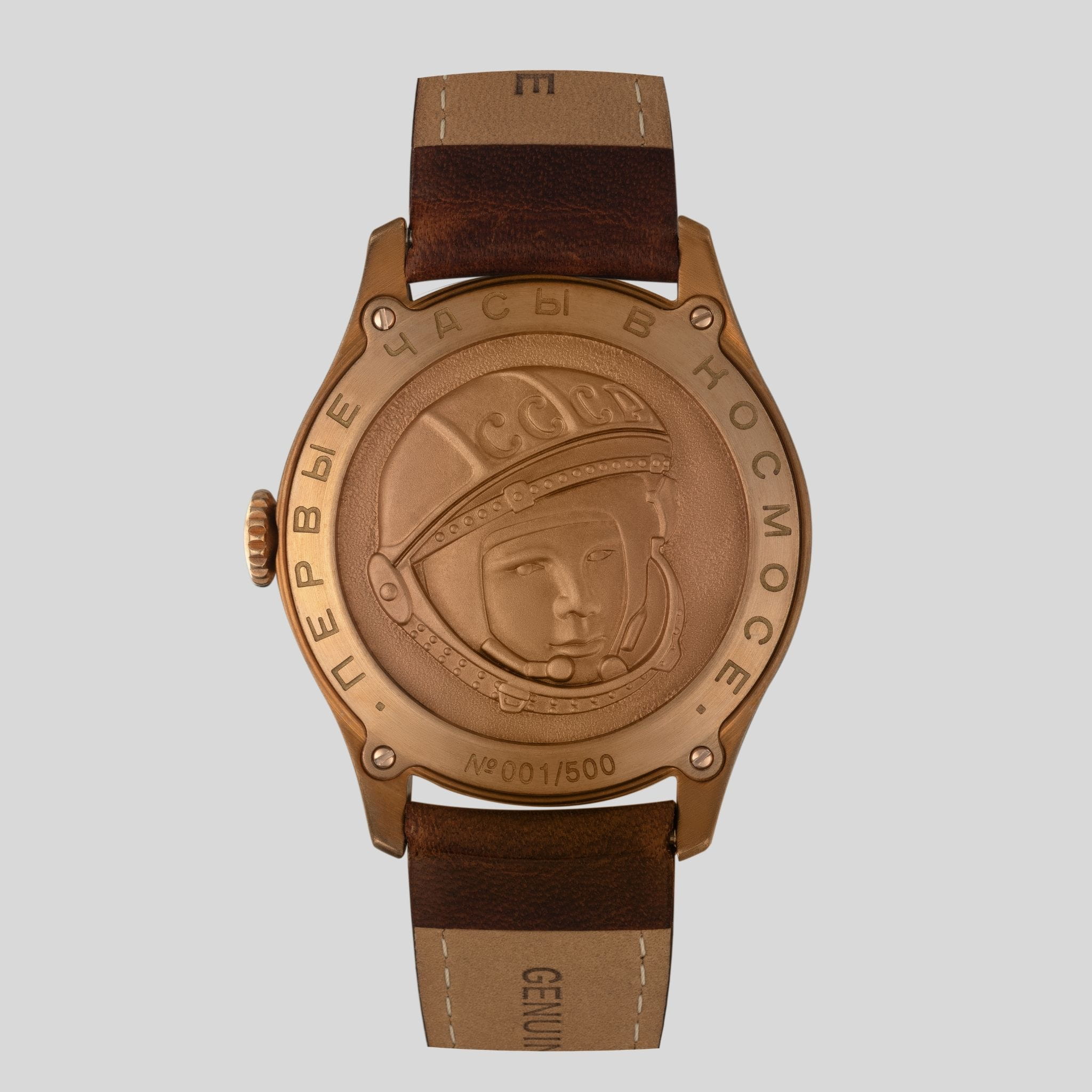 Лимитированные мужские российские механические часы Штурманские Гагарин Наследие 2609/3768202, механический механизм (автоматический калибр) с высокой точностью. Сапфировое стеклоСапфировое стеклоПрочный и надёжный материал из кристалла сапфира синтетического происхождения, характеризующийся особой твёрдостью и устойчивостью к царапинам и повреждениям. устойчивое к мелким механическим повреждениям. Класс водозащиты: 30 метров, позволит защитить корпус от случайных брызг или капель дождя. Корпус часов изготовлен из бронзы. Кожаный ремешок на стандартной застёжке. Стрелки и метки с люминесцентным покрытиемЛюминесцентное покрытиеПозволяет считывать показания времени в темноте. Производители наносят на стрелки, часовые индексы, безель или поверхность циферблата светонакопительный состав, дающий холодное свечение.. Задняя крышка с барельефом Гагарина. Чёткая, читаемая минутная шкала уходит за приделы видимой области циферблата, подчёркивая изящность ободка корпуса. Оцифровка циферблата – отличительная особенность данной модели, её дизайн не изменился с самой первый, гагаринской серии. Заводная головка конической формы с удобной насечкой повторяет дизайн оригинальной модели.
