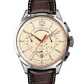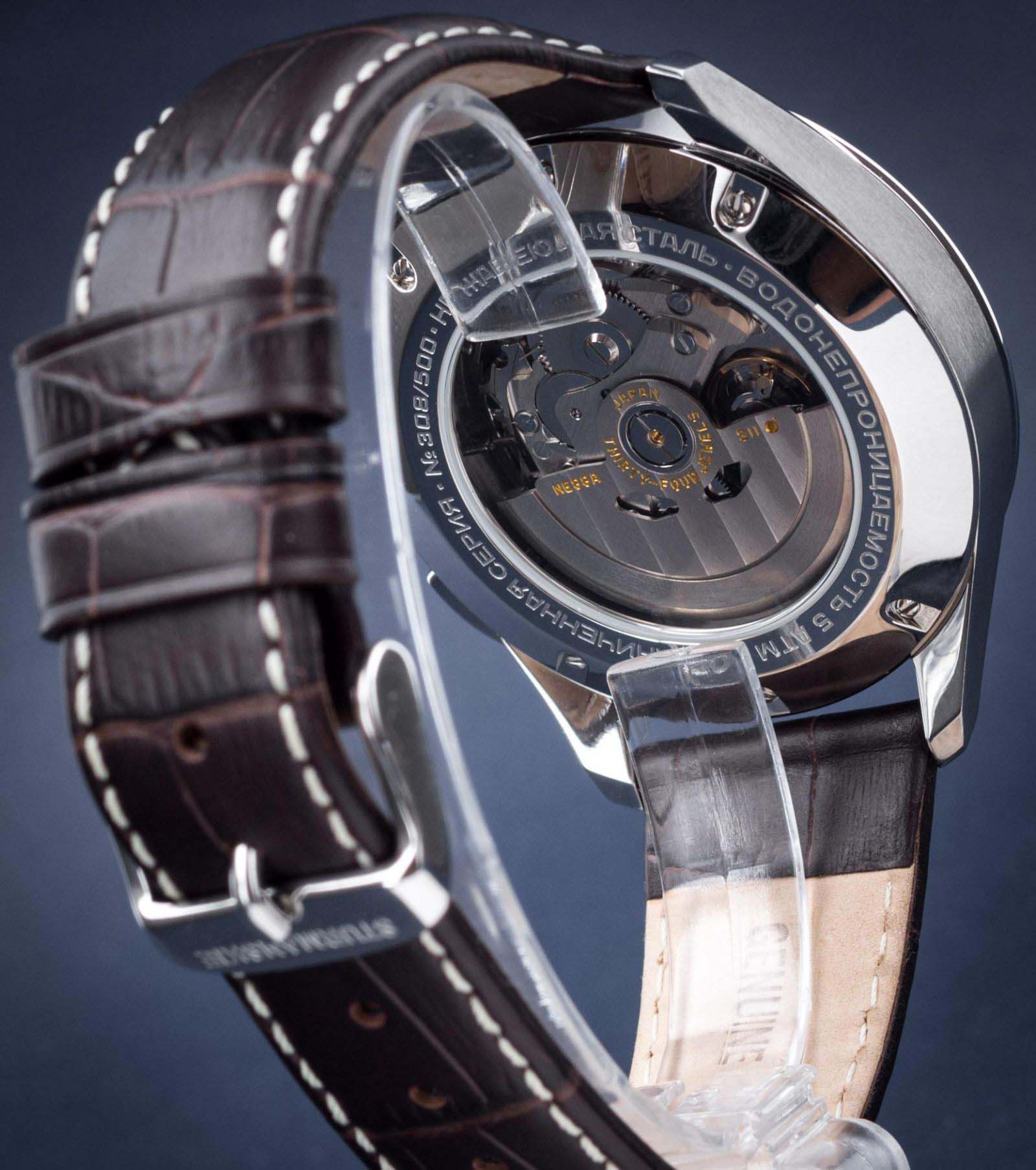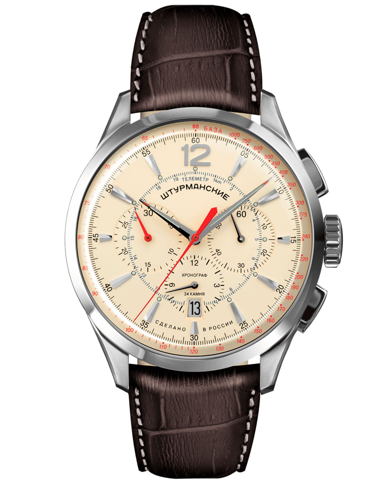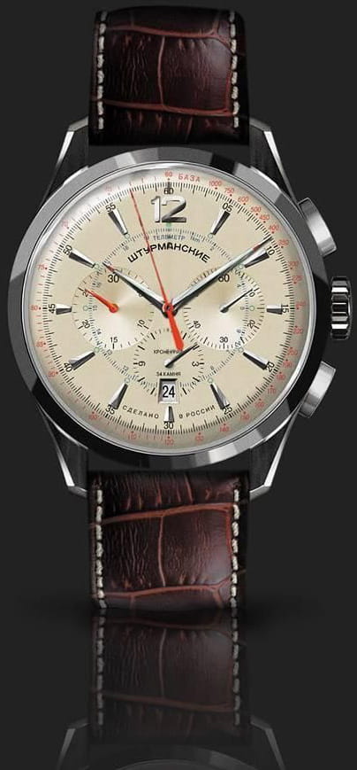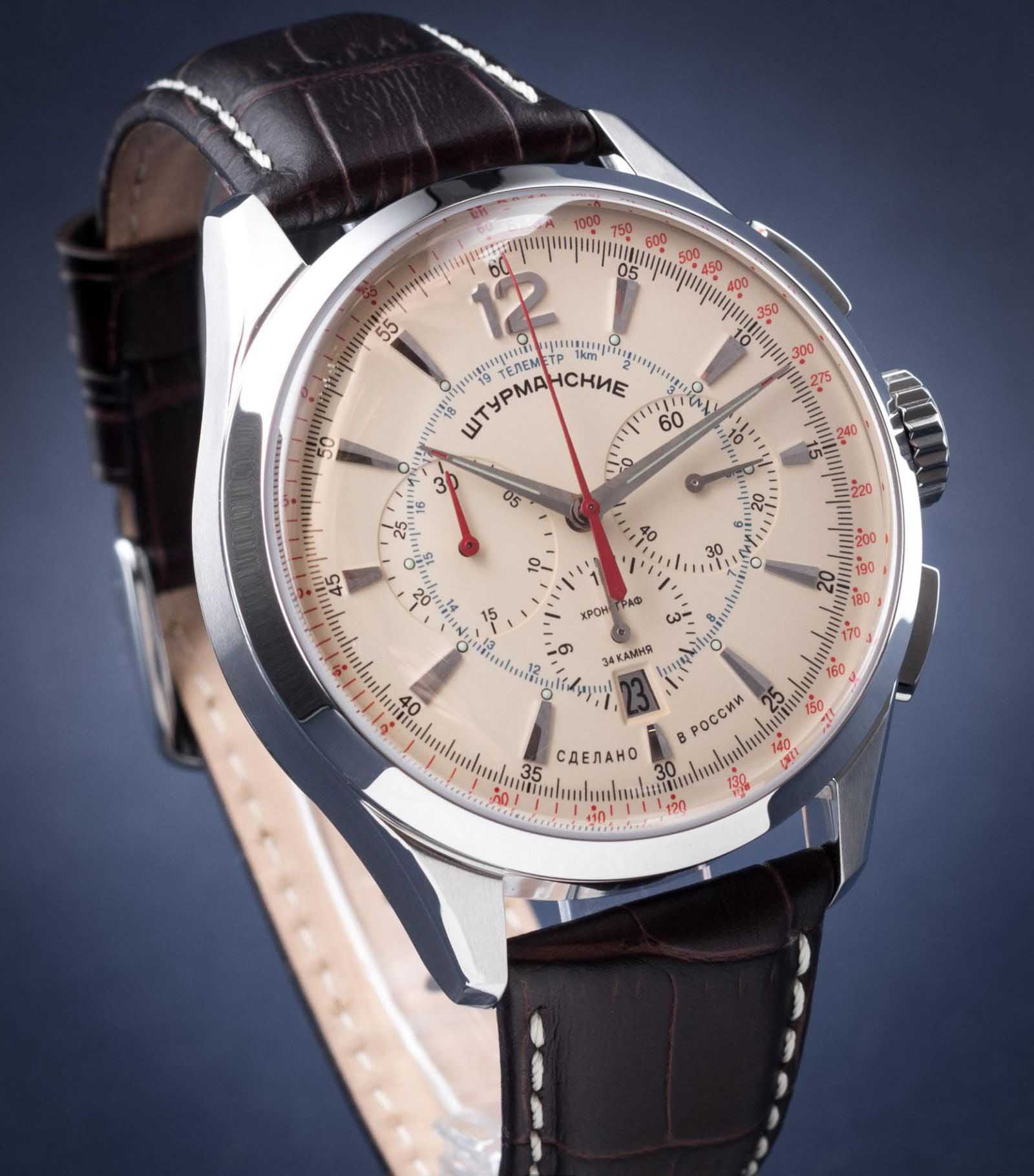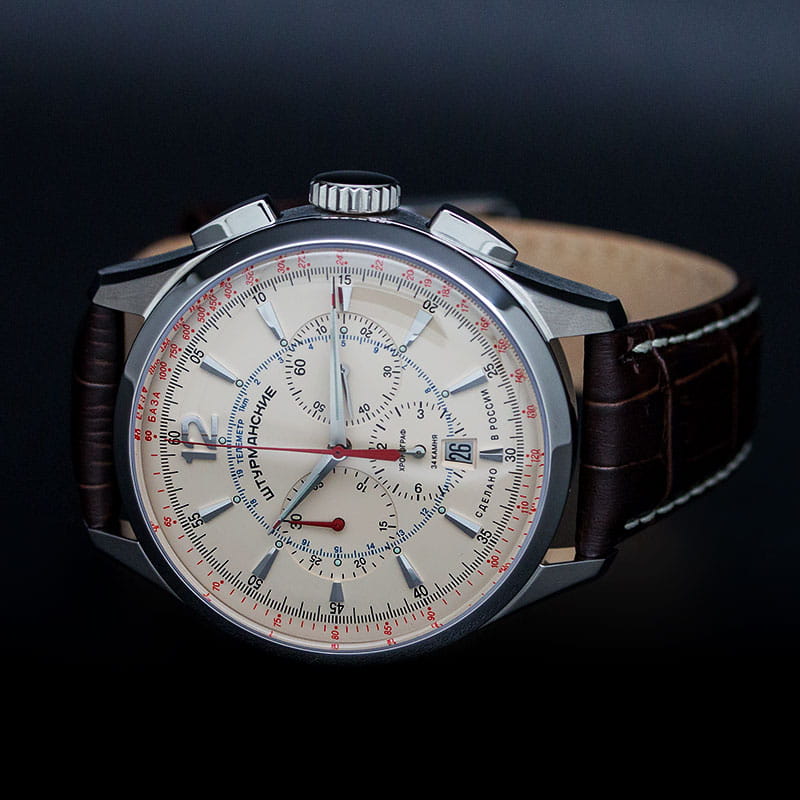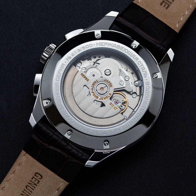 Лимитированные мужские российские механические часы-хронографХронографФункция позволяет измерять отрезки времени с особой точностью: часы, минуты, секунды. Верным признаком хронографа является наличие на циферблате 3 дополнительных окошек-счётчиков. с секундомеромСекундомерСекундоме́р — прибор, способный измерять интервалы времени с точностью до долей секунды. Штурманские Открытый Космос NE88/1855992, механический механизм (автоматический калибр) с высокой точностью. Лимитированная серия - 500 экземпляров. Сапфировое стеклоСапфировое стеклоПрочный и надёжный материал из кристалла сапфира синтетического происхождения, характеризующийся особой твёрдостью и устойчивостью к царапинам и повреждениям. устойчивое к появлению царапин, обладающее высокой прозрачностью. Класс водозащиты: 50 метров, позволит защитить корпус от случайных брызг или капель дождя. Корпус часов изготовлен из стали. Кожаный ремешок на стандартной застёжке. Стрелки и метки с люминесцентным покрытиемЛюминесцентное покрытиеПозволяет считывать показания времени в темноте. Производители наносят на стрелки, часовые индексы, безель или поверхность циферблата светонакопительный состав, дающий холодное свечение.. Стальной корпус надежно защищает от повреждений механический японский калибр Seiko NE88 на 34 камня с запасом хода 42 часа. Подзавод у часов автоматический.