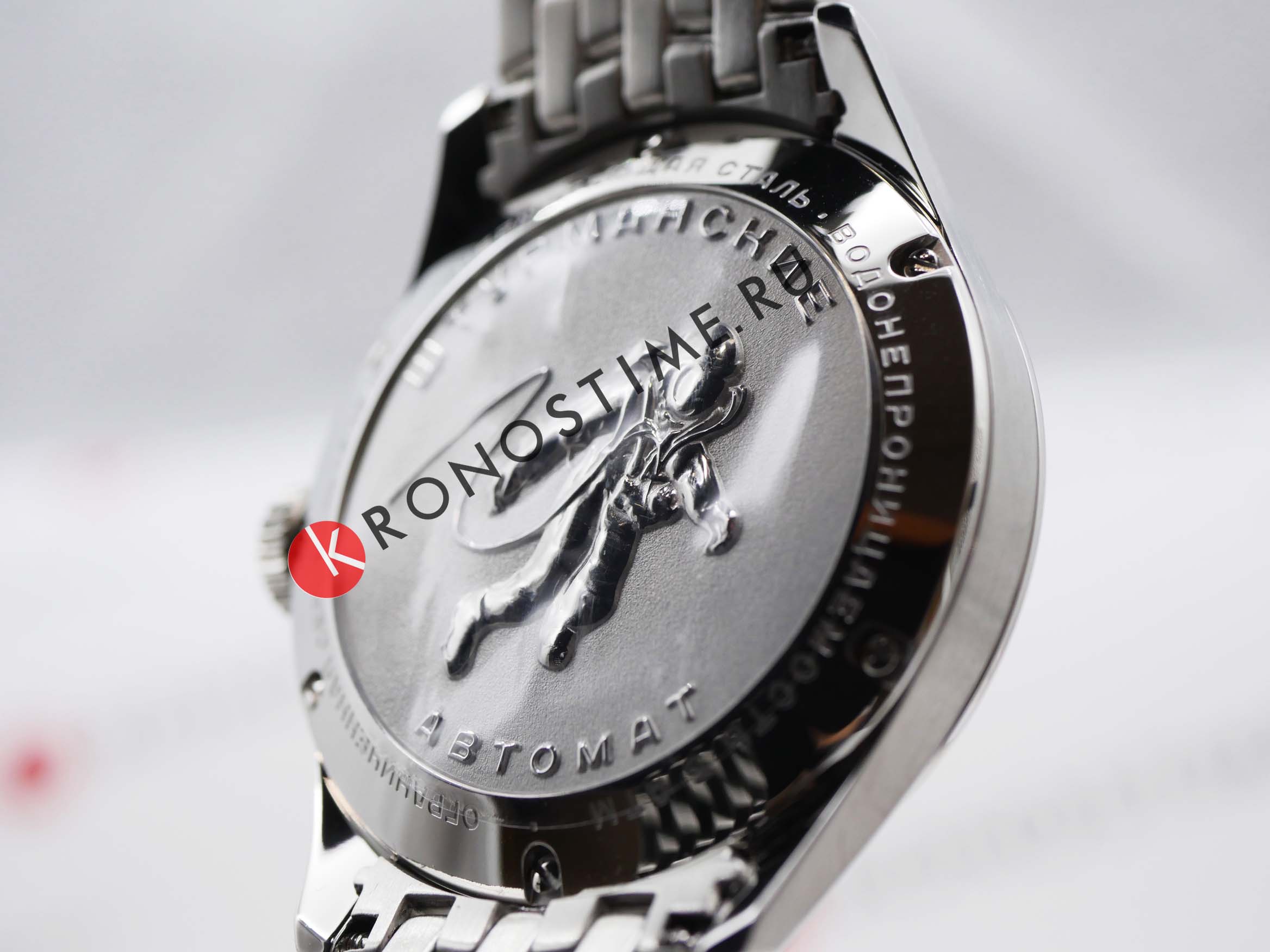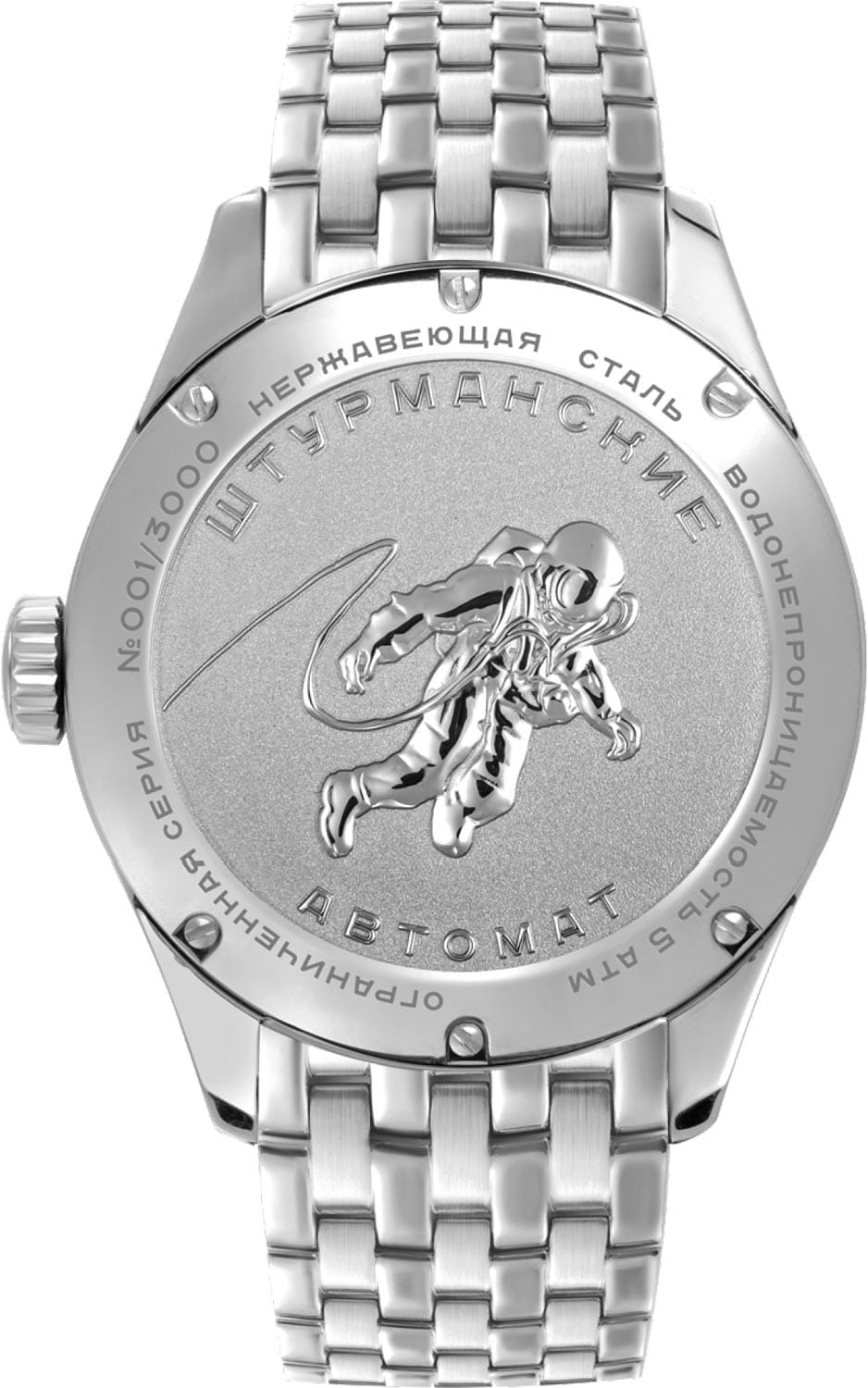 Мужские российские механические часы с минеральным стекломМинеральное стеклоМинеральное стекло представляет собой искусственно выращенный минерал кварца. Такое стекло отличается особой устойчивостью к повреждениям и царапинам. Уступает по некоторым качествам сапфировому стеклу. Штурманские Открытый Космос Day-Date Автомат NH36/1891774B, механический механизм (автоматический калибр) с высокой точностью. Лимитированная серия - 3000 экземпляров. Класс водозащиты: 50 метров, позволит защитить корпус от случайных брызг или капель дождя. Корпус часов изготовлен из стали. Стальной браслет на раскладной застёжкеРаскладная застёжкаТакой тип застёжки используется только на браслетах из металла. Она никогда не раскрывается полностью, происходит разделение на 2 и более частей. Раскладывающая застёжка снизит вероятность потери часов к минимуму.. Окошки дня недели и даты находятся в положении 3 часа. Сзади украшены изображением астронавта в открытом космосе по мотивам картины Алексея Леонова. 12-ти и 24-х часовой формат времени. В механизме 24 камня, частота 21600 полуколебаний в час. Запас хода 41 час. Противоударное устройство оси баланса. Автоматический подзавод пружины. Накладные метки в виде штрихов сложной формы. Дата и день недели в накладной рамке с двойным окошком. Рифленая заводная головка. Индивидуальная нумерация.