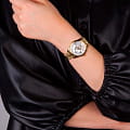 Женские наручные часы Slazenger SL.09.1990.4.04 сочетают в себе элегантный дизайн и практичность современных технологий. Модель обладает круглым корпусом диаметром 34 мм, изготовленным из суперметалла с IP-покрытиемIP-покрытиеМетод ионного напыления. Демонстрирует повышенную устойчивость к истиранию, окислению и химическим веществам. Под воздействием высокого давления и температуры около 1500°C молекулы металла надёжно соединяются с частицами корпуса часов., что обеспечивает высокую устойчивость к внешним воздействиям. Интегрированный браслет на пять звеньев выполнен из того же материала на раскладной застёжкеРаскладная застёжкаТакой тип застёжки используется только на браслетах из металла. Она никогда не раскрывается полностью, происходит разделение на 2 и более частей. Раскладывающая застёжка снизит вероятность потери часов к минимуму., гарантирующей комфортное ношение. Перламутровый циферблат оснащен индексами для лучшей читаемости времени и дополнен функцией отображения даты. Для защиты применяется минеральное стеклоМинеральное стеклоМинеральное стекло представляет собой искусственно выращенный минерал кварца. Такое стекло отличается особой устойчивостью к повреждениям и царапинам. Уступает по некоторым качествам сапфировому стеклу., обеспечивающее прочную защиту от царапин. Часы работают на японском кварцевом механизме, который питается от батарейки и гарантирует точное время без необходимости подзаводки. Водонепроницаемость составляет 3 атмосферы (30 метров), что позволяет использовать их в повседневной жизни, но не рекомендуется для плавания или занятий водными видами спорта.