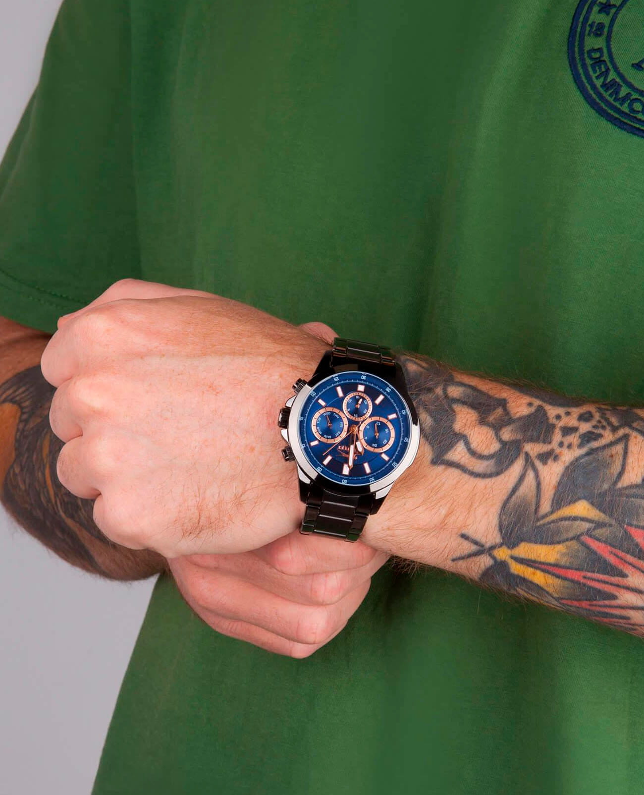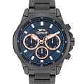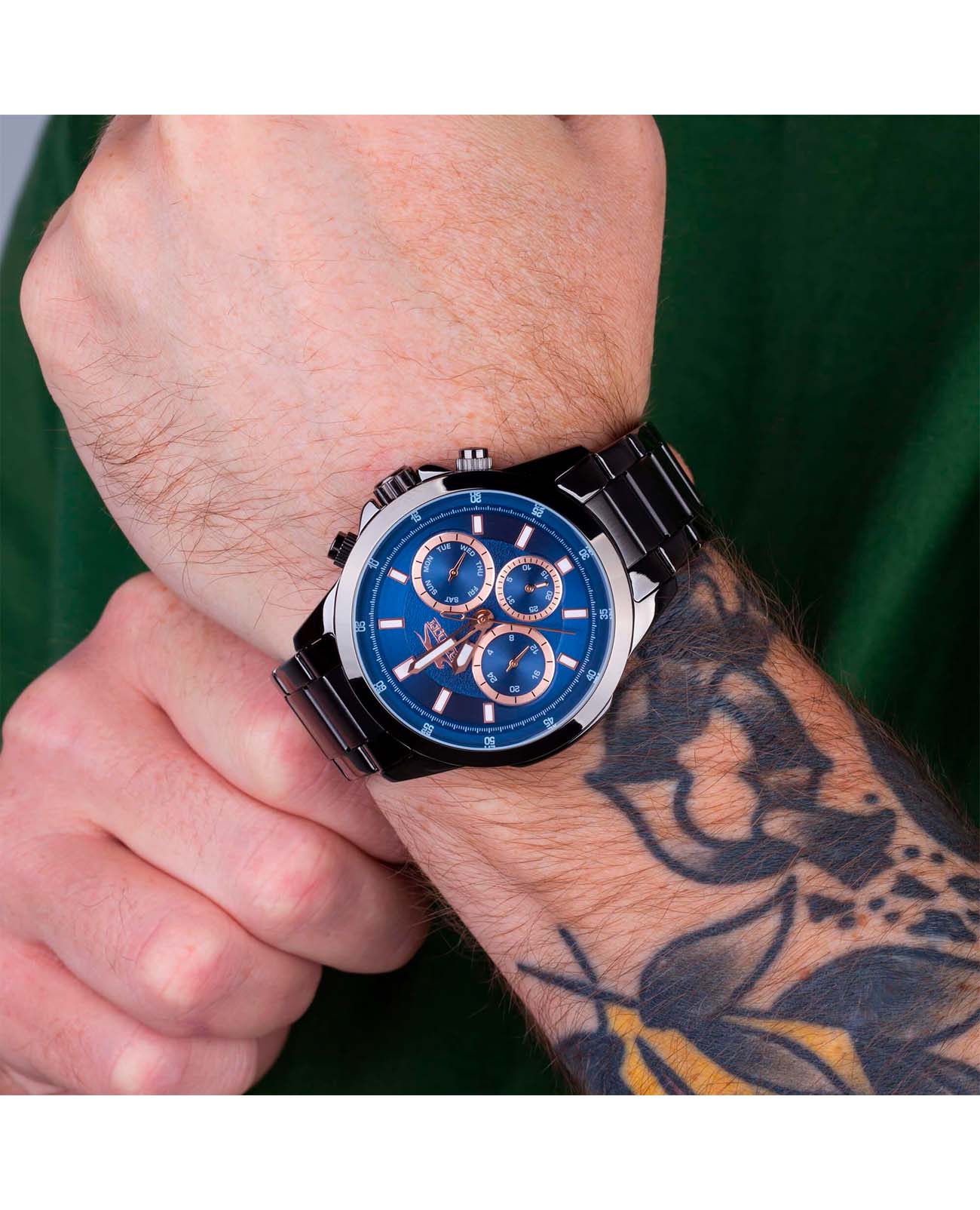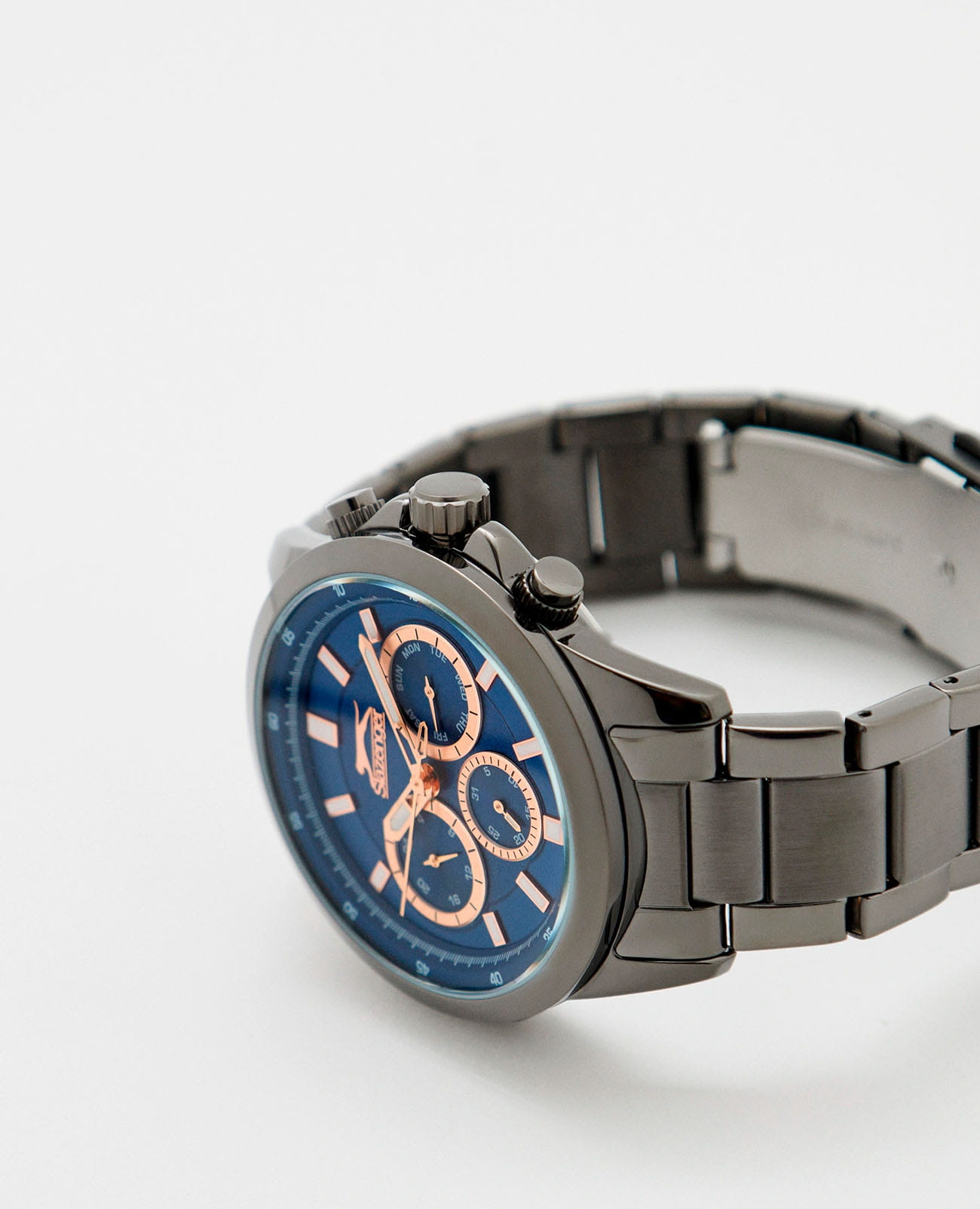 Мужские наручные часы Slazenger SL.09.2011.2.03 сочетают в себе классический дизайн и надежность современных технологий. Модель обладает круглым корпусом диаметром 46 мм, изготовленным из суперметалла с IP-покрытиемIP-покрытиеМетод ионного напыления. Демонстрирует повышенную устойчивость к истиранию, окислению и химическим веществам. Под воздействием высокого давления и температуры около 1500°C молекулы металла надёжно соединяются с частицами корпуса часов., что обеспечивает высокую устойчивость к внешним воздействиям. Браслет выполнен из того же материала с раскладной застежкойРаскладная застёжкаТакой тип застёжки используется только на браслетах из металла. Она никогда не раскрывается полностью, происходит разделение на 2 и более частей. Раскладывающая застёжка снизит вероятность потери часов к минимуму., гарантирующей комфортное ношение и безопасность. Синий циферблат оснащен дополнительными отображениями на малых циферблатах даты, дня недели и текущего времени. Стрелки с люминесцентным покрытиемЛюминесцентное покрытиеПозволяет считывать показания времени в темноте. Производители наносят на стрелки, часовые индексы, безель или поверхность циферблата светонакопительный состав, дающий холодное свечение.. Для защиты применяется минеральное стеклоМинеральное стеклоМинеральное стекло представляет собой искусственно выращенный минерал кварца. Такое стекло отличается особой устойчивостью к повреждениям и царапинам. Уступает по некоторым качествам сапфировому стеклу. с антибликовым эффектом, обеспечивающее прочную защиту от царапин. Часы работают на кварцевом механизме, что гарантирует точное время без необходимости подзаводки. Водонепроницаемость часов достигает 5 атмосфер (50 метров), что позволяет использовать их при контакте с водой, например, во время мытья рук или попадания брызг, однако не рекомендуется для плавания.