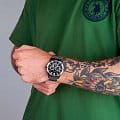 Циферблат черного цвета украшен стрелками с люминесцентным покрытиемЛюминесцентное покрытиеПозволяет считывать показания времени в темноте. Производители наносят на стрелки, часовые индексы, безель или поверхность циферблата светонакопительный состав, дающий холодное свечение., что позволяет легко определять время даже в условиях слабого освещения. Для защиты циферблата используется минеральное стеклоМинеральное стеклоМинеральное стекло представляет собой искусственно выращенный минерал кварца. Такое стекло отличается особой устойчивостью к повреждениям и царапинам. Уступает по некоторым качествам сапфировому стеклу., устойчивое к царапинам и повреждениям.