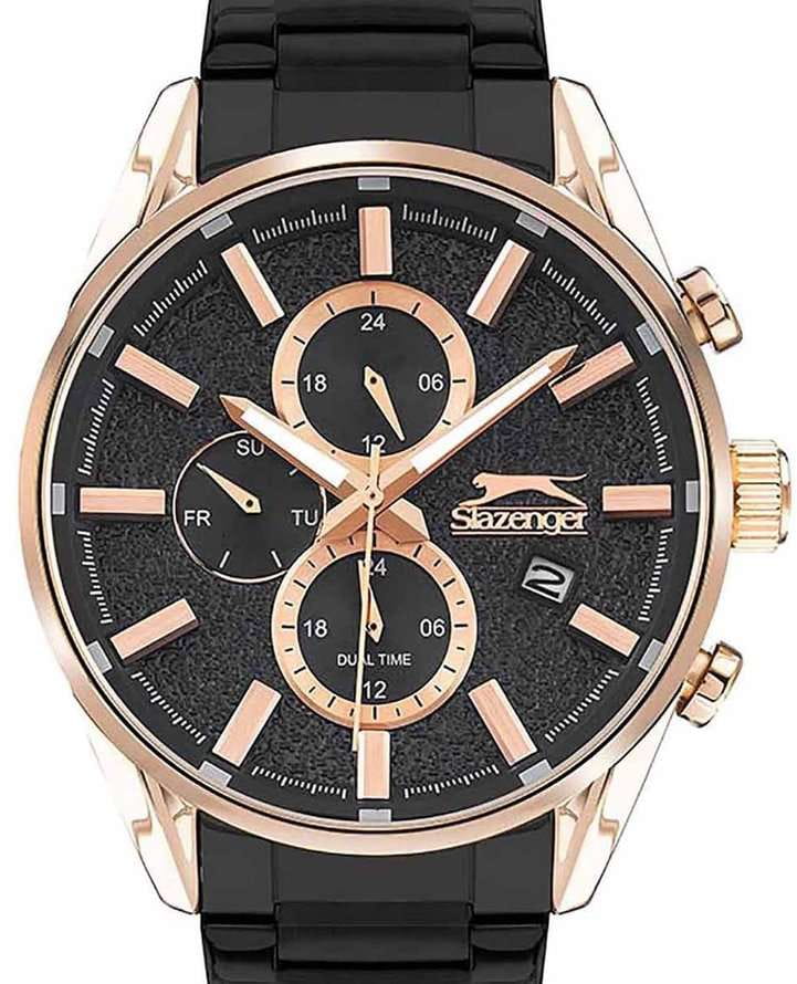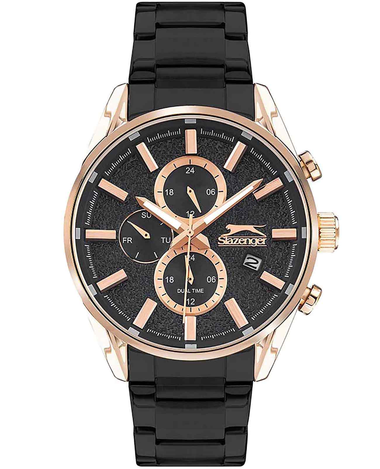 Часы Slazenger SL.09.2059.2.03 представляют собой стильное и функциональное дополнение к вашему образу. Их черный циферблат и корпус с безелемБезельВнешний ободок, закрепляющий стекло. В спортивных часах так называется поворотное кольцо с делениями на циферблате, выполняет роль таймера – замеряет отрезки времени на шкале. Неподвижный безель – элемент декора. Однонаправленно вращающийся безель на дайверских часах позволяет фиксировать моменты погружения и выныривания на поверхность. из суперметалла с IP-покрытиемIP-покрытиеМетод ионного напыления. Демонстрирует повышенную устойчивость к истиранию, окислению и химическим веществам. Под воздействием высокого давления и температуры около 1500°C молекулы металла надёжно соединяются с частицами корпуса часов. создают элегантный и современный вид, который подчеркнет вашу индивидуальность. Эти мужские часы оснащены кварцевым механизмом, обеспечивающим точность хода. Минеральное стеклоМинеральное стеклоМинеральное стекло представляет собой искусственно выращенный минерал кварца. Такое стекло отличается особой устойчивостью к повреждениям и царапинам. Уступает по некоторым качествам сапфировому стеклу. защищает циферблат от царапин, а люминесцентное покрытиеЛюминесцентное покрытиеПозволяет считывать показания времени в темноте. Производители наносят на стрелки, часовые индексы, безель или поверхность циферблата светонакопительный состав, дающий холодное свечение. на стрелках  позволяет легко считывать время даже в темноте. Функциональность часов дополнена вторым часовым поясомВторой часовой поясФункция, позволяющая отображать время двух часовых поясов одновременно., 24-часовым указателем времени, календарем даты в районе 4 часа и дня недели. Черный браслет из суперметалла с IP-покрытиемIP-покрытиеМетод ионного напыления. Демонстрирует повышенную устойчивость к истиранию, окислению и химическим веществам. Под воздействием высокого давления и температуры около 1500°C молекулы металла надёжно соединяются с частицами корпуса часов. и с раскладной застёжкойРаскладная застёжкаТакой тип застёжки используется только на браслетах из металла. Она никогда не раскрывается полностью, происходит разделение на 2 и более частей. Раскладывающая застёжка снизит вероятность потери часов к минимуму. гармонично дополняет общий дизайн. Размер корпуса составляет 44 мм в диаметре и 12 мм в толщину, что делает их удобными для повседневного ношения. А водозащита уровня 5 ATM делает их надежными спутниками даже в условиях повышенной влажности.
