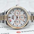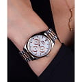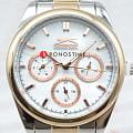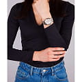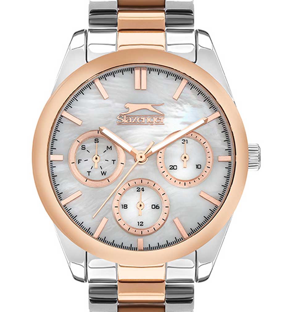 Женские наручные часы Slazenger SL.09.2063.4.04 сочетают в себе классический дизайн и высокое качество исполнения. Модель обладает круглым корпусом диаметром 36 мм, изготовленным из суперметалла, что обеспечивает устойчивость к внешним воздействиям. Браслет выполнен из суперметалла с частичным IP-покрытиемIP-покрытиеМетод ионного напыления. Демонстрирует повышенную устойчивость к истиранию, окислению и химическим веществам. Под воздействием высокого давления и температуры около 1500°C молекулы металла надёжно соединяются с частицами корпуса часов. на раскладной застёжкеРаскладная застёжкаТакой тип застёжки используется только на браслетах из металла. Она никогда не раскрывается полностью, происходит разделение на 2 и более частей. Раскладывающая застёжка снизит вероятность потери часов к минимуму.. Неподвижный безельБезельВнешний ободок, закрепляющий стекло. В спортивных часах так называется поворотное кольцо с делениями на циферблате, выполняет роль таймера – замеряет отрезки времени на шкале. Неподвижный безель – элемент декора. Однонаправленно вращающийся безель на дайверских часах позволяет фиксировать моменты погружения и выныривания на поверхность. из суперметалла с IP-покрытиемIP-покрытиеМетод ионного напыления. Демонстрирует повышенную устойчивость к истиранию, окислению и химическим веществам. Под воздействием высокого давления и температуры около 1500°C молекулы металла надёжно соединяются с частицами корпуса часов. цвета розового золота. Перламутровый циферблат украшен логотипом бренда и метками времени. Имеются дополнительные малые циферблаты для отображения даты, дня недели и текущего времени в 24-часовом формате. Для защиты используется минеральное стеклоМинеральное стеклоМинеральное стекло представляет собой искусственно выращенный минерал кварца. Такое стекло отличается особой устойчивостью к повреждениям и царапинам. Уступает по некоторым качествам сапфировому стеклу., обеспечивающее прочную защиту от царапин. Стрелки и метки имеют люминесцентное покрытиеЛюминесцентное покрытиеПозволяет считывать показания времени в темноте. Производители наносят на стрелки, часовые индексы, безель или поверхность циферблата светонакопительный состав, дающий холодное свечение., что позволяет легко читать время в темноте. Часы работают на японском кварцевом механизме, который обеспечивает точность хода без необходимости подзаводки. Водонепроницаемость часов составляет 3 атмосферы (WR30), что позволяет защитить корпус от случайных брызг или капель дождя.
