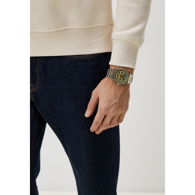 Часы Slazenger SL.09.2106.2.06 представляют собой идеальное сочетание элегантности и функциональности для стильных мужчин. Их серебристый циферблат, защищенный прочным минеральным стекломМинеральное стеклоМинеральное стекло представляет собой искусственно выращенный минерал кварца. Такое стекло отличается особой устойчивостью к повреждениям и царапинам. Уступает по некоторым качествам сапфировому стеклу., обрамлен корпусом из суперметалла диаметром 41 мм, а безельБезельВнешний ободок, закрепляющий стекло. В спортивных часах так называется поворотное кольцо с делениями на циферблате, выполняет роль таймера – замеряет отрезки времени на шкале. Неподвижный безель – элемент декора. Однонаправленно вращающийся безель на дайверских часах позволяет фиксировать моменты погружения и выныривания на поверхность. этих часов из суперметалла с золотистым IP-покрытиемIP-покрытиеМетод ионного напыления. Демонстрирует повышенную устойчивость к истиранию, окислению и химическим веществам. Под воздействием высокого давления и температуры около 1500°C молекулы металла надёжно соединяются с частицами корпуса часов.. Кварцевый механизм гарантирует точность, а водозащита 5 ATM позволяет не волноваться о случайных брызгах. Стальной браслет из суперметалла с частичным золотистым IP-покрытиемIP-покрытиеМетод ионного напыления. Демонстрирует повышенную устойчивость к истиранию, окислению и химическим веществам. Под воздействием высокого давления и температуры около 1500°C молекулы металла надёжно соединяются с частицами корпуса часов. с раскладной застёжкойРаскладная застёжкаТакой тип застёжки используется только на браслетах из металла. Она никогда не раскрывается полностью, происходит разделение на 2 и более частей. Раскладывающая застёжка снизит вероятность потери часов к минимуму., придает часовому изделию современный и изысканный вид. Функции 24-часового указателя времени, а также отображение даты и дня недели обеспечивают дополнительное удобство в повседневной жизни. Люминесцентное покрытиеЛюминесцентное покрытиеПозволяет считывать показания времени в темноте. Производители наносят на стрелки, часовые индексы, безель или поверхность циферблата светонакопительный состав, дающий холодное свечение. на стрелках и метках обеспечивает удобство считывания времени в темное время суток.