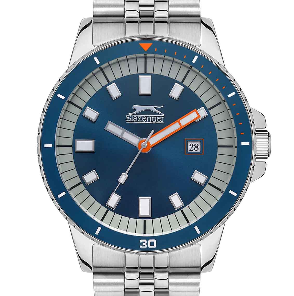 Часы Slazenger SL.09.2135.1.02 воплощают в себе элегантность и практичность, идеально подходящие для современных мужчин. Их синий циферблат, защищенный минеральным стекломМинеральное стеклоМинеральное стекло представляет собой искусственно выращенный минерал кварца. Такое стекло отличается особой устойчивостью к повреждениям и царапинам. Уступает по некоторым качествам сапфировому стеклу., заключен в серебристый корпус диаметром 45 мм, который изготовлен из прочного суперметалла. Неподвижный безельБезельВнешний ободок, закрепляющий стекло. В спортивных часах так называется поворотное кольцо с делениями на циферблате, выполняет роль таймера – замеряет отрезки времени на шкале. Неподвижный безель – элемент декора. Однонаправленно вращающийся безель на дайверских часах позволяет фиксировать моменты погружения и выныривания на поверхность. с IP-покрытиемIP-покрытиеМетод ионного напыления. Демонстрирует повышенную устойчивость к истиранию, окислению и химическим веществам. Под воздействием высокого давления и температуры около 1500°C молекулы металла надёжно соединяются с частицами корпуса часов. синего цвета. Часы оснащены удобным окошком даты и стрелками контрастного цвета. Надежный кварцевый механизм обеспечивает точность, а водозащита 5 ATM делает их устойчивыми к воздействию воды. Стальной браслет из суперметалла имеет раскладную застёжкуРаскладная застёжкаТакой тип застёжки используется только на браслетах из металла. Она никогда не раскрывается полностью, происходит разделение на 2 и более частей. Раскладывающая застёжка снизит вероятность потери часов к минимуму., что подчеркивает современный стиль и позволяет легко снимать часы. Люминесцентное покрытиеЛюминесцентное покрытиеПозволяет считывать показания времени в темноте. Производители наносят на стрелки, часовые индексы, безель или поверхность циферблата светонакопительный состав, дающий холодное свечение. на стрелках и метках обеспечивает отличную видимость в темноте.