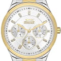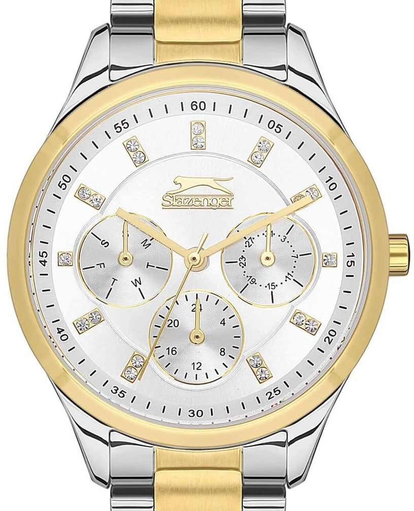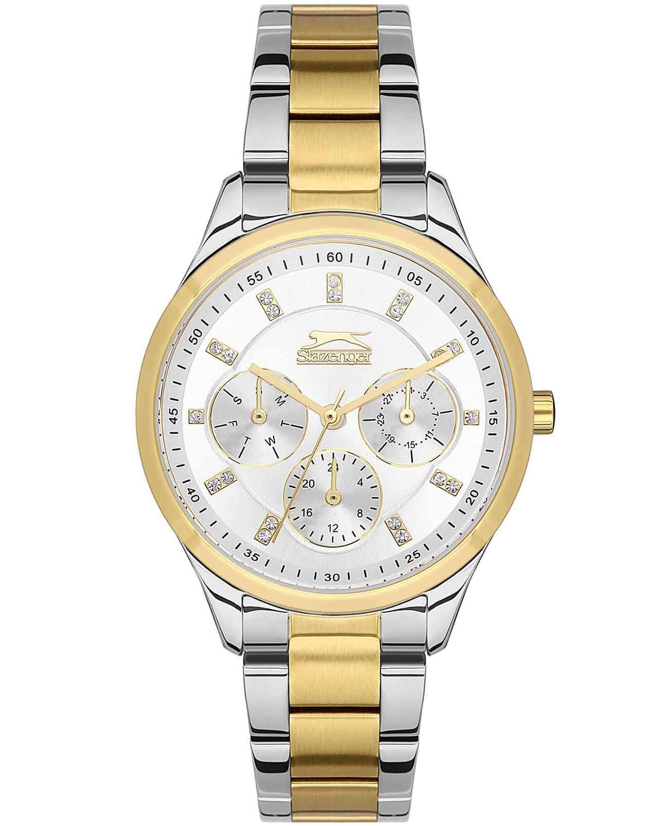 Часы Slazenger SL.09.2151.4.05 — это элегантный аксессуар, который прекрасно дополнит женственный образ. Эти наручные кварцевые часы сочетают в себе стиль и функциональность. Круглый корпус диаметром 35 мм изготовлен из суперметалла, который отличается повышенной прочностью. Неподвижный безельБезельВнешний ободок, закрепляющий стекло. В спортивных часах так называется поворотное кольцо с делениями на циферблате, выполняет роль таймера – замеряет отрезки времени на шкале. Неподвижный безель – элемент декора. Однонаправленно вращающийся безель на дайверских часах позволяет фиксировать моменты погружения и выныривания на поверхность. из суперметалла с золотистым IP-покрытиемIP-покрытиеМетод ионного напыления. Демонстрирует повышенную устойчивость к истиранию, окислению и химическим веществам. Под воздействием высокого давления и температуры около 1500°C молекулы металла надёжно соединяются с частицами корпуса часов.. Белый циферблат выполнен по технологии Sunray, что создает эффект солнечных лучей, и украшен фианитами, придающими часам особую изысканность. На циферблате расположены метки в виде штрихов и точек, а также логотип бренда. Время отображается в 12- и 24-часовом формате, а также предусмотрены отдельные индикаторы для дня недели и числа. Минеральное стеклоМинеральное стеклоМинеральное стекло представляет собой искусственно выращенный минерал кварца. Такое стекло отличается особой устойчивостью к повреждениям и царапинам. Уступает по некоторым качествам сапфировому стеклу. обеспечивает надежную защиту от царапин. Водозащита уровня 30WR позволяет защищать часы от случайных попаданий воды. Металлический браслет с частичным золотистым IP-покрытиемIP-покрытиеМетод ионного напыления. Демонстрирует повышенную устойчивость к истиранию, окислению и химическим веществам. Под воздействием высокого давления и температуры около 1500°C молекулы металла надёжно соединяются с частицами корпуса часов. и раскладной застёжкойРаскладная застёжкаТакой тип застёжки используется только на браслетах из металла. Она никогда не раскрывается полностью, происходит разделение на 2 и более частей. Раскладывающая застёжка снизит вероятность потери часов к минимуму. гарантирует комфортное ношение и надежную фиксацию на запястье. Рифленая заводная головка добавляет удобства в управлении настройками. Эти часы станут идеальным выбором для тех, кто ценит сочетание классического дизайна и практичности.